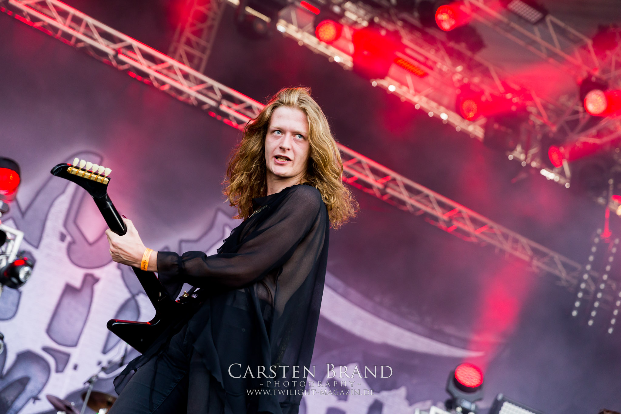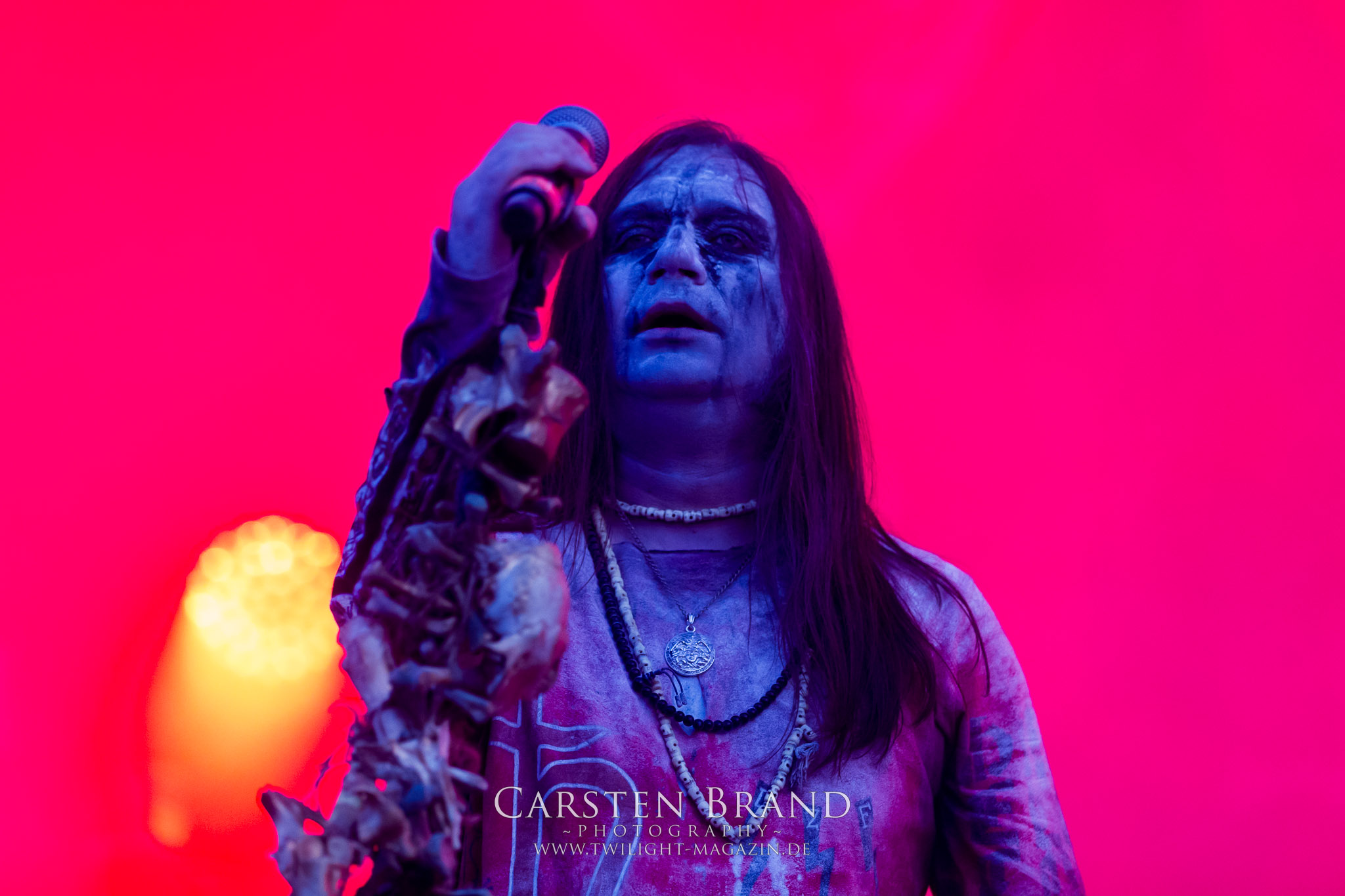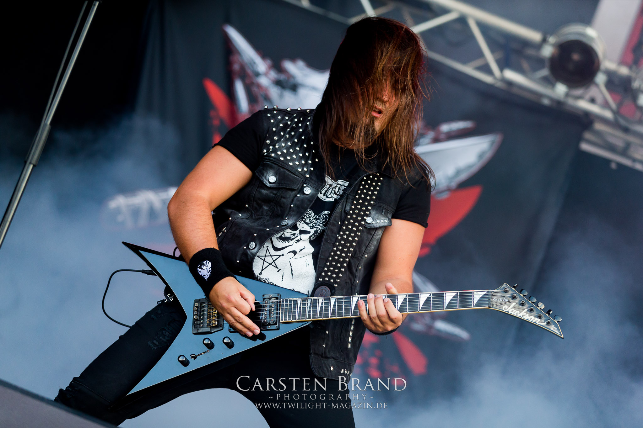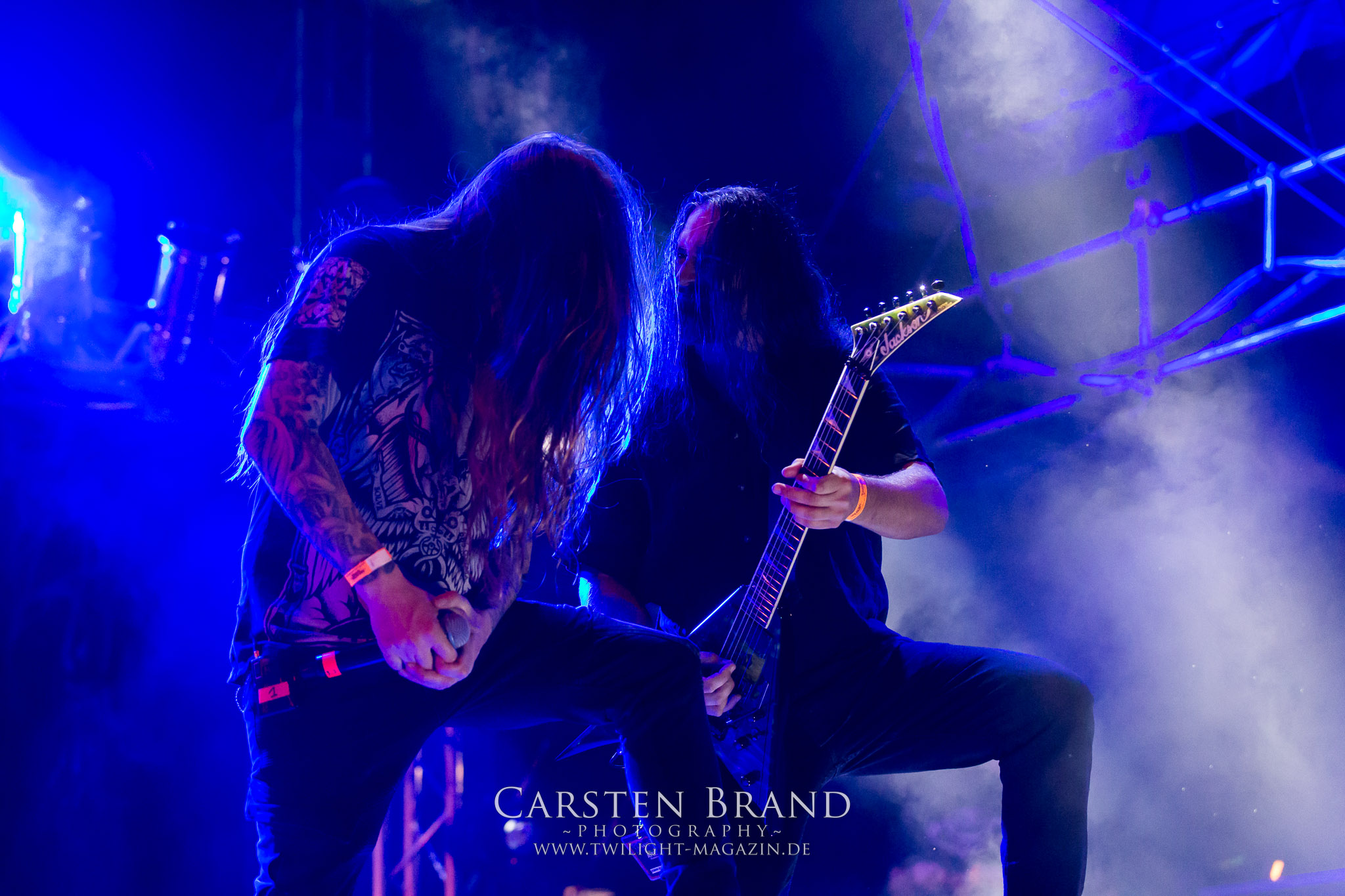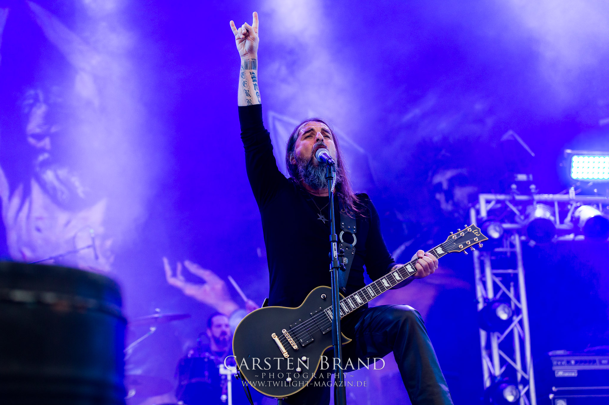 ARKONA aus dem tiefsten Osten sieht man inzwischen gefühlt auf jedem europäischen Festival der härteren Gangart. Vielleicht liegt es an der aufwendigen Bühnenshow mit altertümlichen Instrumenten, Tierfell und Knochenresteverwertung, vielleicht aber auch an der energetischen Sängerin Masha. Auf jeden Fall ist der Bühnenvorplatz immer gut gefüllt und es wird ordentlich mitgesungen, selbst wenn man des Russischen nicht mächtig ist. (MS) NIGHT DEMON machen wie schon vor zwei Jahren eindrucksvoll klar, dass sie als klassische Heavy Metal – Band alles andere als bloßes Beiwerk auf dem Billing sind. Wie schon 2017 funktionieren Night Demon nicht nur musikalisch. Die Band profitiert von ihrer überragenden Live-Qualität und dem starken Song-Material von "Cursed Of The Damned" und "Darkness Remains". Der Maiden-Fan in mir vermisst zwar die "Wasted Years", dafür reißt man mit "Overkill" als Einstieg zu "Dawn Rider" einen Motörhead-Klassiker an. Das muss man auch erstmal so hinbekommen. Night Demon sind motiviert bis in die Haarspitzen und sprudeln über vor metallischer Energie. Selbst am späten Abend ist Frontmann Jarvis Leatherby noch wie ein Duracell-Hase auf dem Gelände anzutreffen.