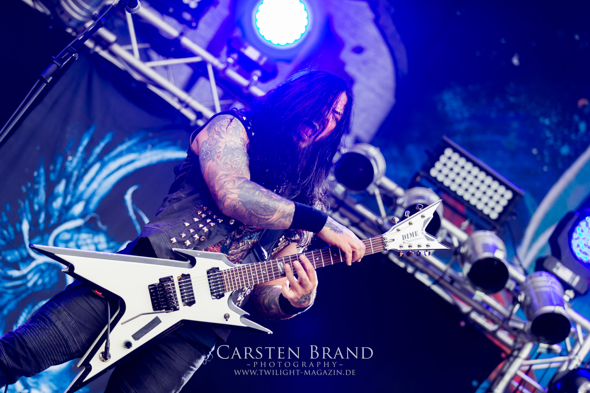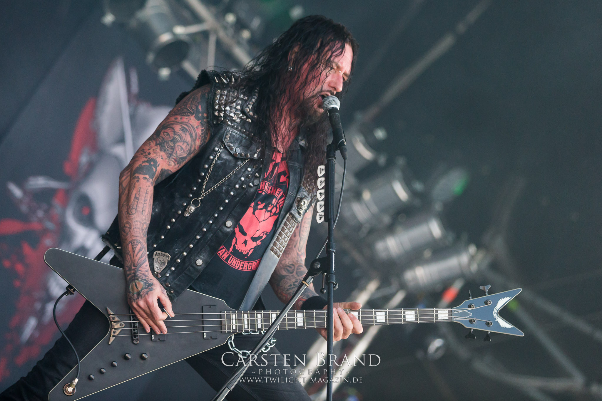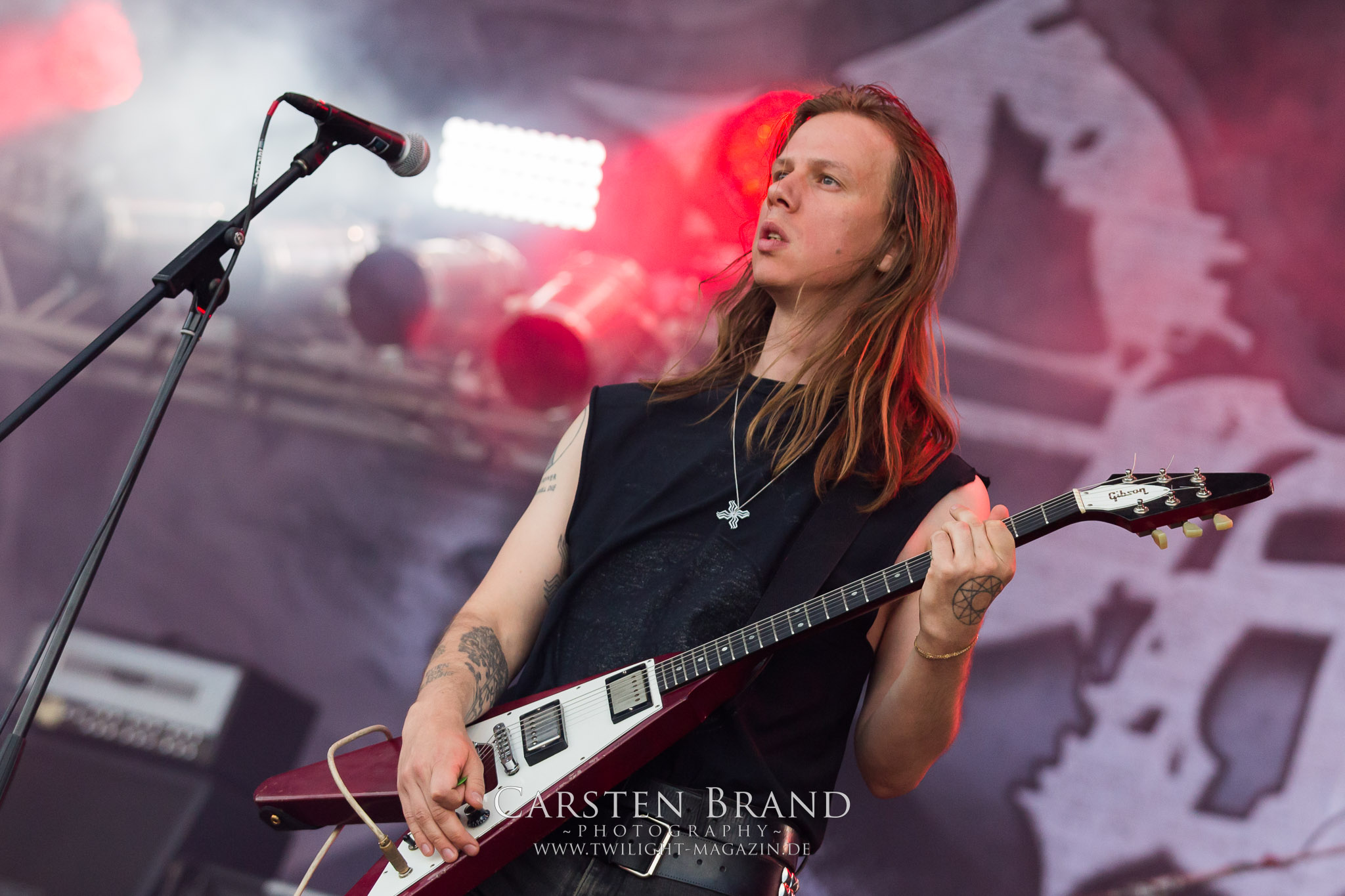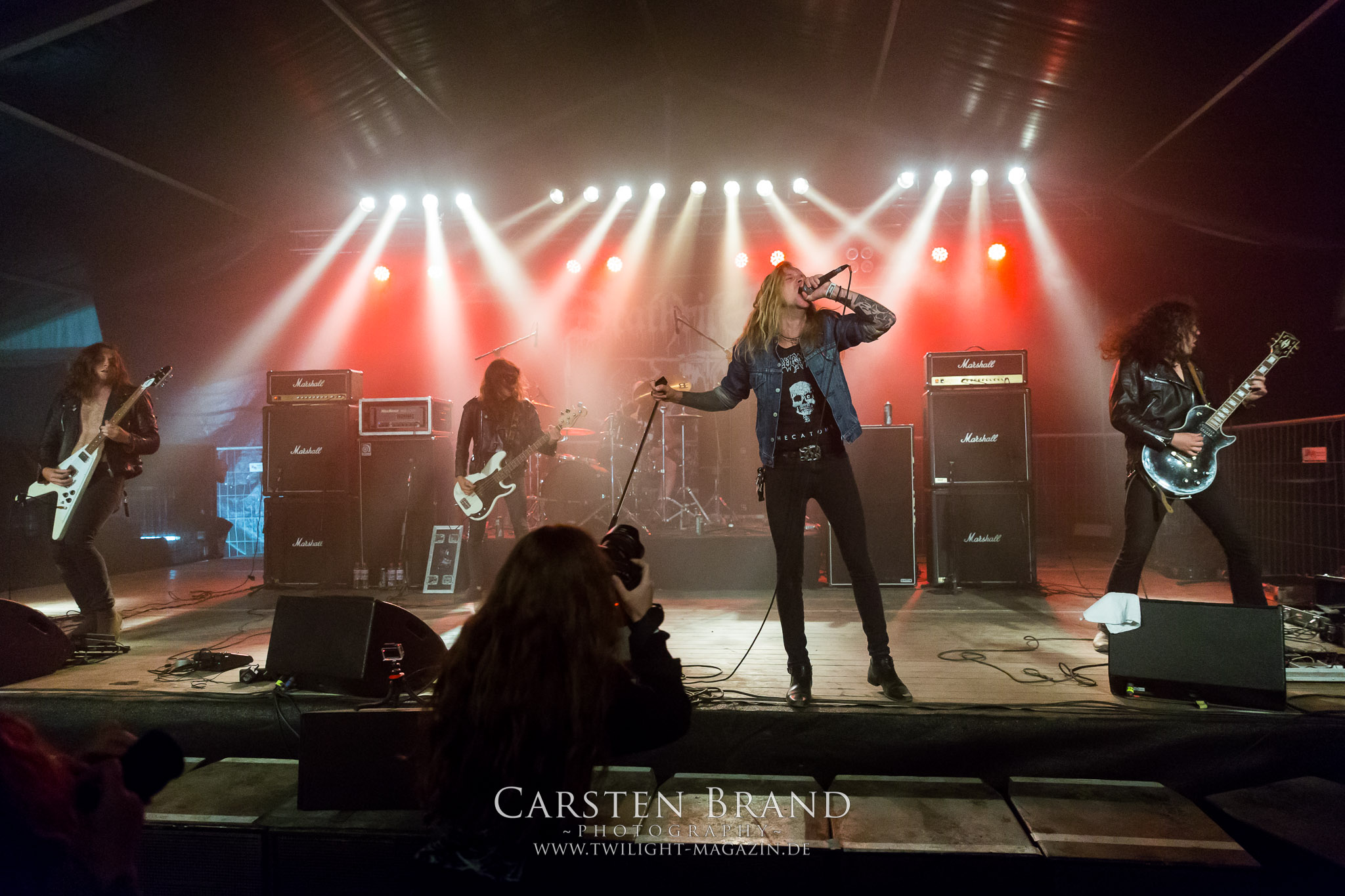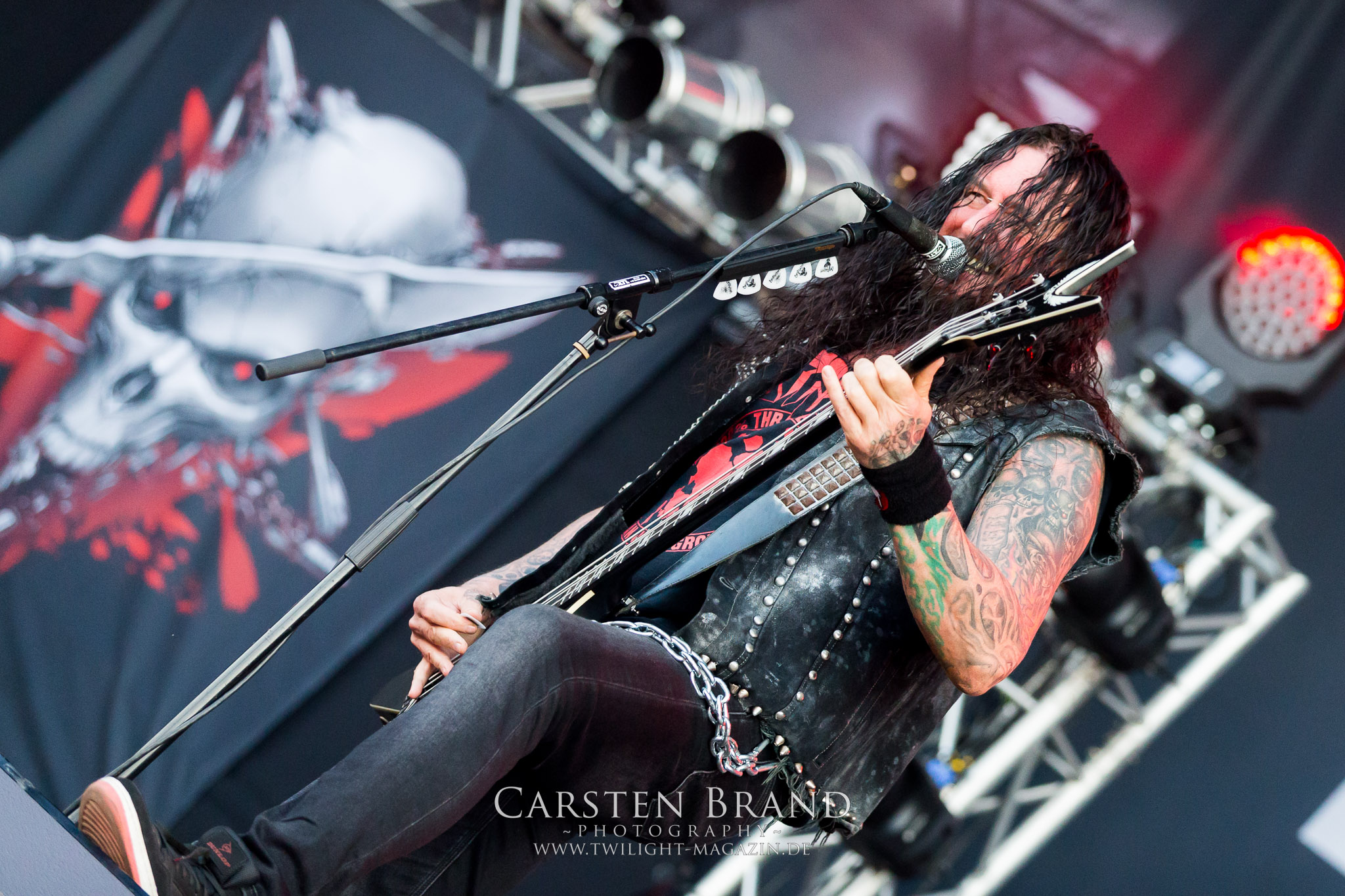 ARKONA aus dem tiefsten Osten sieht man inzwischen gefühlt auf jedem europäischen Festival der härteren Gangart. Vielleicht liegt es an der aufwendigen Bühnenshow mit altertümlichen Instrumenten, Tierfell und Knochenresteverwertung, vielleicht aber auch an der energetischen Sängerin Masha. Auf jeden Fall ist der Bühnenvorplatz immer gut gefüllt und es wird ordentlich mitgesungen, selbst wenn man des Russischen nicht mächtig ist. (MS) NIGHT DEMON machen wie schon vor zwei Jahren eindrucksvoll klar, dass sie als klassische Heavy Metal – Band alles andere als bloßes Beiwerk auf dem Billing sind. Wie schon 2017 funktionieren Night Demon nicht nur musikalisch. Die Band profitiert von ihrer überragenden Live-Qualität und dem starken Song-Material von "Cursed Of The Damned" und "Darkness Remains". Der Maiden-Fan in mir vermisst zwar die "Wasted Years", dafür reißt man mit "Overkill" als Einstieg zu "Dawn Rider" einen Motörhead-Klassiker an. Das muss man auch erstmal so hinbekommen. Night Demon sind motiviert bis in die Haarspitzen und sprudeln über vor metallischer Energie. Selbst am späten Abend ist Frontmann Jarvis Leatherby noch wie ein Duracell-Hase auf dem Gelände anzutreffen.