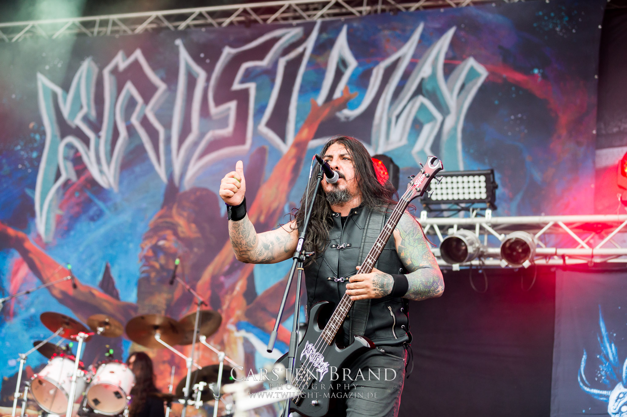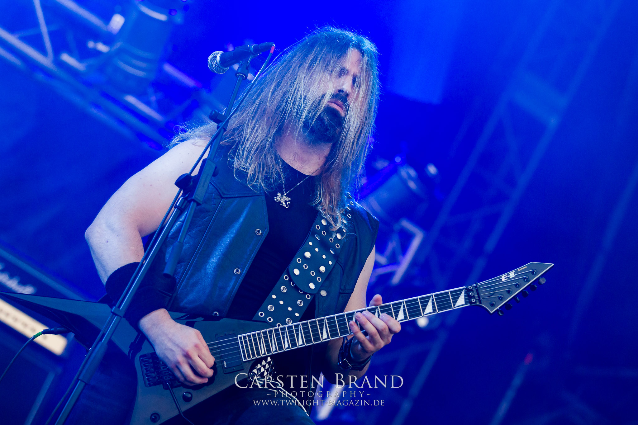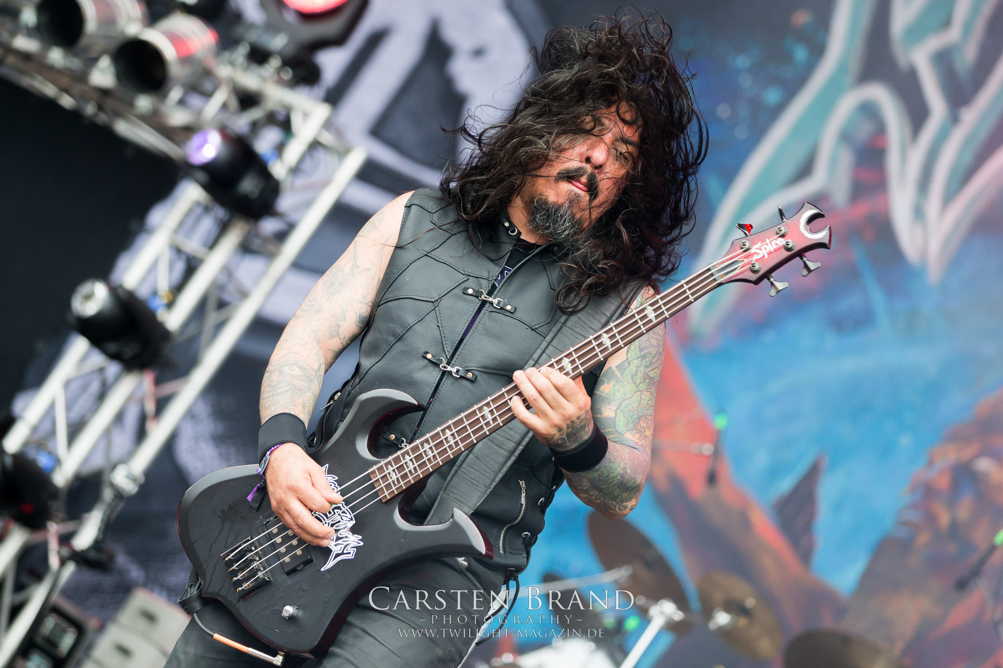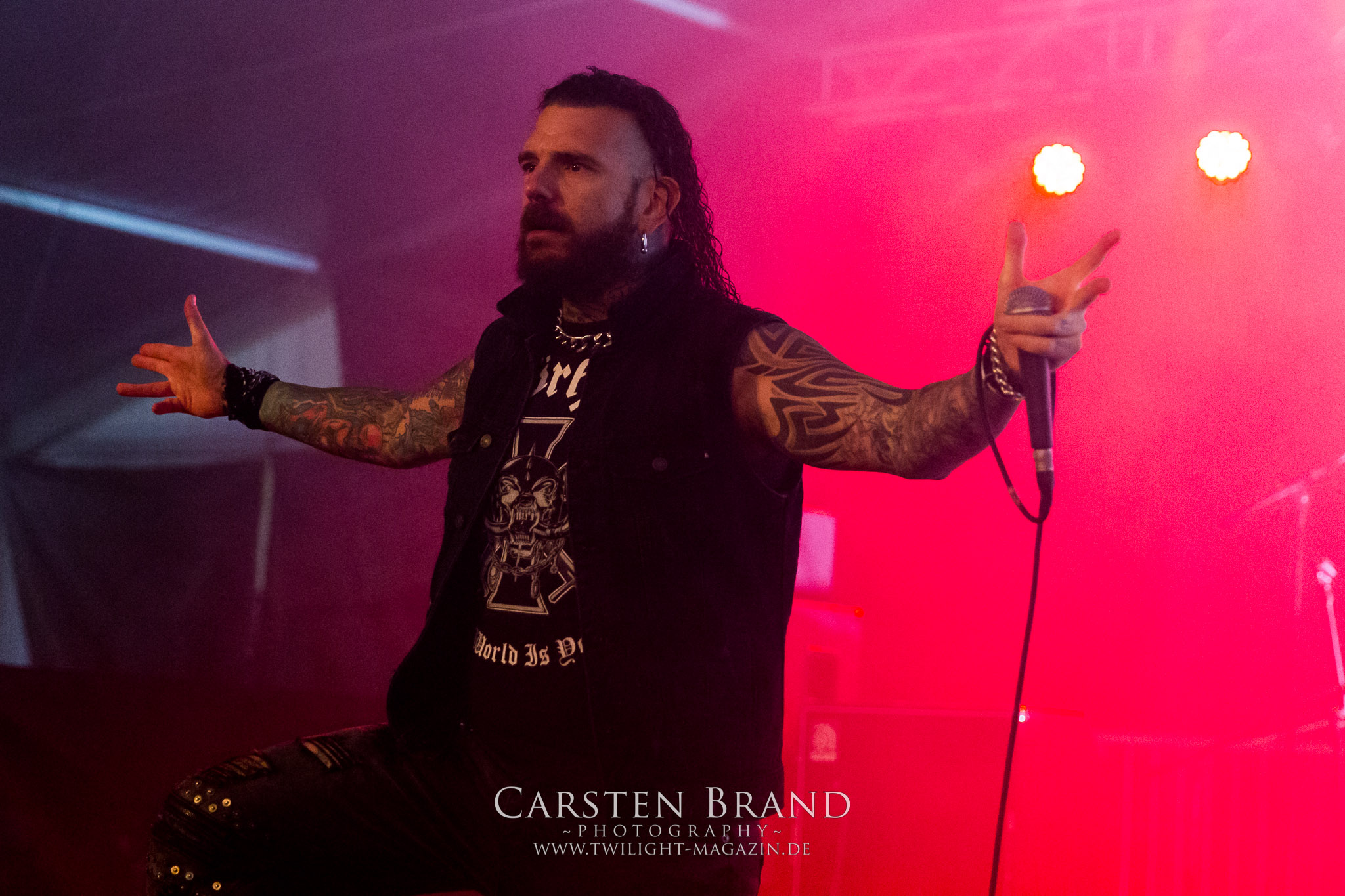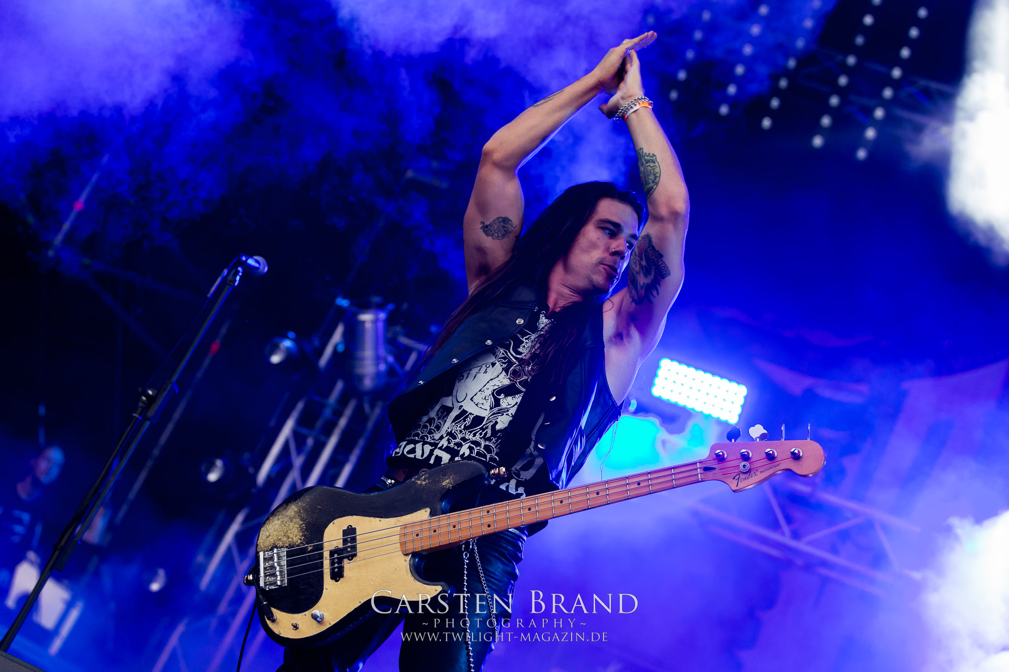 ARKONA aus dem tiefsten Osten sieht man inzwischen gefühlt auf jedem europäischen Festival der härteren Gangart. Vielleicht liegt es an der aufwendigen Bühnenshow mit altertümlichen Instrumenten, Tierfell und Knochenresteverwertung, vielleicht aber auch an der energetischen Sängerin Masha. Auf jeden Fall ist der Bühnenvorplatz immer gut gefüllt und es wird ordentlich mitgesungen, selbst wenn man des Russischen nicht mächtig ist. (MS) NIGHT DEMON machen wie schon vor zwei Jahren eindrucksvoll klar, dass sie als klassische Heavy Metal – Band alles andere als bloßes Beiwerk auf dem Billing sind. Wie schon 2017 funktionieren Night Demon nicht nur musikalisch. Die Band profitiert von ihrer überragenden Live-Qualität und dem starken Song-Material von "Cursed Of The Damned" und "Darkness Remains". Der Maiden-Fan in mir vermisst zwar die "Wasted Years", dafür reißt man mit "Overkill" als Einstieg zu "Dawn Rider" einen Motörhead-Klassiker an. Das muss man auch erstmal so hinbekommen. Night Demon sind motiviert bis in die Haarspitzen und sprudeln über vor metallischer Energie. Selbst am späten Abend ist Frontmann Jarvis Leatherby noch wie ein Duracell-Hase auf dem Gelände anzutreffen.