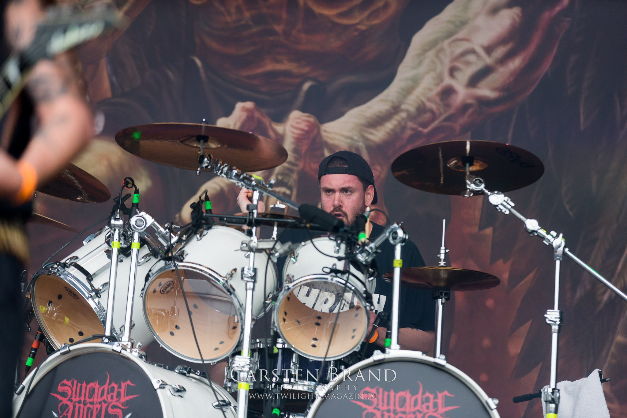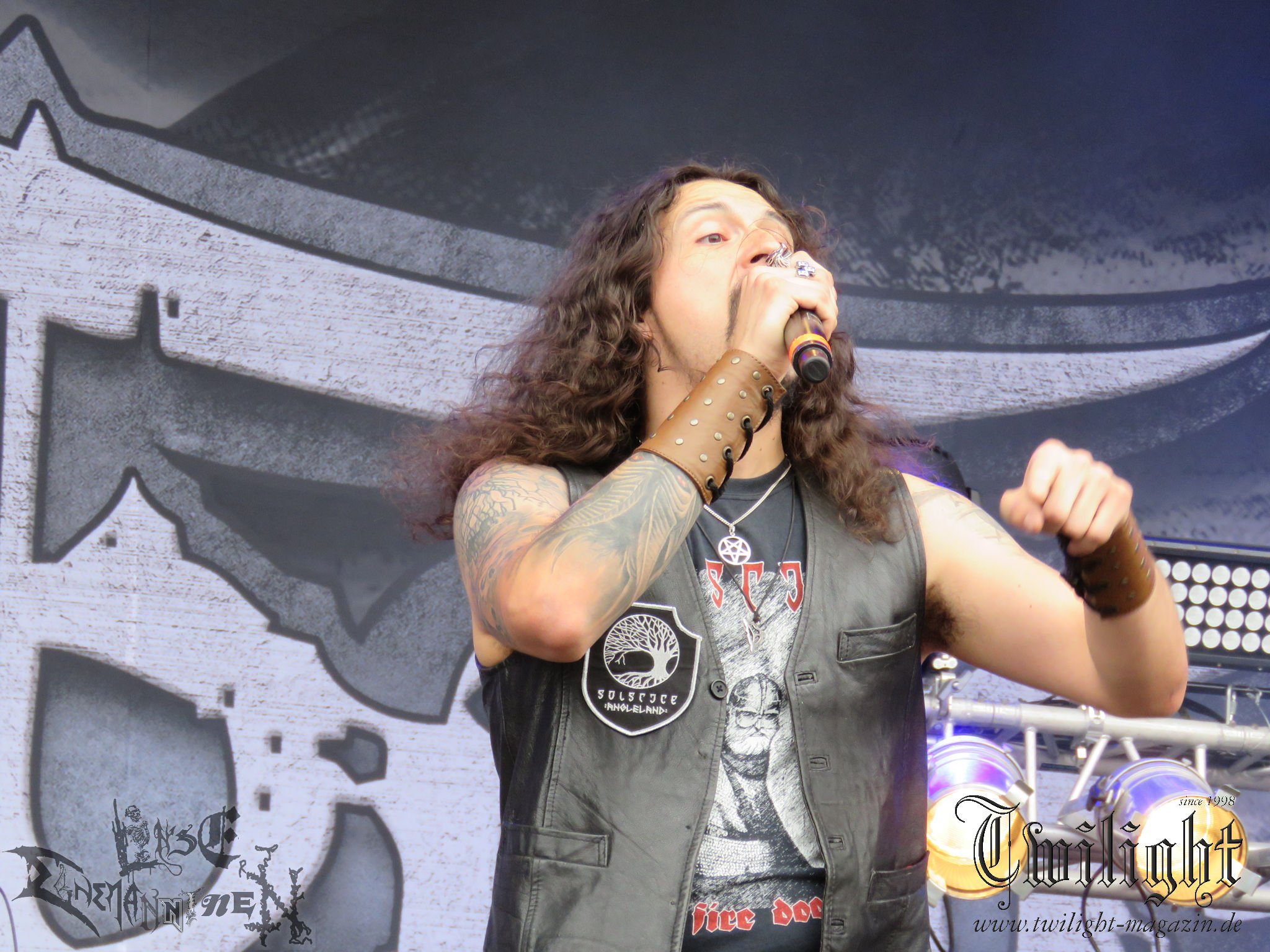 Meine persönliche Prämisse ist es vor allem nicht nochmal ein persönliches Waterloo zu erleben, als an diesem Donnerstag die "Mittagskanone" mit ihrem Salut die offizielle Eröffnung des Festivalgeländes und damit die musikalischen Spiele einläutet. Hatte ich doch im vergangenen Jahr zwischen Orkan und bierseeligen Feierlichkeiten mit Endseeker, Master´s Hammer und Emperor am Ende gleich drei meiner Faves verpasst. (JD) Vor vielen Jahren sorgten auf dem Flugplatz Obermehler im beschaulichen Thüringen noch russische Düsenjets für infernalischen Lärm. Seit 9 Jahren hat diese Rolle das PARTY.SAN OPEN AIR übernommen. Eine besondere Rolle spielt dabei die liebenswerte Haubitze Esmiralda, die jeden Morgen mit einem Kanonenschlag zum Morgenappell ruft.Vielleicht auch dank Esmiralda ist der Platz am frühen Nachmittag schon gut gefüllt und die verkaterten Mienen halten sich in Grenzen, als die Dänen SLAEGT schneller als von einer technischen Doom-Band erwartet loslegen. Lediglich der Toningenieur hat den Schuss wohl nicht gehört und braucht drei Songs, bis er einen guten Sound hervorzaubern kann. (MS)