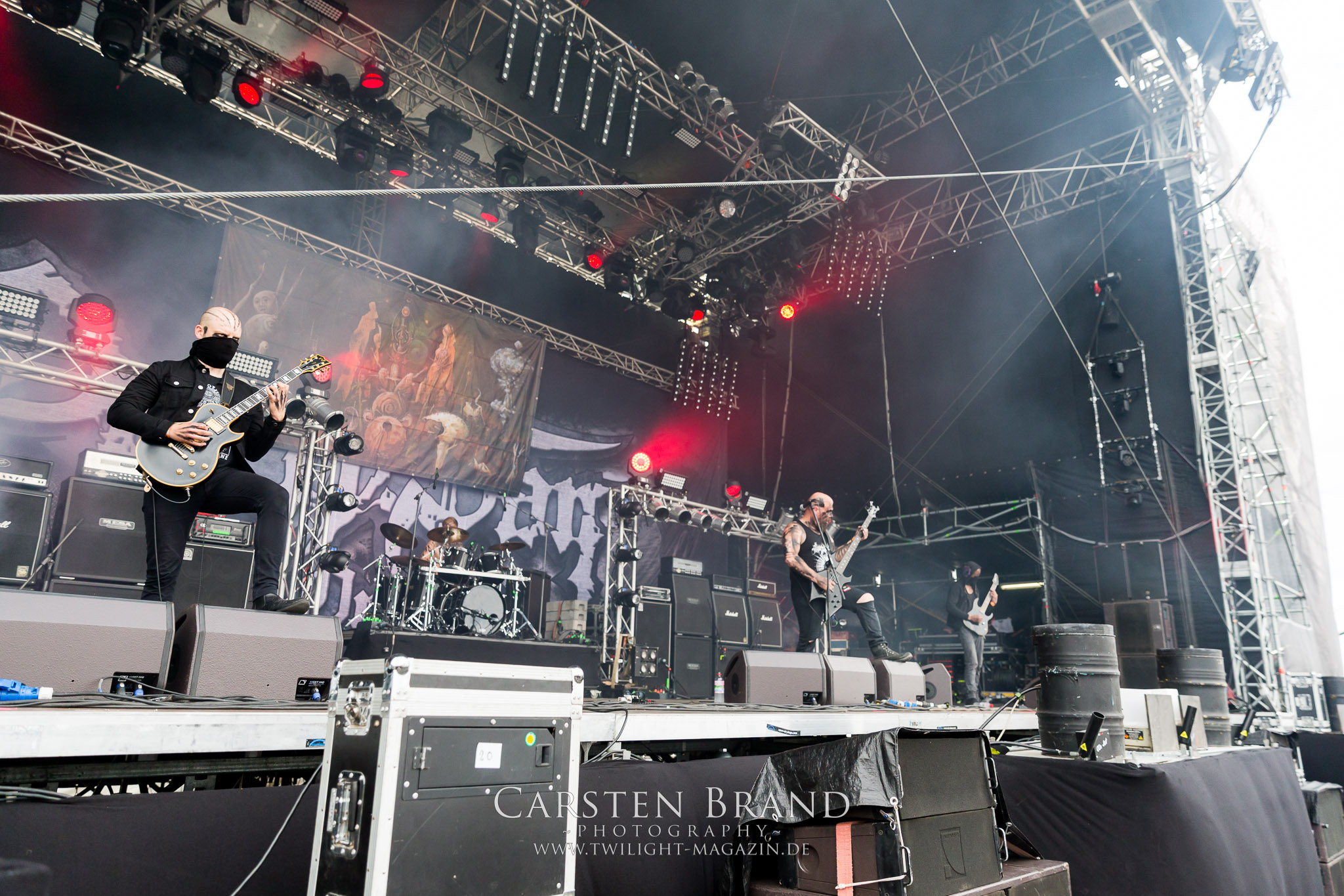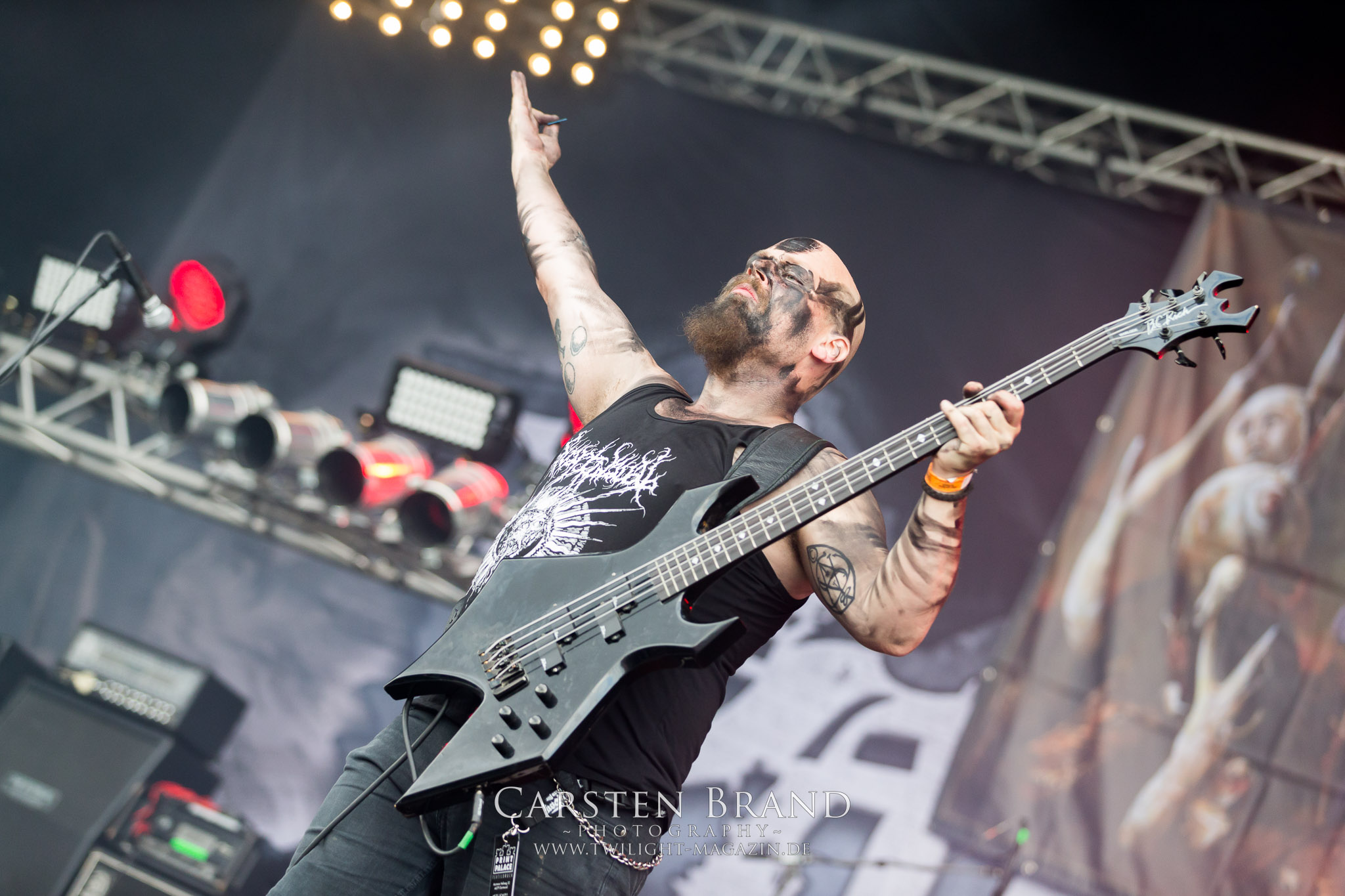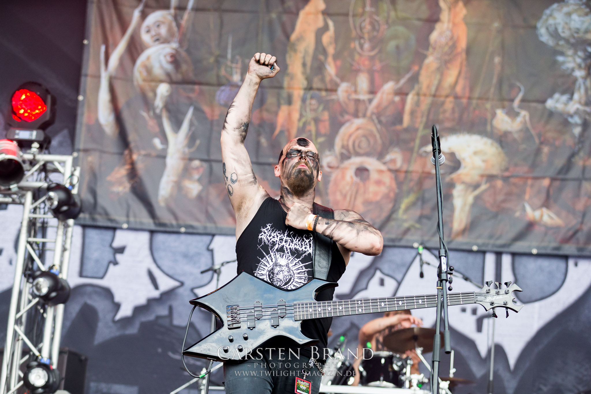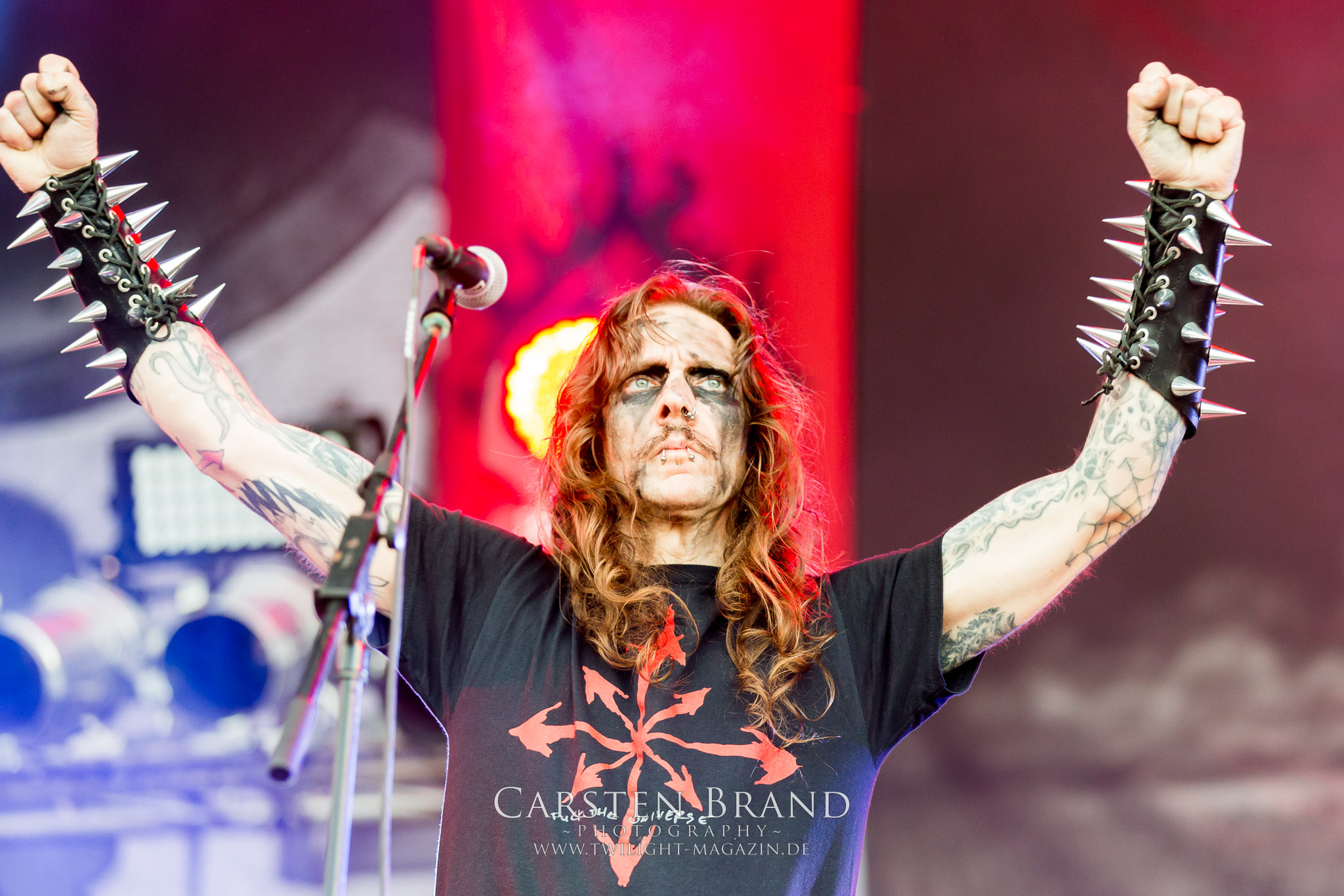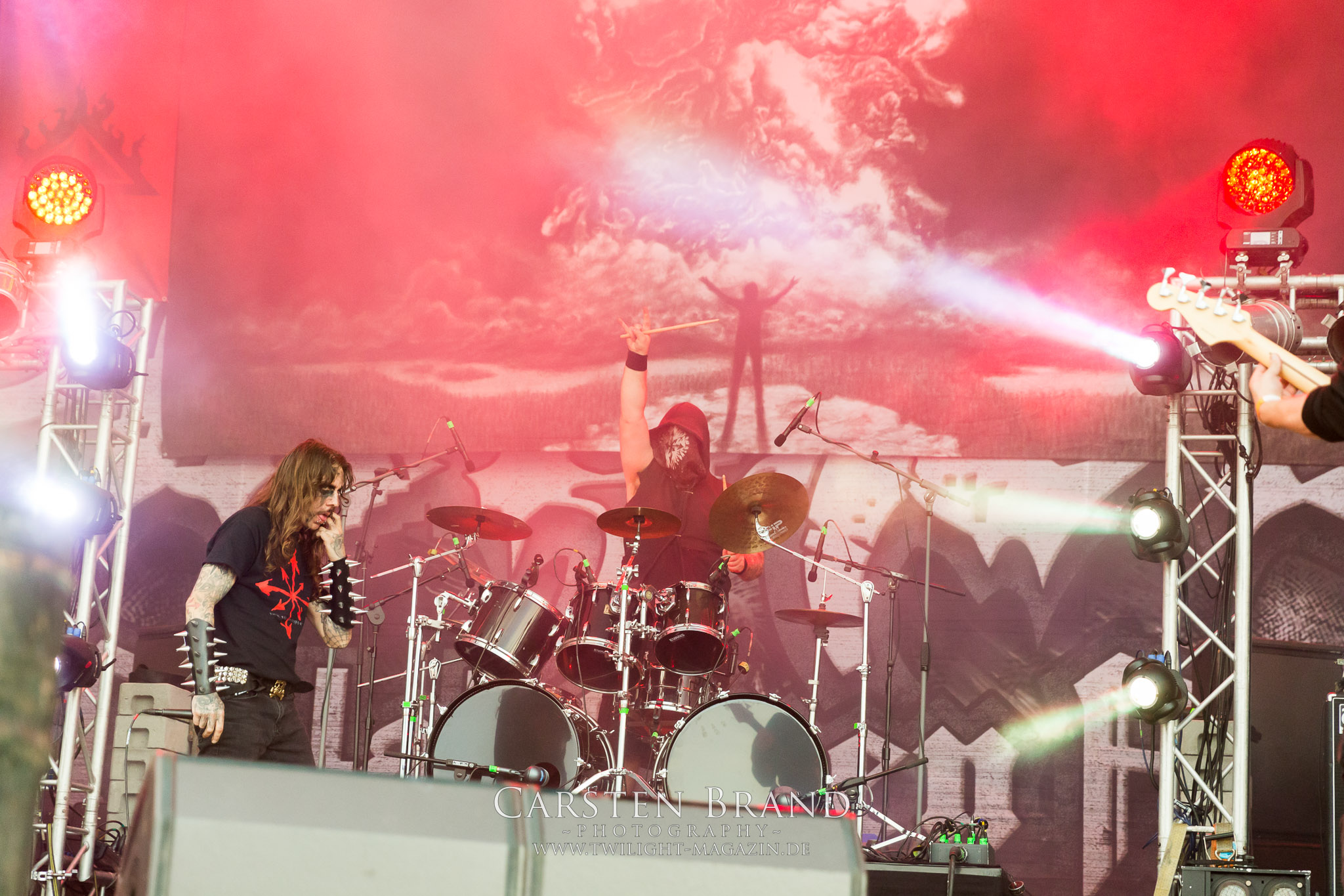 Zeit für die unverwüstlichen deutschen Thrash-Giganten DESTRUCTION. Die Mannen um Frontshouter Schmier haben ihr neues Album „Born to Perish“ im Gepäck und sind gierig darauf, die neuen Sachen auch live zu zocken. Untermalt werden die Songs wie „Betrayer“ von eine mächtigen Feuershow. Unter dem Motto „Thrash ´til Death“ zeigt der Vierer, dass über 30 Jahre alte Songs wie „Bestial Invasion“ immer noch richtig zünden, auch wenn ein großer Anteil des Publikums damals wahrscheinlich noch flüssig war. Direkt im Anschluss trifft der geneigte PARTY.SAN-Gänger auf alte Bekannte, denn NAGLFAR sind schon zum fünften Mal auf dem unheiligen Acker anwesend. Und auf selbigen befinden sich zumindest gefühlt mehr Personen als bei Destruction, um dem melodischen Black Metal zu huldigen. Dabei kommt auch die endlich vorhandene Dunkelheit der nun besser zur Geltung kommenden Lightshow zugute. (MS) Bei IMMOLATION zog ich mich noch einmal kurzzeitig ins Camp zurück, um für die Finals im Zelt und auf der Hauptbühne gewappnet zu sein. MALOKARPATAN gewinnen auf jeden Fall den Preis für die kauzigste Performance des Festivals. Die Slowaken werden gerne in einem Atemzug mit den Tschechen von Master´s Hammer genannt. Was vom Kauzigkeitsfaktor hinkommt, hinkt musikalisch gewaltig. Denn die Herren aus Bratislawa sind viel weniger avantgardistisch unterwegs, als im klassischen Heavy Metal, Black Metal, Thrash und im Rock ´N´Roll verwurzelt. Was Malokarpatan aus diesem Gebräu köcheln ist nicht nur in der Konserve deftig, sondern geht von der Bühne direkt in die Magengrube, in Bein, Schädel und Nacken. Was für eine wilde und chaotische Reise durchs "Nordkarpatenland" mit weintrinkenden Heavy Metal-Romantikern samt Vorliebe für klassische Märchen und Hörspiele.
