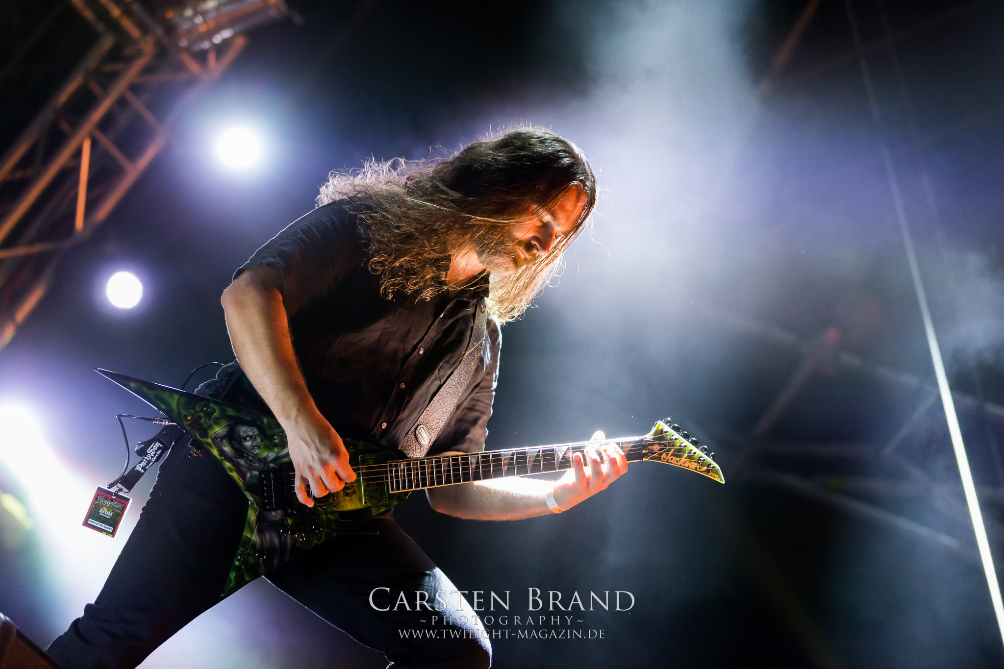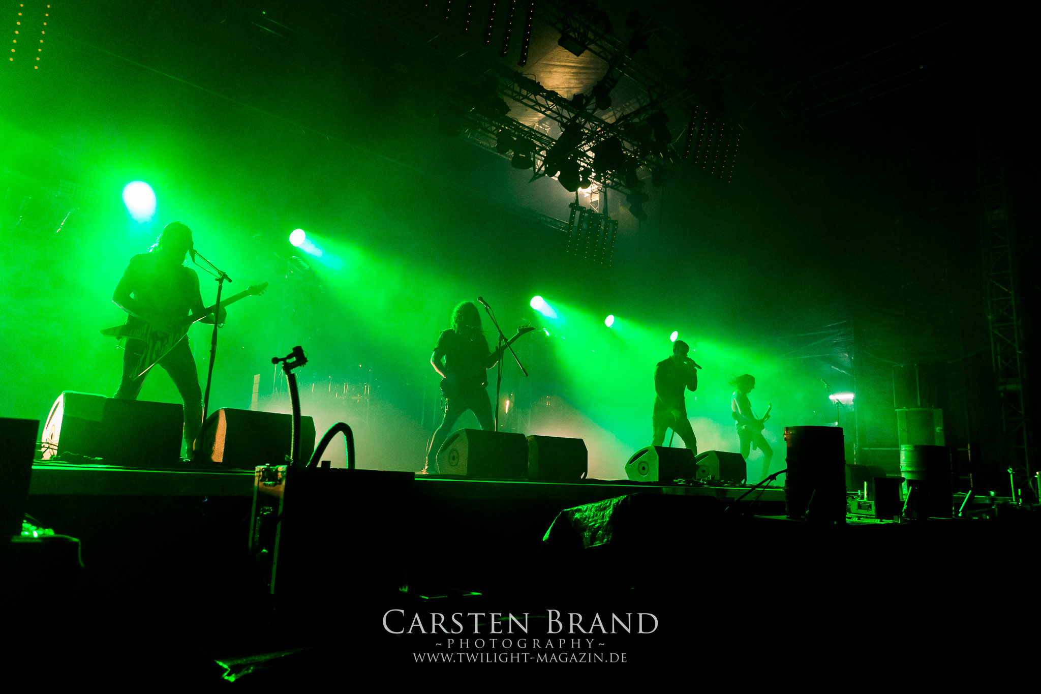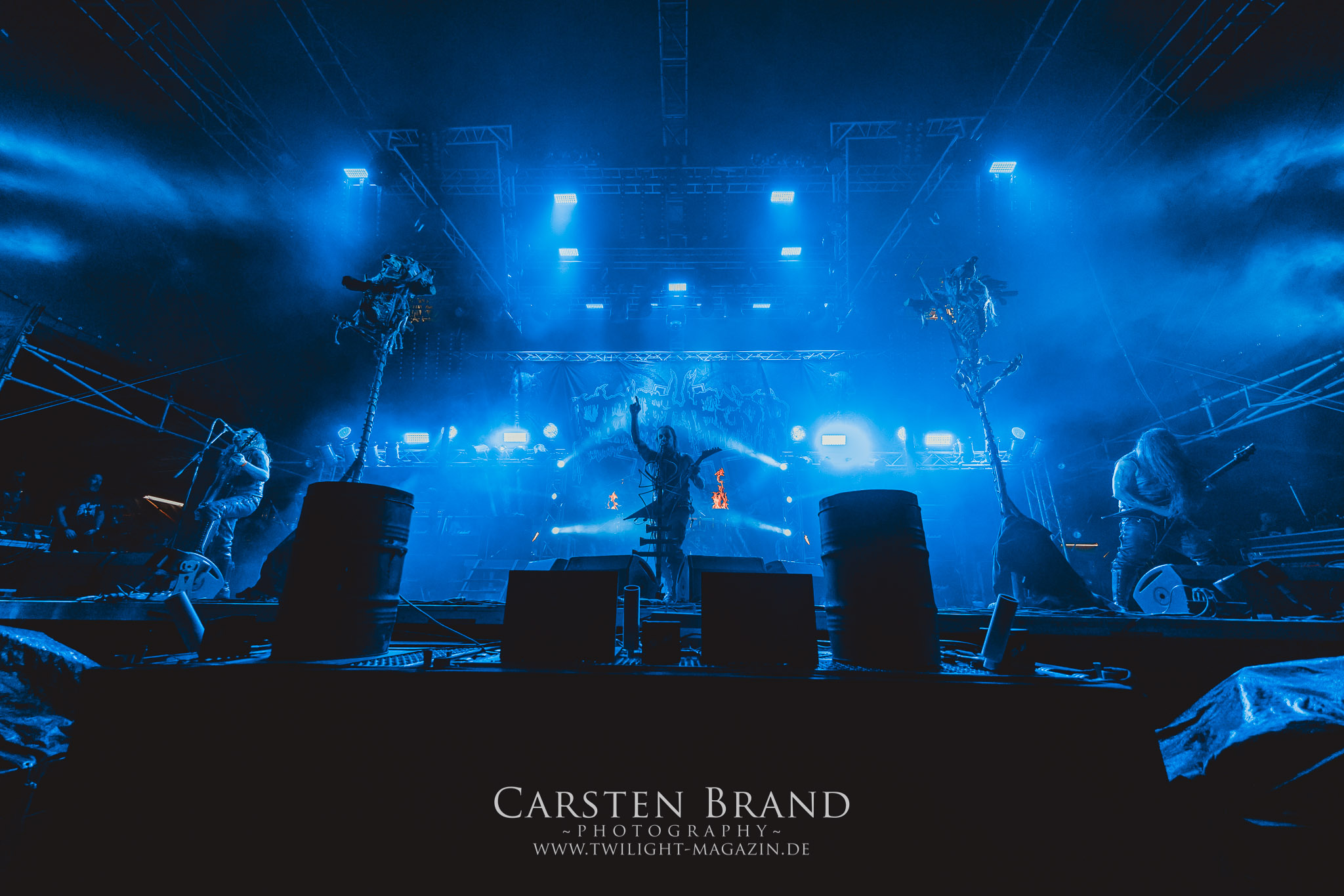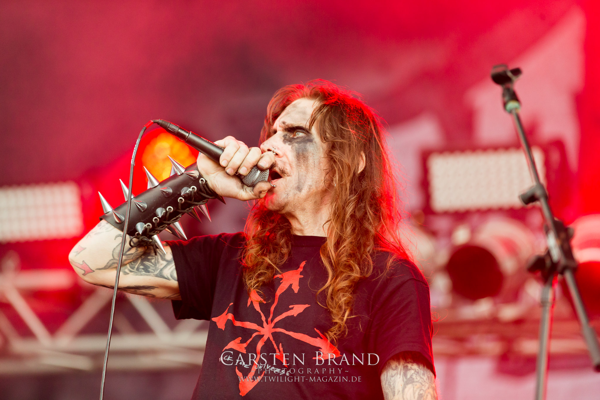 Zeit für die unverwüstlichen deutschen Thrash-Giganten DESTRUCTION. Die Mannen um Frontshouter Schmier haben ihr neues Album „Born to Perish“ im Gepäck und sind gierig darauf, die neuen Sachen auch live zu zocken. Untermalt werden die Songs wie „Betrayer“ von eine mächtigen Feuershow. Unter dem Motto „Thrash ´til Death“ zeigt der Vierer, dass über 30 Jahre alte Songs wie „Bestial Invasion“ immer noch richtig zünden, auch wenn ein großer Anteil des Publikums damals wahrscheinlich noch flüssig war. Direkt im Anschluss trifft der geneigte PARTY.SAN-Gänger auf alte Bekannte, denn NAGLFAR sind schon zum fünften Mal auf dem unheiligen Acker anwesend. Und auf selbigen befinden sich zumindest gefühlt mehr Personen als bei Destruction, um dem melodischen Black Metal zu huldigen. Dabei kommt auch die endlich vorhandene Dunkelheit der nun besser zur Geltung kommenden Lightshow zugute. (MS) Bei IMMOLATION zog ich mich noch einmal kurzzeitig ins Camp zurück, um für die Finals im Zelt und auf der Hauptbühne gewappnet zu sein. MALOKARPATAN gewinnen auf jeden Fall den Preis für die kauzigste Performance des Festivals. Die Slowaken werden gerne in einem Atemzug mit den Tschechen von Master´s Hammer genannt. Was vom Kauzigkeitsfaktor hinkommt, hinkt musikalisch gewaltig. Denn die Herren aus Bratislawa sind viel weniger avantgardistisch unterwegs, als im klassischen Heavy Metal, Black Metal, Thrash und im Rock ´N´Roll verwurzelt. Was Malokarpatan aus diesem Gebräu köcheln ist nicht nur in der Konserve deftig, sondern geht von der Bühne direkt in die Magengrube, in Bein, Schädel und Nacken. Was für eine wilde und chaotische Reise durchs "Nordkarpatenland" mit weintrinkenden Heavy Metal-Romantikern samt Vorliebe für klassische Märchen und Hörspiele.