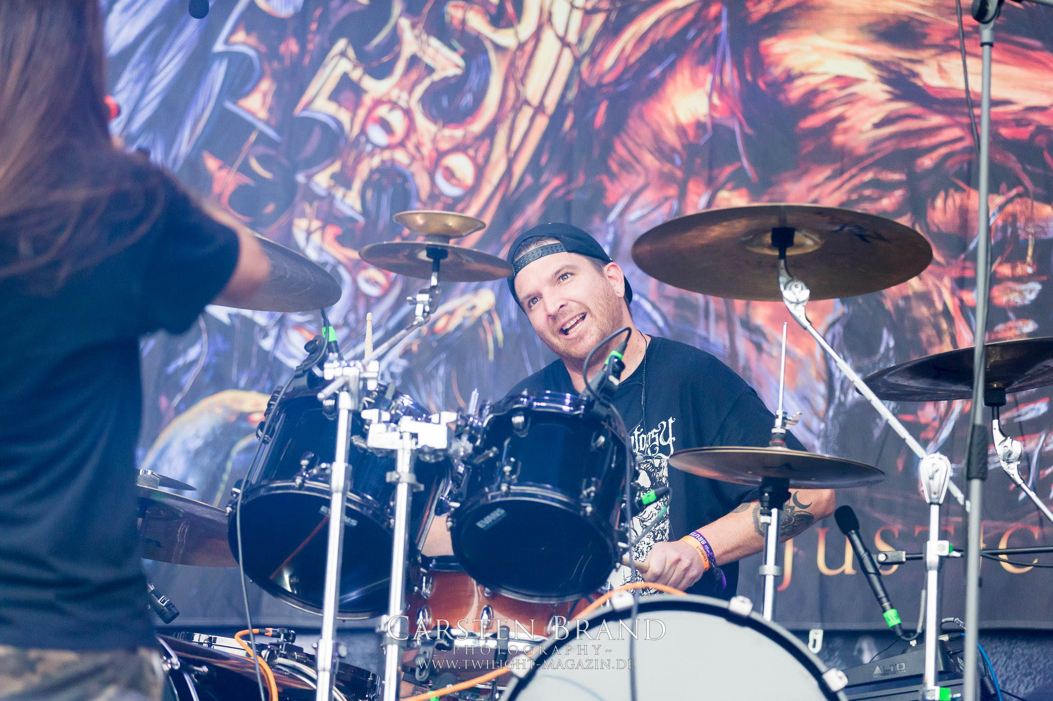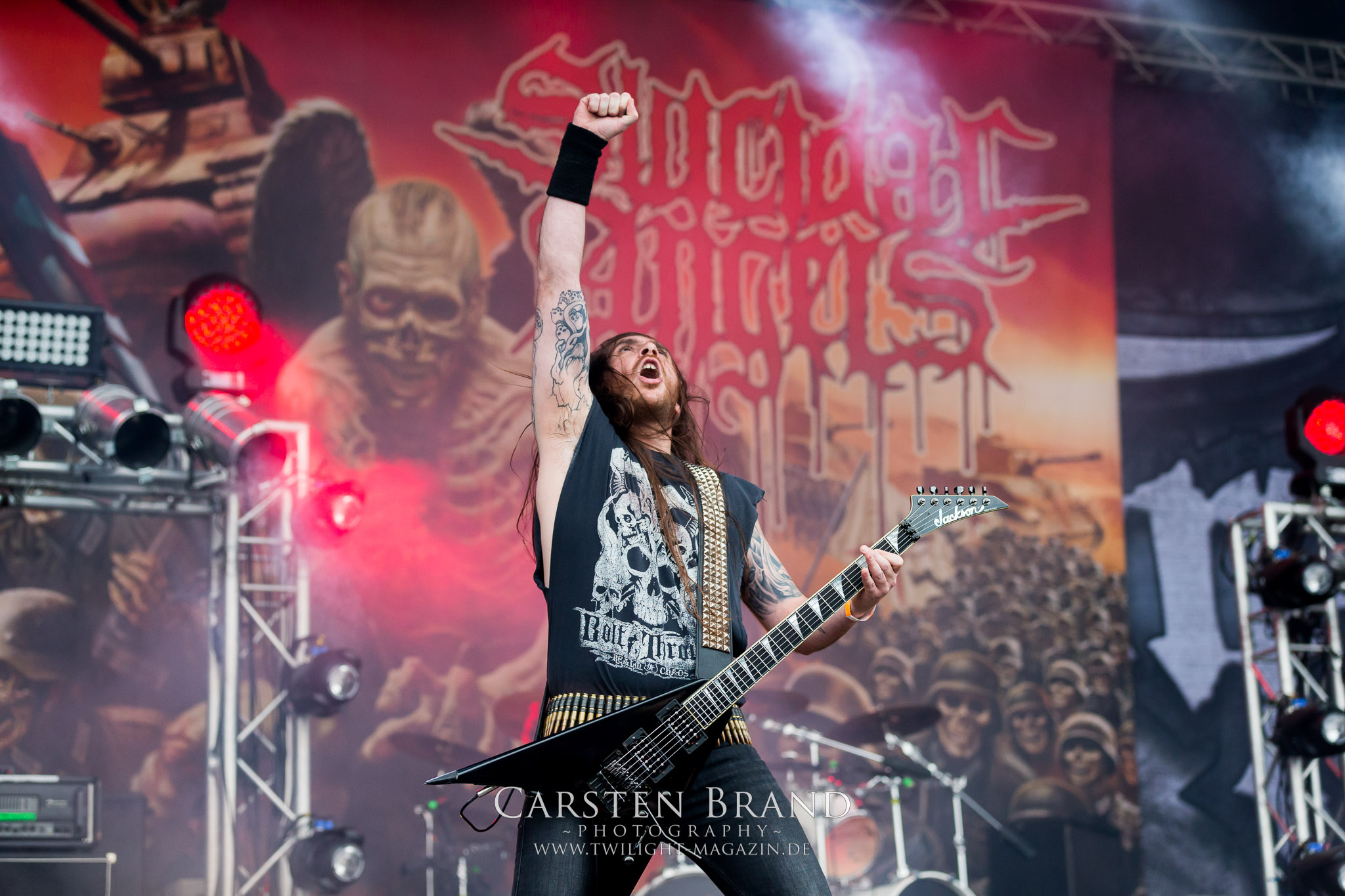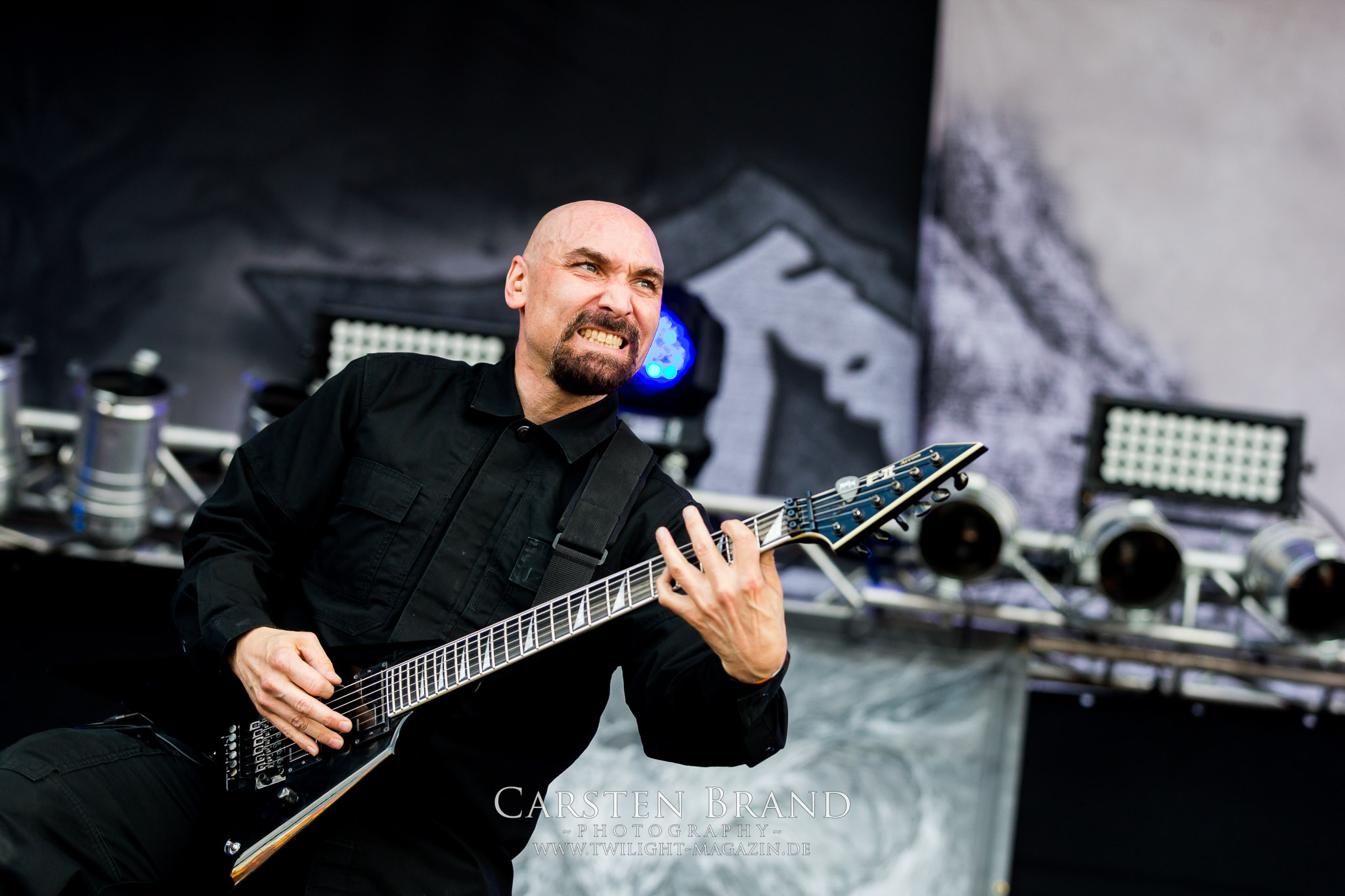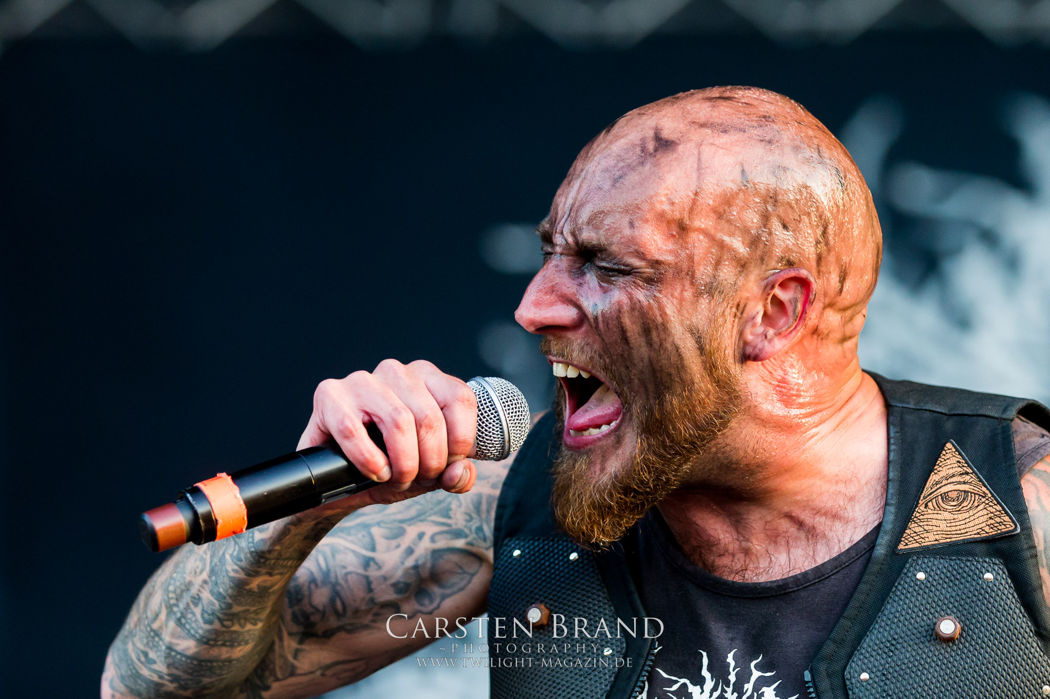 Zeit für die unverwüstlichen deutschen Thrash-Giganten DESTRUCTION. Die Mannen um Frontshouter Schmier haben ihr neues Album „Born to Perish“ im Gepäck und sind gierig darauf, die neuen Sachen auch live zu zocken. Untermalt werden die Songs wie „Betrayer“ von eine mächtigen Feuershow. Unter dem Motto „Thrash ´til Death“ zeigt der Vierer, dass über 30 Jahre alte Songs wie „Bestial Invasion“ immer noch richtig zünden, auch wenn ein großer Anteil des Publikums damals wahrscheinlich noch flüssig war. Direkt im Anschluss trifft der geneigte PARTY.SAN-Gänger auf alte Bekannte, denn NAGLFAR sind schon zum fünften Mal auf dem unheiligen Acker anwesend. Und auf selbigen befinden sich zumindest gefühlt mehr Personen als bei Destruction, um dem melodischen Black Metal zu huldigen. Dabei kommt auch die endlich vorhandene Dunkelheit der nun besser zur Geltung kommenden Lightshow zugute. (MS) Bei IMMOLATION zog ich mich noch einmal kurzzeitig ins Camp zurück, um für die Finals im Zelt und auf der Hauptbühne gewappnet zu sein. MALOKARPATAN gewinnen auf jeden Fall den Preis für die kauzigste Performance des Festivals. Die Slowaken werden gerne in einem Atemzug mit den Tschechen von Master´s Hammer genannt. Was vom Kauzigkeitsfaktor hinkommt, hinkt musikalisch gewaltig. Denn die Herren aus Bratislawa sind viel weniger avantgardistisch unterwegs, als im klassischen Heavy Metal, Black Metal, Thrash und im Rock ´N´Roll verwurzelt. Was Malokarpatan aus diesem Gebräu köcheln ist nicht nur in der Konserve deftig, sondern geht von der Bühne direkt in die Magengrube, in Bein, Schädel und Nacken. Was für eine wilde und chaotische Reise durchs "Nordkarpatenland" mit weintrinkenden Heavy Metal-Romantikern samt Vorliebe für klassische Märchen und Hörspiele.