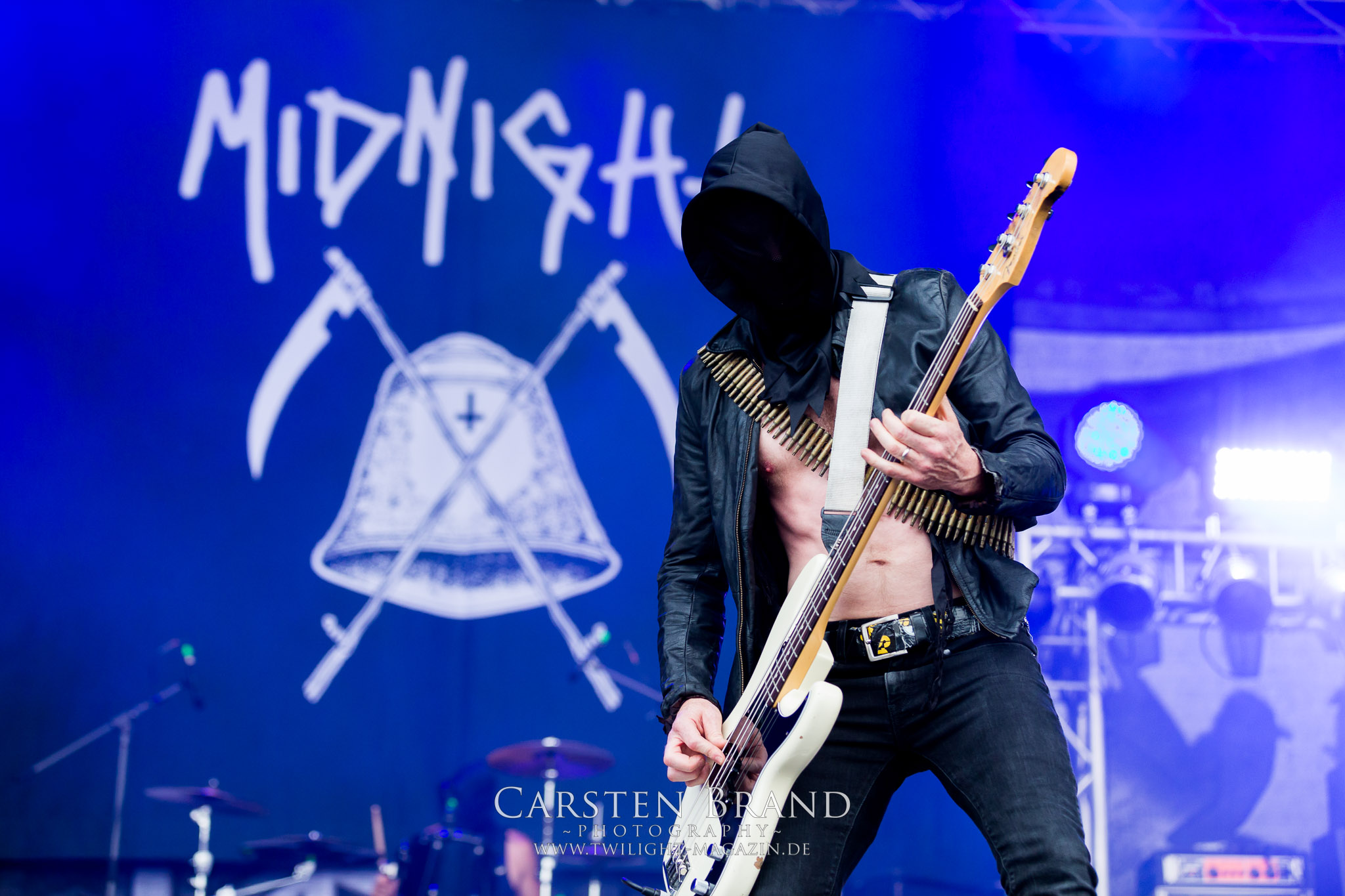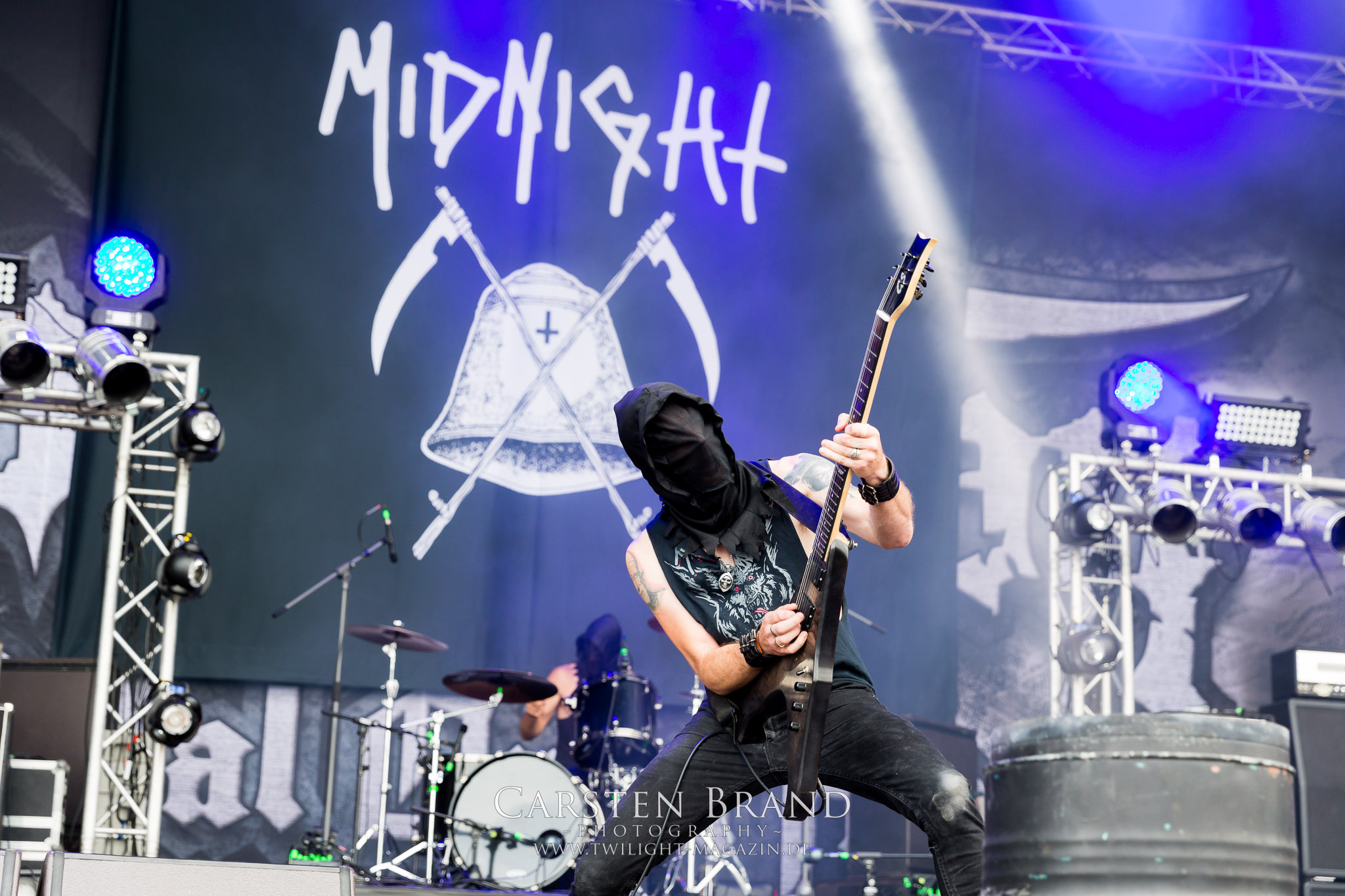 DEFEATED SANITY ist die erste Band, die mit ordentlichem Gegrunze und Geballer auch die letzten Schnapsleichen am Freitag wiederbelebt. Zurück ins Koma fallen dann später einige vermutlich wieder bei SOLSTICE. Bei den englischen Doom-Urgesteinen hat Felipe seinen letzten Auftritt als Aushilfssänger und macht bei seinem BATHORY-Singalike-Contest eine gute Figur. Insgesamt ist das Material aber etwas lahm für den frühen Nachmittag. (MS) So richtig los geht es für mich mit THE CROWN. Die Schweden haben mit "Cobra Speed Venom" 2018 ein überragendes Comeback hingelegt und stehen zu Recht in diesem Jahr auf dem Billing. Und die Schlange ist nicht nur bissig sondern auch wahnsinnig giftig. Wobei das Toxin, in Form von aggressivem Death-Thrash mit einer räudigen Crustpunk-Schlagseite alles andere als lähmt, sondern einfach nur mitreißt. The Crown wollen es wirklich wissen und wüten sich mit einer absoluten Hingabe und halsbrecherischen Intensität durch ihren Set. Besser geht das um diese Uhrzeit nicht. SOLSTICE schlagen anschließend zwar nicht so brachiale, dafür aber nicht weniger leidenschaftliche Töne an. Die britischen Epic-Doomster bekommt man ebenfalls nicht alle Tage zu sehen. Zwischen Genie und Wahnsinn pendeln die Epen zwischen dem ´98er Meisterwerk "New Dark Age" und "White Horse Hill" aus dem Vorjahr, welche den Rahmen der musikalischen Darbietung bilden. Für Felipe Plaza Kutzbach, der u. a. von Procession bekannt ist, ist es der letzte Gig als Session-Sänger. Dabei gibt er eine begnadete Vorstellung ab. Für mich ein hochemotionaler Gig zum Niederknien, den ich in dieser Form allenfalls erhofft hatte. Ganz stark. Zeit, um danach mit MIDNIGHT den ausgelassenen Teil des Nachmittags einzuläuten. Neben Uada ist das Trio um Hauptprotagonist Athenar die einzige Combo, denen ich die "Säcke-überm-Kopf-Nummer" als optisches Markenzeichen abnehme. Musikalisch rotzt das Trio dem Szene-Establishement mit ausgestrecktem Mittelfinger mitten ins Gesicht und verteilt eine Watsche nach der anderen. "Satanic Royalty" ist Programm. Obwohl wie einst 2015 in diesem Jahr keine Instrumente abgefackelt werden, so hinterlassen Midnight jedoch einmal mehr verbrannte Erde auf dem PARTY.SAN. Höchste Zeit die Flüssigkeitsreserven aufzufüllen und ein wenig Ruhe unter dem heimischen Pavillion zu suchen. Somit schwänze ich KRISIUN, die vor wenigen Wochen auf dem Underground Remains Open Air gezeigt haben, dass sie zwar technisch begnadet, allerdings über weite Strecken klinisch klingen und weit entfernt von mitreißender Musik sind. (JD)