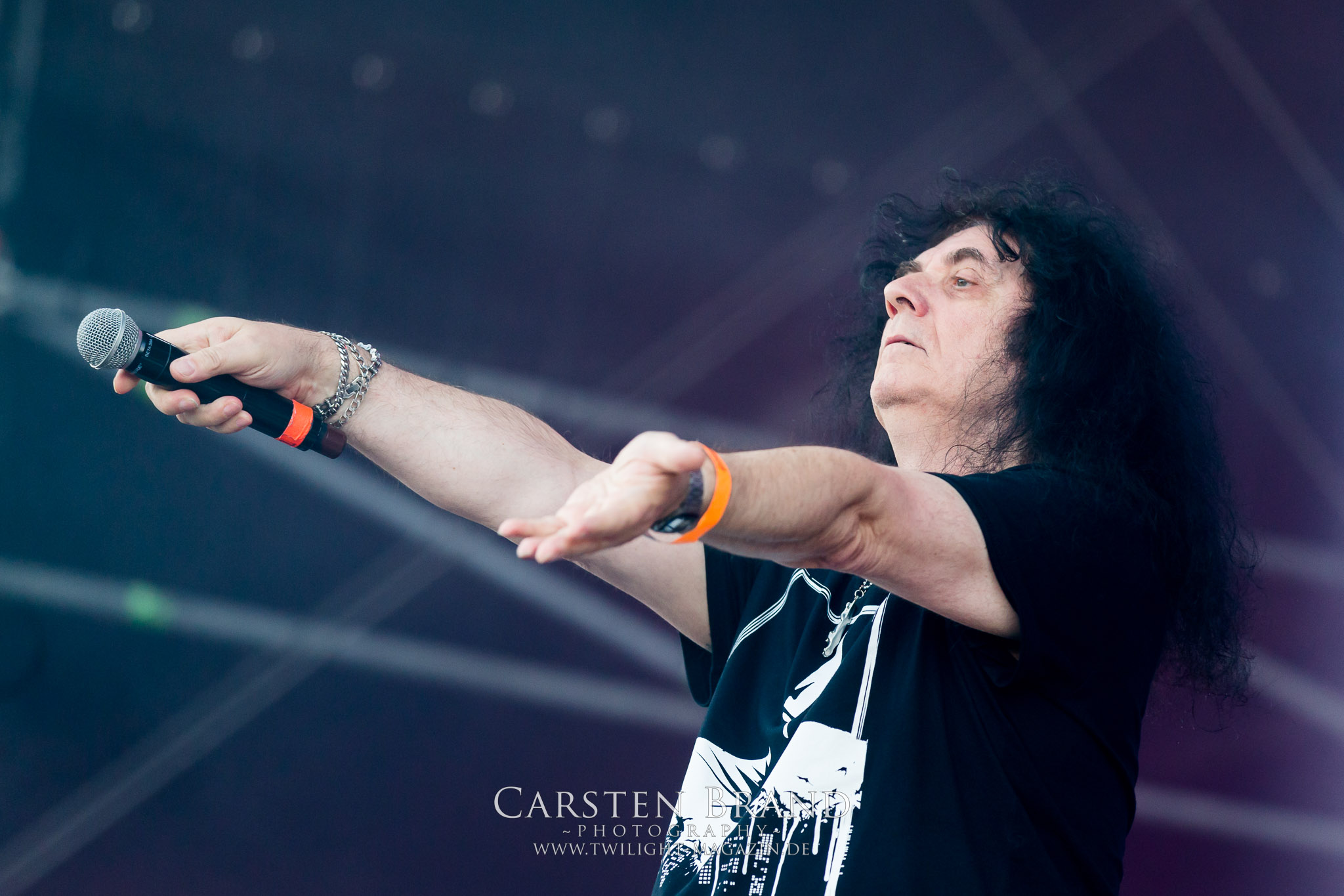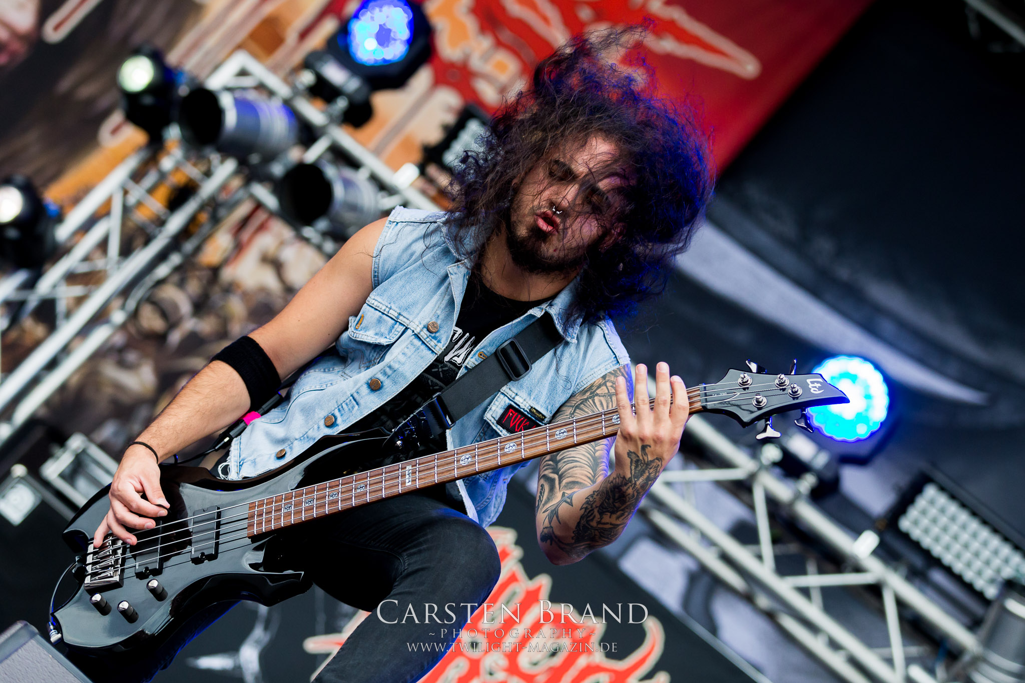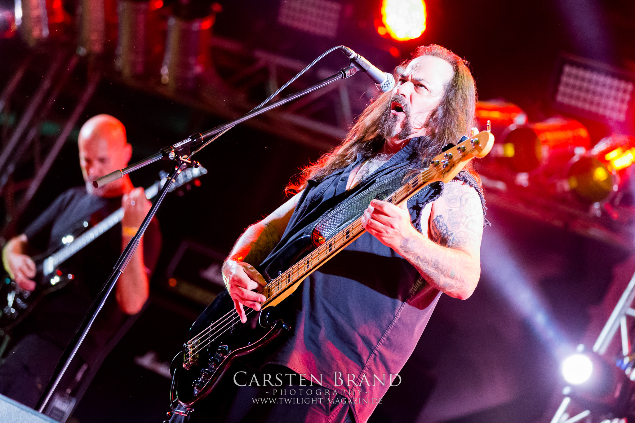 Die NWOBHM-Legende Satan tritt ohne Steve Ramsey mit nur einem Gitarristen an, der aus persönlichen Gründen passen muss. Dadurch driften die verspielten Songs noch mehr in Richtung Classic Rock ab. Obwohl mit Graeme English ein weiteres Skyclad-Mitglied mit an Bord ist werde ich mit dem hektischen Heavy Metal der gestandenen Mucker auf Dauer nicht warm und noch weniger kann ich die Kollegen des Deaf Forever verstehen, bei denen das aktuelle Album "Cruel Magic" zum Album des Monats gekürt wurde. Sänger Brian Ross wirkt anfangs auch nicht gerade übermotiviert. Trotzdem ist eine Combo wie SATAN einmal mehr Farbtupfer und Würze im Billing des PARTY.SAN METAL OPEN AIRs. Nach kurzzeitigen Aussetzern, mit allerlei Unbehagen und Schweißperlen auf der Stirn und anderswo, die mir die Rache Montezumas beim "Mittagsmahl" am Asia-Stand eingebrockt hatte, habe ich glücklicherweise keine weiteren Einschränkungen, außer einen Darm, der sich nach einem Reinraum anfühlt (Grüße übrigens an die Jungs von Gutalax *Zwinkersmiley*!). Insofern bin ich froh, dass ich mich den Berlinern von CARNAL TOMB nun ohne weitere körperliche Ablenkung widmen kann. Das Quartett aus der Hauptstadt gehört zu der in der Breite sehr gut aufgestellten zweiten Reihe an Todesmetall-Combos aus deutschen Landen. Der klassische und fulminante HM2-Sound dröhnt und sägt live aus meiner Sicht sehr viel besser und energetischer von der Bühne als auf den Studioaufnahmen, denen ich im Ansatz nicht soviel wie mein Kollege Rudi vom Hotel 666 abgewinnen kann. Aber es ist schon beeindruckend, wieviel Kraft und Willen CARNAL TOMB in diese halbe Stunde auf der Zeltbühne legen. Und das wird vom Publikum auch entsprechend honoriert. (JD)