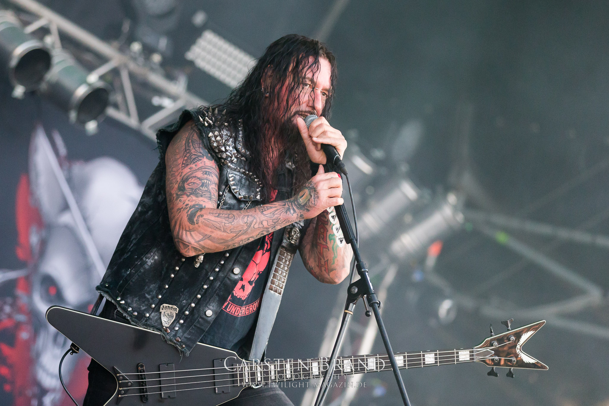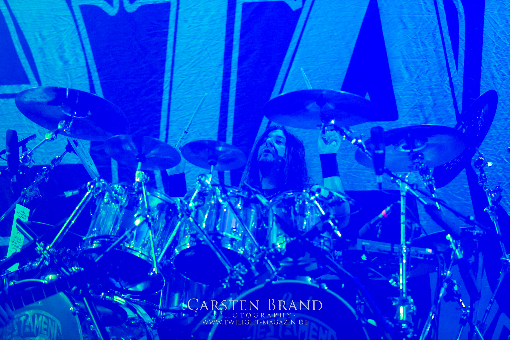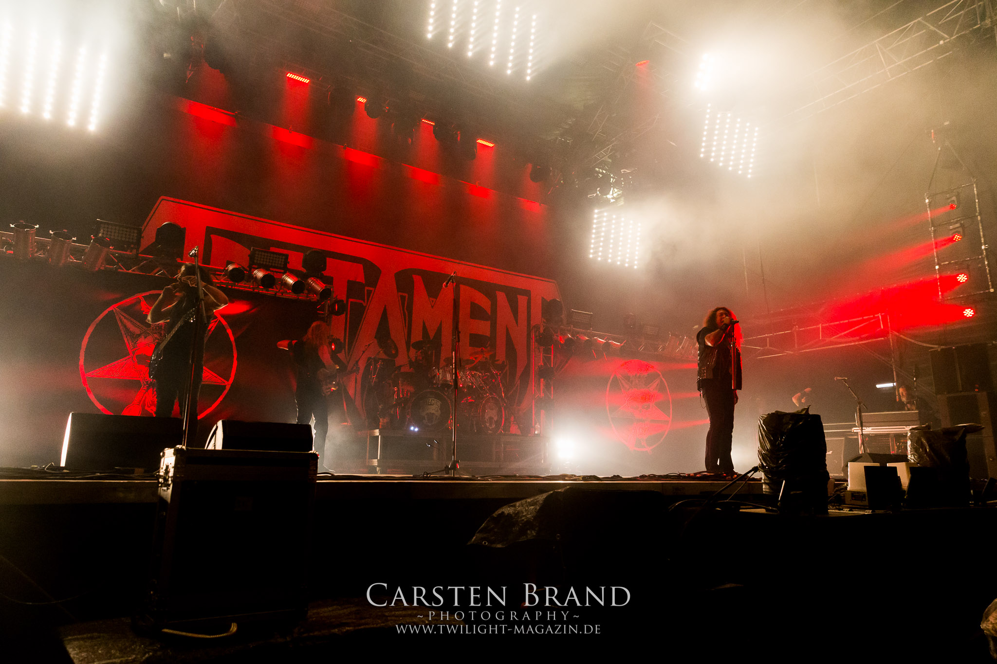 Dass Glen Benton und DEICIDE tatsächlich in Schlotheim antreten, das glaube ich erst, als sie tatsächlich auf der Bühne stehen. Ich muss zugeben, dass ich nicht viel erwartet hatte. Zumal ich kein Experte für die Ami-Deather bin, obschon ich "Once Upon The Cross" nicht nur aufgrund des zynischen Artworks liebe, viele Jahr rauf und runter gehört habe und selbst heute noch gerne auflege. Die Klassiker aus eben jenem Album bilden dann doch tatsächlich das Gerüst eines fett groovenden und stampfenden Sets. Alte amerikanische Todesmetall-Schule, wie sie besser nicht zelebriert werden kann. Ich bin nicht nur überrascht, sondern wirklich beeindruckt von DEICIDE. Dem göttlichen Gegenspieler von Satansbraten Benton scheint das Treiben in Schlotheim jedoch etwas zu weit zu gehen, so dass er kurzerhand mal die Schleusen öffnet, um das entfachte Höllenfeuer wieder etwas herunter zu kühlen. Wobei das feuchte Spektakel pünktlich zum Headliner auch schon wieder vorbei ist. TESTAMENT sind ein Segen für dieses Festival und ganz nebenbei eine der herausragendsten Thrash Metal – Formationen dieses Planeten. Rein musikalisch spielen Testament auf dem PARTY.SAN METAL OPEN AIR in einer anderen Liga. Wie ein atomar getacktetes Uhrwerk brennen Chuck Billy, Gene Hoglan, Alex Skolnick und Konsorten ein Feuerwerk ohne jeglichen Firlefanz und überflüssige Ansagen ab. Jeder Song ist eine Eruption an erhabener Spielfreude, die keinen Metal-Head kalt lassen sollte. Testament sind die Krönung eines musikalisch überragenden Festival-Tages und für mich DIE Band des Festivals. (JD)