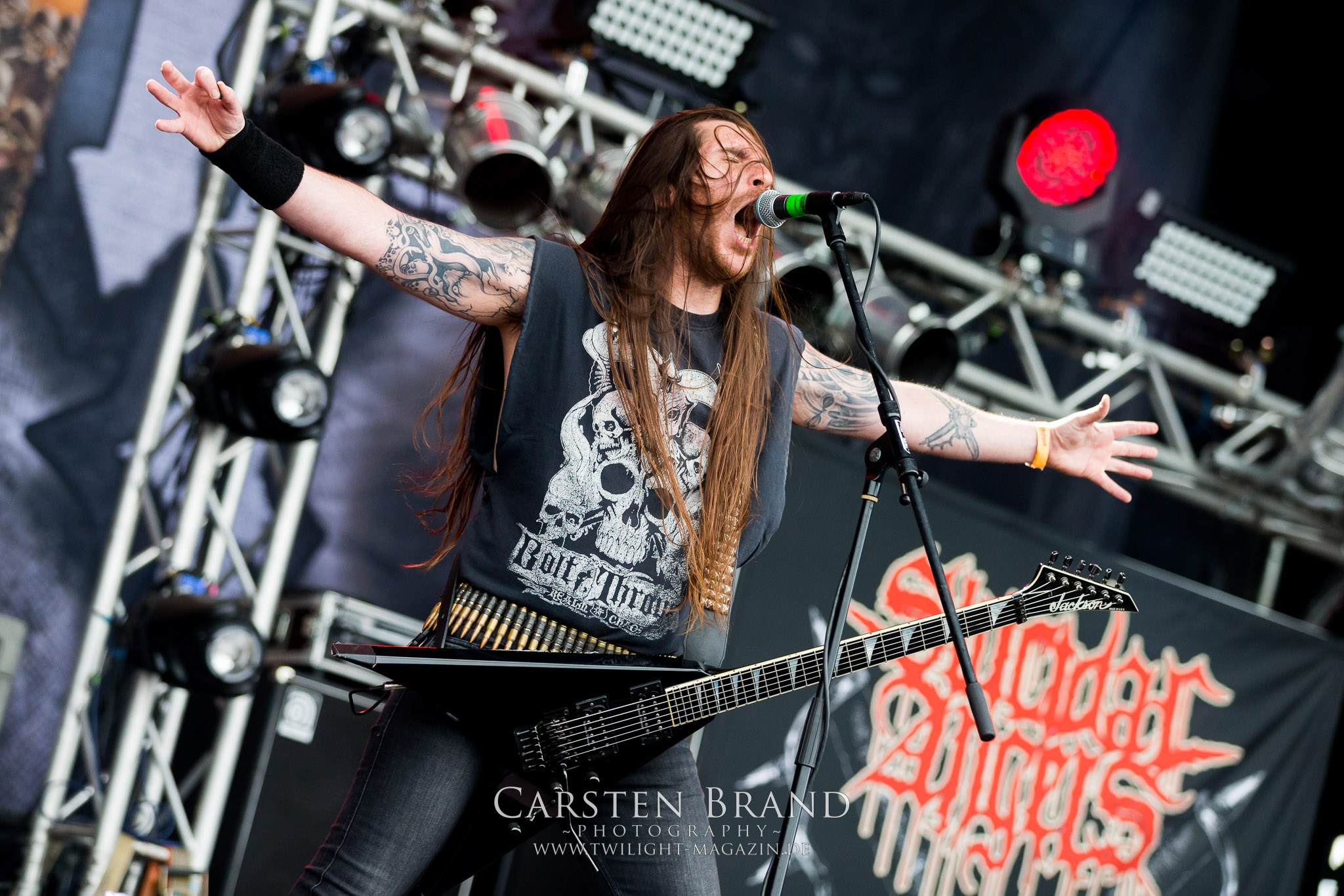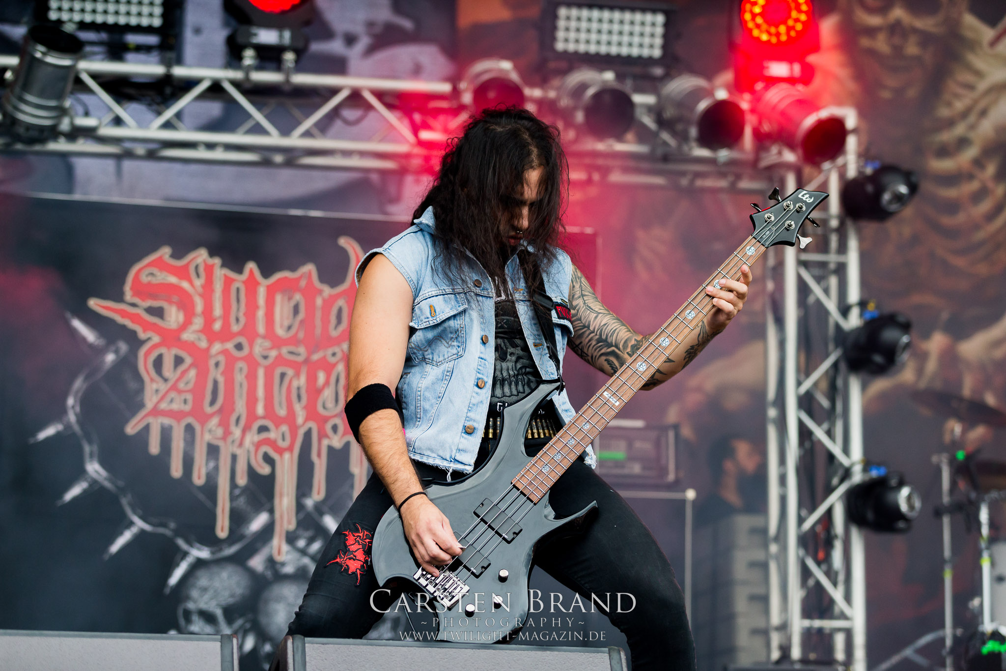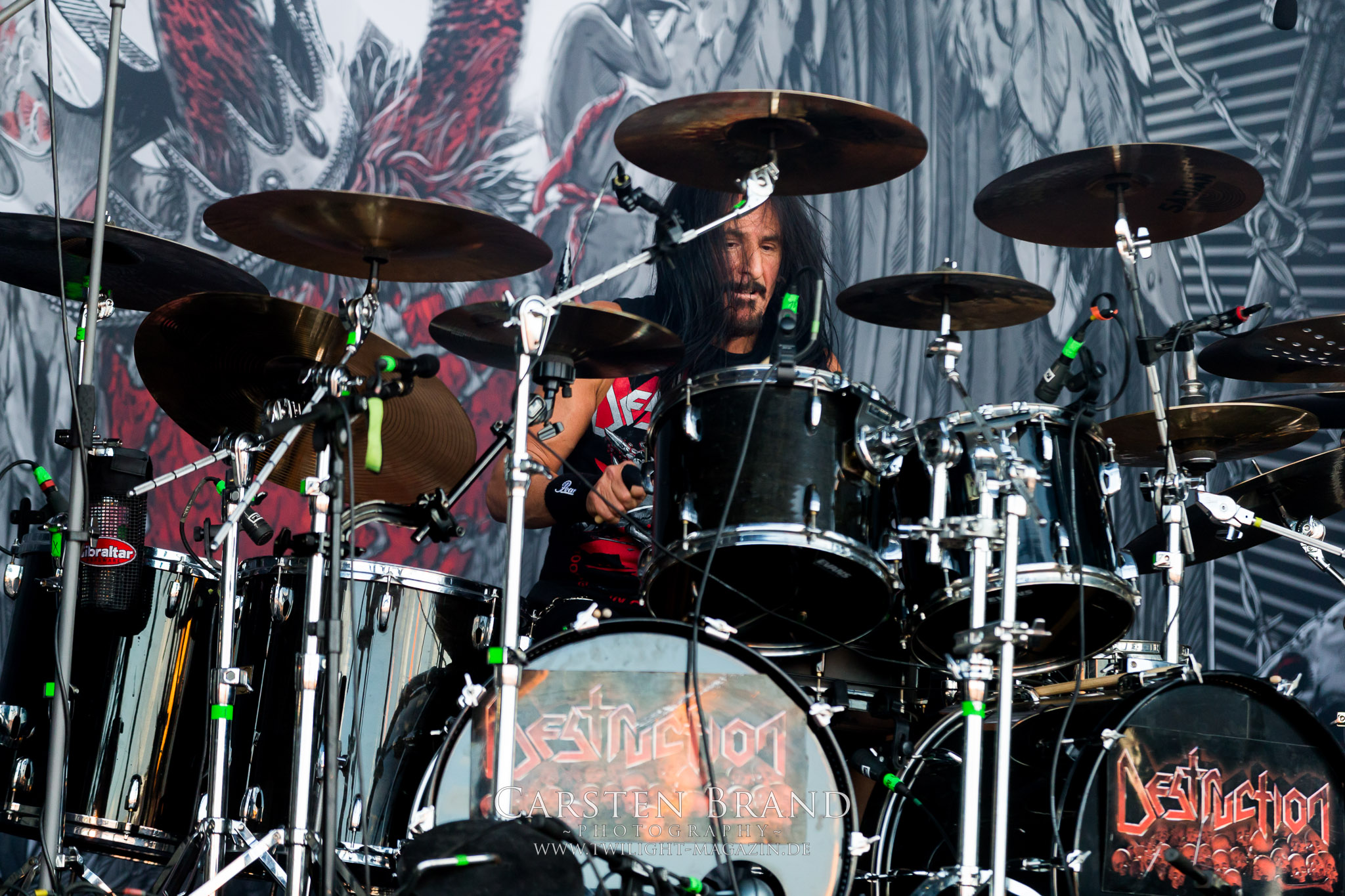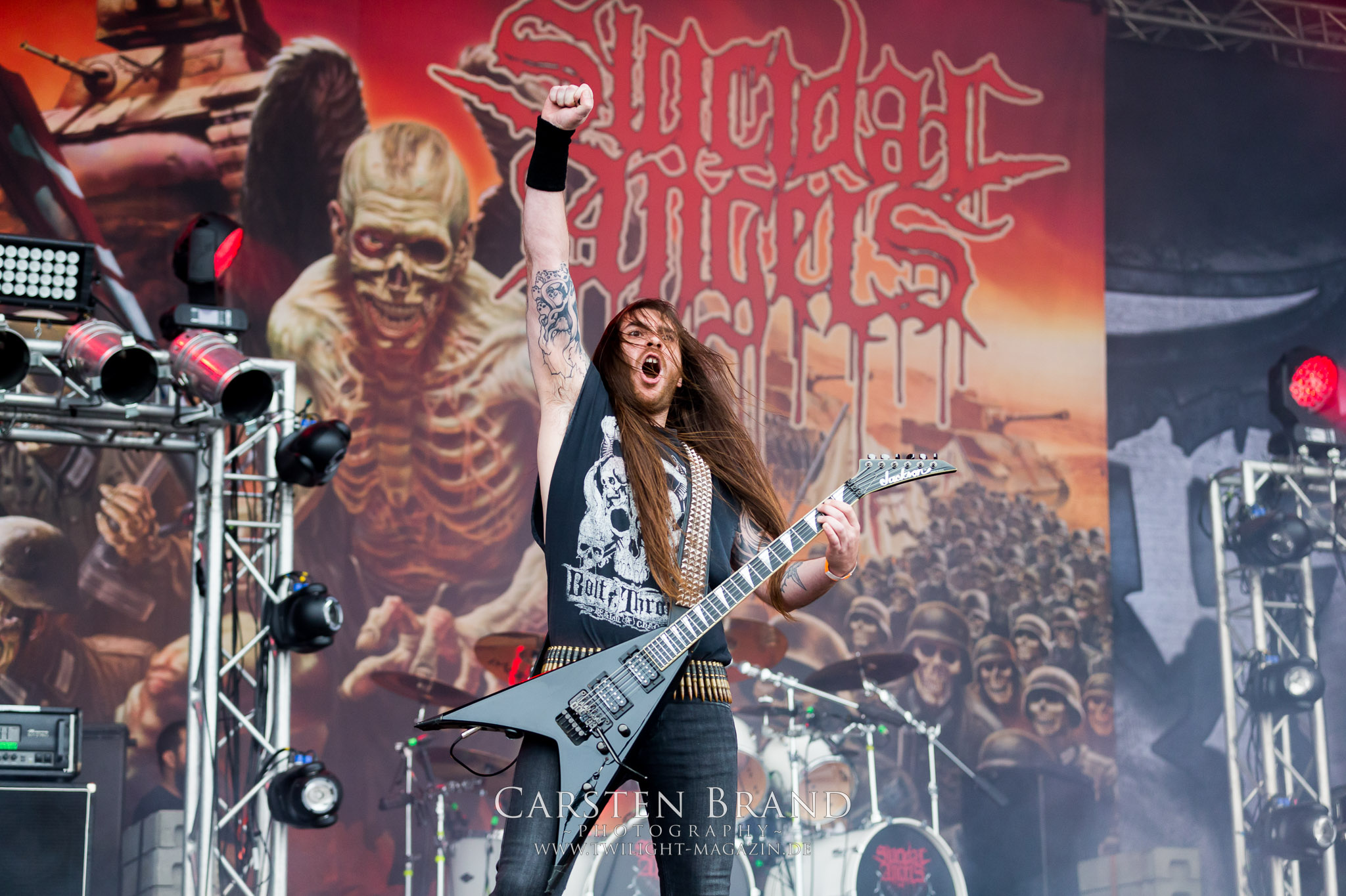 Nach den tiefschwarzen, hypnotischen Black Metal – Klangkollagen aus Island. die minütlich zäher, anstrengender und langweiliger wurden, wissen JUNGLE ROT doppelt zu überraschen. Und zwar im positiven Sinne. Die Amis sind auch schon seit den frühen neunziger Jahren unterwegs. Warum sie mit ihrem, mit offenem Visier vorgetragenen Todesmetall, der wie ein Misery Index meets Dying Fetus auf Old School samt Thrash Metal-Einschlag klingt, nicht deutlich größer geworden sind, ist eigentlich schade. Aber Jungle Rot ist eine Formation, der es leider nicht oft vergönnt war, zur richtigen Zeit am richtigen Ort gewesen zu sein. Die Ausnahme heute bestätigt diese Regel eindrucksvoll. SUICIDAL ANGELS gehen anschließend als klarer Punktsieger in Sachen Thrash Metal am Samstag vom Platz. Obwohl die Griechen und ihre Songs alles andere als orignell klingen, so haben die Helenen doch mächtig Feuer vom Olymp mit nach Schlotheim gebracht. Im Gegensatz zu den nicht nur im Billing sehr viel höher gehandelten LEGION OF THE DAMNED ist das eine rohe, dreckige und vor allem authentische Vorstellung, die mich mitzureißen vermag, während die Niederländer am Abend mit zunehmender Spielzeit deutlich nachlassen, soundmäßig zwar fett sind und doch aalglatt an mir vorbei rauschen. In diesem Zusammenhang soll das deutsche Urgestein Destruction nicht unerwähnt bleiben. Eine Band, die in den frühen, glorreichen Thrash-Zeiten schon an mir vorbei gegangen ist und deren Fan ich in diesem Leben nicht mehr werden werde. Jedenfalls nicht mit Auftritten, wie ich sie heute und in der Vergangenheit auf Festivals erlebt habe. Was folgt, ist nichts für Feingeister und Anhänger des filigranen Todesstahls. Rostig, roh und brutal fräst sich diese schwedische Wertarbeit wie eine stumpfe Kreissäge durch die Death Metal – Anhängerschaft in Schlotheim. Zwar kann ich den Ausnahmestatus von VOMITORY nicht nachvollziehen aber der Alarm, den die Elchtöter veranstalten kann sich schon hören lassen, obschon er mir auf Dauer zu stumpf und eintönig ist.