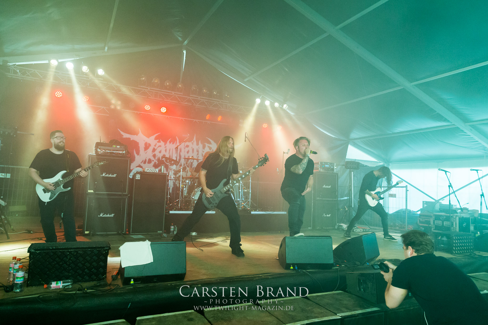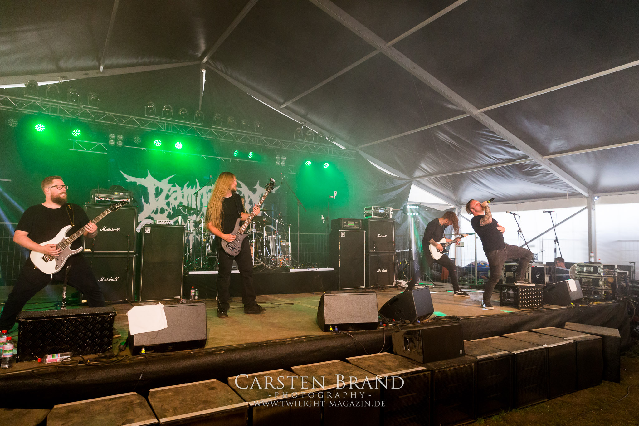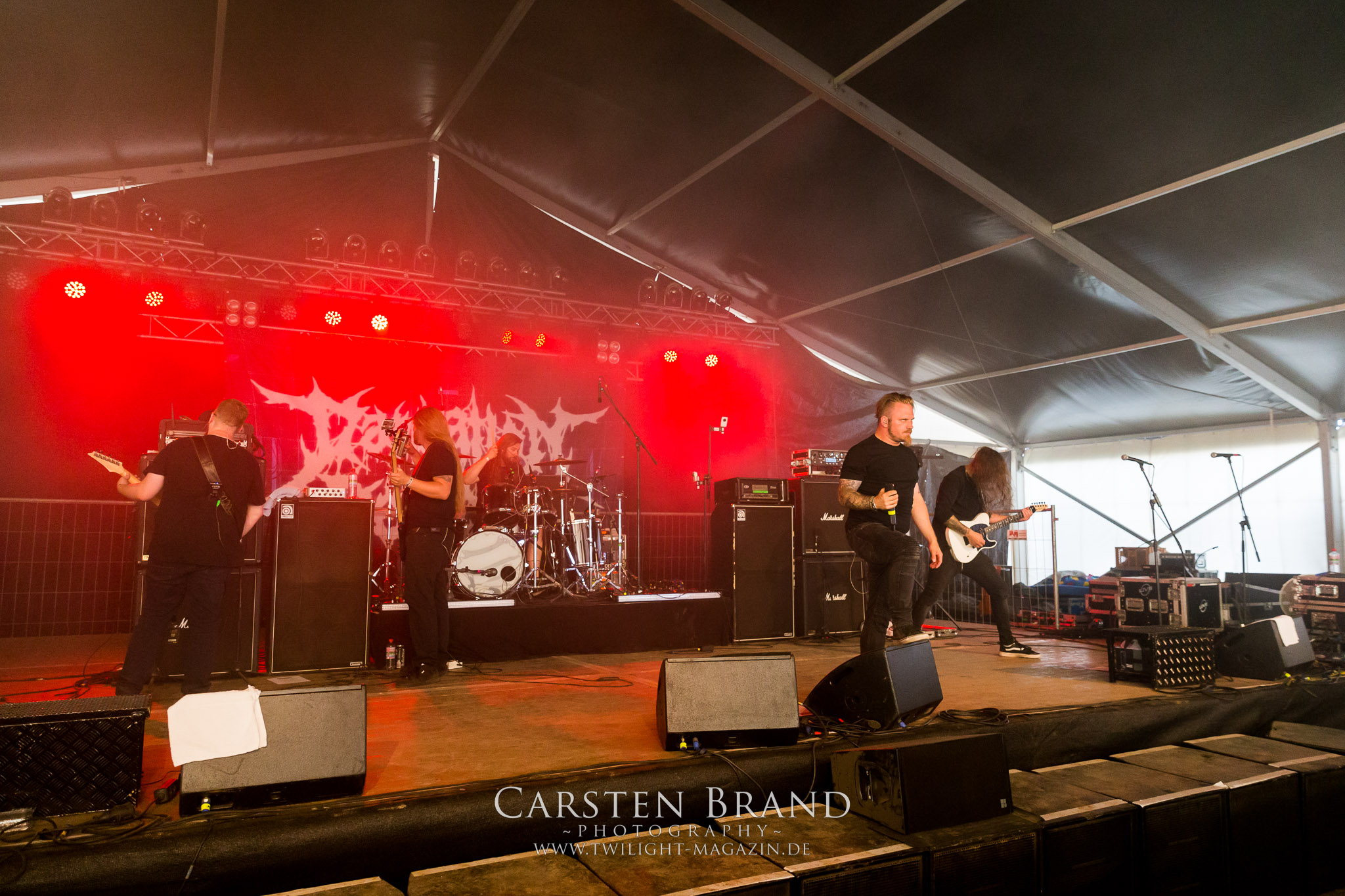 Steigern lässt sich dieser Gig nur noch von DEATHRITE, die dem Zelt eigentlich schon entwachsen sein sollten. Doch die Sachsen nehmen die Herausforderung als Headliner im überschaubaren Ambiente an und sorgen hier für einen mächtigen Abschluss. Obgleich Deathrite auf der Bühne alles andere als introvertiert agieren, so wirken die Jungs mitunter sehr distanziert und reserviert, was missverständlich zeitweise als Arroganz ausgelegt wird, vor allem dann, wenn der musikalische Funke mal nicht überspringen will. Dazu besteht heute aber absolut keine Veranlassung, denn der Fünfer aus Dresden zündet ein Feuerwerk, bei dem nicht nur Funken sprühen, Alpträume niederregnen und zudem auch der Übersong "Where Evil Arises" nicht ausgespart wird. In dieser Form kommt man auf der Hauptbühne an DEATHRITE nicht noch einmal vorbei. (JD)