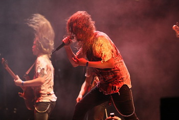 Wohl dem, der den dritten und letzten Festival-Tag gediegen beginnt. Trotz des einmal wieder reichhaltigen und nahrhaften kulinarischen Angebotes von Nagelfood soll es erlaubt sein, auch einmal zum Essen von einem Porzellanteller nach Bad Berka zu gehen. Ein saftiges Steak lockt auf der Speisekarte. Leider sind wir nicht die einzigen, die sich davon locken lassen. Es dauert ewig, bis wir alle mit unserem Essen versorgt sind und somit verpasse ich leider den Auftakt der brasilianischen Exoten IMPERIOUS MALEVOLENCE und der schwedischen US-Death Sickos INSISION. Schade eigentlich...(CP) Für mich die einzige wirklich große Überraschung auf diesem Festival sind FACEBREAKER. Die CD der Jungs ist ja schon nicht schlecht, aber ohne Erwartungen zu so einem Gig zu gehen und dermaßen begeistert wieder zu gehen, wer hätte das gedacht. Absolut geile Beats und fette Riffs paaren sich mit der genialen stimmlichen Gewalt des Sängers. Ich war echt überrascht und nicht unbedingt abgeneigt diese Band in Zukunft noch öfter mal live erleben zu können. Diese Jungs gehören mal richtig promoted und als Co-Headliner auf diverse Konzerte mit ner guten Stunde Zeit sich auszutoben. Fazit: Der Wahnsinn. Wer sie nicht kennt: REINHÖREN!(DS) KOLDBRANN, wieder so eine Combo der jüngeren Black Metal Generation aus dem hohen Norden Europas. Ebenfalls wie Tyrant aus Schweden klingen die Norweger solide und bieten eigentlich alles, was man von einer grimmigen Black Metal Band erwartet. Mir fehlt trotzdem einmal wieder das gewisse Etwas, sozusagen, die Würze in der Suppe. Die Truppe versucht schließlich durch Endstille-Fronter Iblis nachzuwürzen, was den Gig am Ende auch nicht besser aussehen läßt. Wie gesagt, solide aber nicht herausragend.(CP) Zwischen den Dunkelheimern Koldbrann und Vreid sorgen die Goregrinder GENERAL SURGERY für einen blutroten eitrigen Farbtupfer der besonderen Art. Auch wenn mich solch roher Stoff mittlerweile nicht mehr ganz so vom Hocker reißen kann, solide ist es allemal, was die Schweden hier vorlegen.(JD) VREID sorgen für die saucoole dunkle Überraschung des Tages. Die Band versteht es wie keine andere den mystischen Spirit des Black Metal mit aschfahlem Endzeit-Rock ´N` Roll zu verbinden. Schlicht, ungeheuer effektiv und leidenschaftlich, das sind die Attribute mit denen Vreid hier glänzen und die feiernde Meute mehr und mehr in ihren Bann ziehen. Intensiv, authentisch, einfach mitreißend und klasse, diese Band sollte man in Zukunft auf der Rechnung haben.(CP) Das MAROON -obwohl Thüringer- es nicht leicht haben werden war wohl jedem klar. Aber warum? Weil sie eine Metalcore-Band sind? Verdammte Scheiße, Maroon machen keinen Metalcore. Definitiv nicht. Und was hier aus den Boxen kracht ist verdammt nochmal mehr Death Metal als die lauen Lüftchen von lauen Bengelchen die nur versuchen halbwegs evil aus der Wäsche zu gucken. Sänger Andre Moraweck kommt von Anfang an sympathisch rüber und lässt sich auch nicht von gelegentlichen Wurfgeschossen aus der Fassung bringen (irgendwelche Spassvögel warfen Bockwürstchen auf die Bühne). Gerade unter diesen schwierigen Umständen ist die Leistung von Maroon doppelt zu würdigen.(ET) Wer Mikka Luttinen und seine Mannen bereits am Nachmittag im Backstage zu Gesicht bekommen hat, der vermochte die wilde Entschlossenheit, nicht aber die Energie und die unglaubliche Kraft erahnen, mit der die in den letzten Jahren viel geprügelten Finnen hier zu Werke gehen.