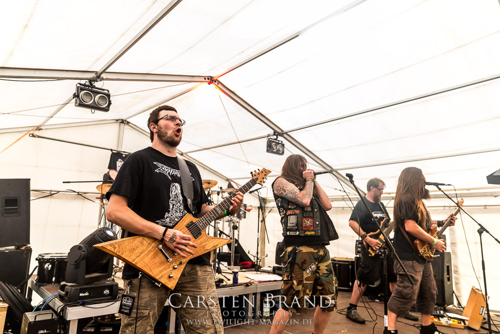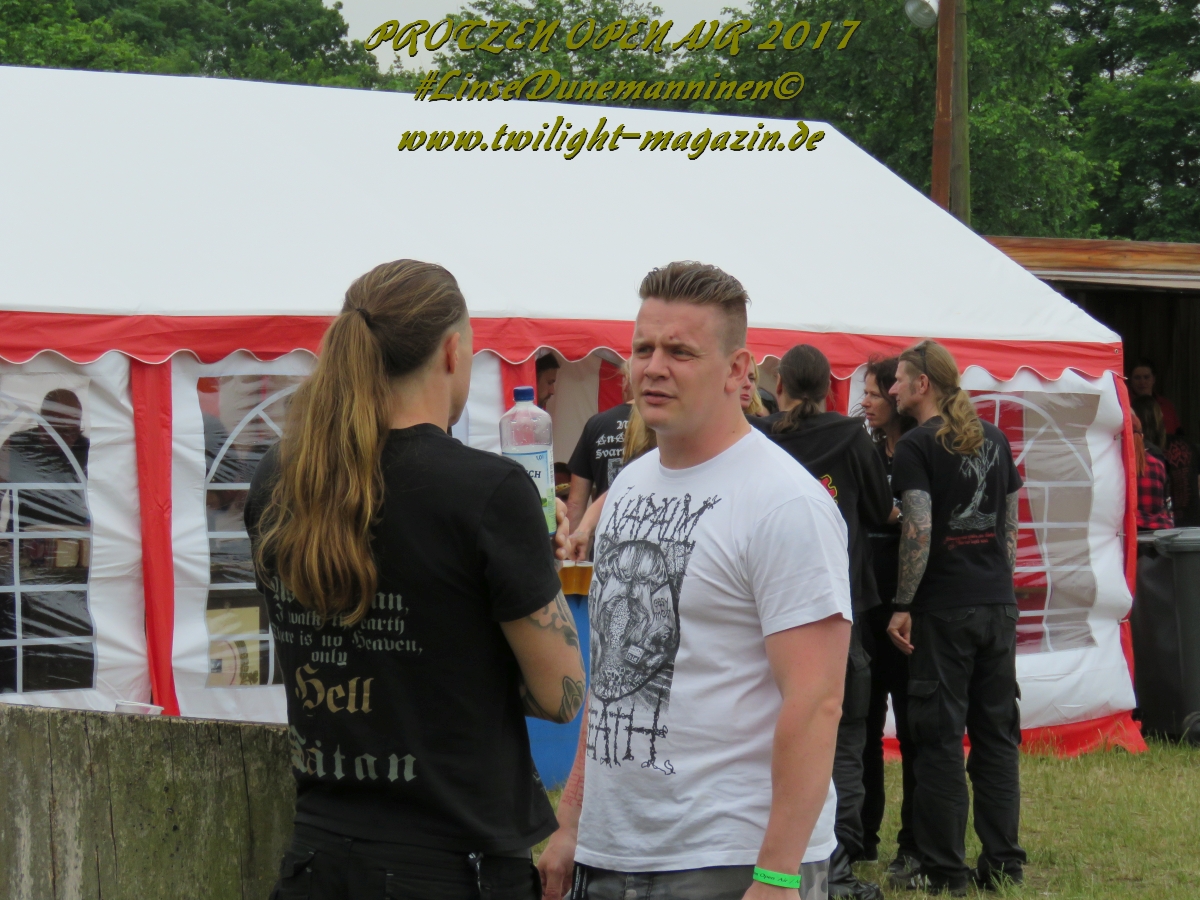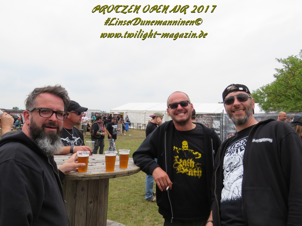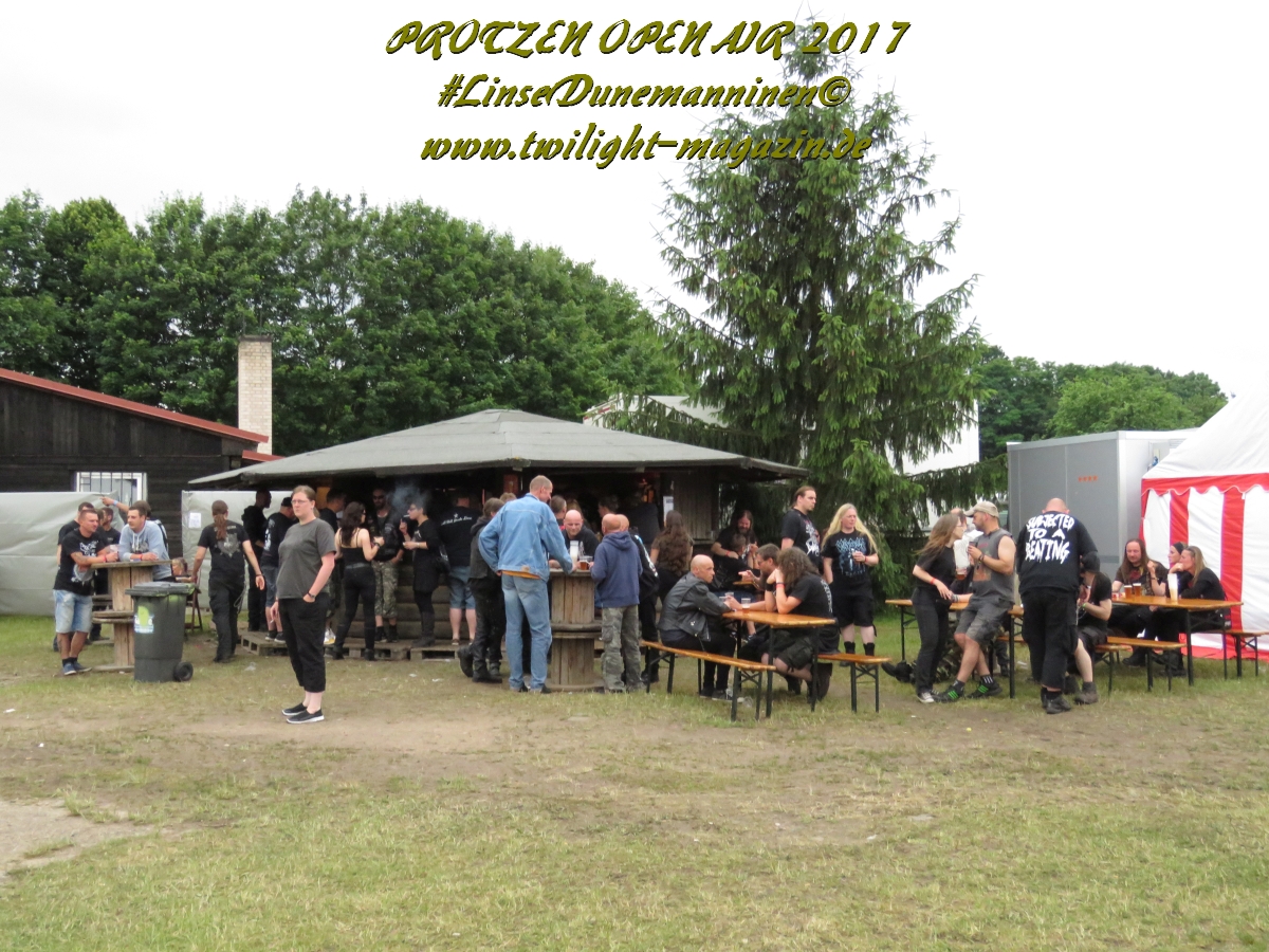 Puh, 20 Jahre Protzen Open Air, da lässt sich sogar der Deutsche Wetterdienst nicht lumpen. Mit seiner Unwetterwarnung für den Kreis Ostprignitz-Ruppin soll er am heutigen Anreisetag Recht behalten. Erste Vorboten machen sich bereits in Höhe Magdeburg auf der Warschauer Allee, besser bekannt als Autobahn 2, bemerkbar, als sei es der Leibhaftige höchst selbst, der mit jedem Kilometer den Himmel ein wenig mehr verfinstert und eine bleierne, alles erdrückende Schwüle unaufhaltsam durch die Lüftungsschlitze meines Gefährts zu schicken scheint. Auf dem letzten Viertel meiner bis dahin reibungslos verlaufenen Anreise wähne mich schon fast in Sicherheit und freue mich schon, mein Zelt vielleicht doch noch vor der großen Flut aufbauen zu können, als mich der Stau-Troll kurz vor dem Dreieck Werder erwischt, um mich danach unmittelbar in eine unheilvolle, schwarze Wetter-Wand zu treiben, in der Thor seinen Hammer ungestüm schwingt, Zeus Blitz um Blitz vom Olymp herab schleudert und Petrus sintflutartig seine Schleusen öffnet. Die letzten Kilometer auf der Autobahn werden zum Kampf mit den Elementen, der neben Fahrkunst auch die Vitalität der Bäume am Rande der Autobahn testet und die jahrelangen Planungen deutscher Siedlungswasserwirtschafts-Ingenieure mächtig auf die Probe stellt. Aber im Gegensatz zu den frühen Vögeln, welche sich seit den Morgenstunden auf dem Deadland-Gelände tummeln, befinde ich mich in meinem faradayschen Käfig wenigstens im Trockenen. Nach den letztjährigen Glutofen-Temperaturen nun also die Sintflut ausgerechnet zum Jubileum, denke ich mir noch, nachdem die Unwetter-Front vorüber gezogen ist und ich bei trockener aber kaum weniger grimmiger Witterung endlich das "Wohnzimmer" für die kommenden drei Tage erreiche. Ein schlechtes Omen? Weit gefehlt, das Wetter wird an diesem Wochenende zwar äußerst launisch und wechselhaft bleiben aber Crew, Bands und Fans kommen nicht nach Protzen, um Trübsal zu blasen, sondern um den Heavy Metal zu zelebrieren, zu feiern und zu huldigen. Und da ist für (schlechtes) Wetter nun mal kein Platz.