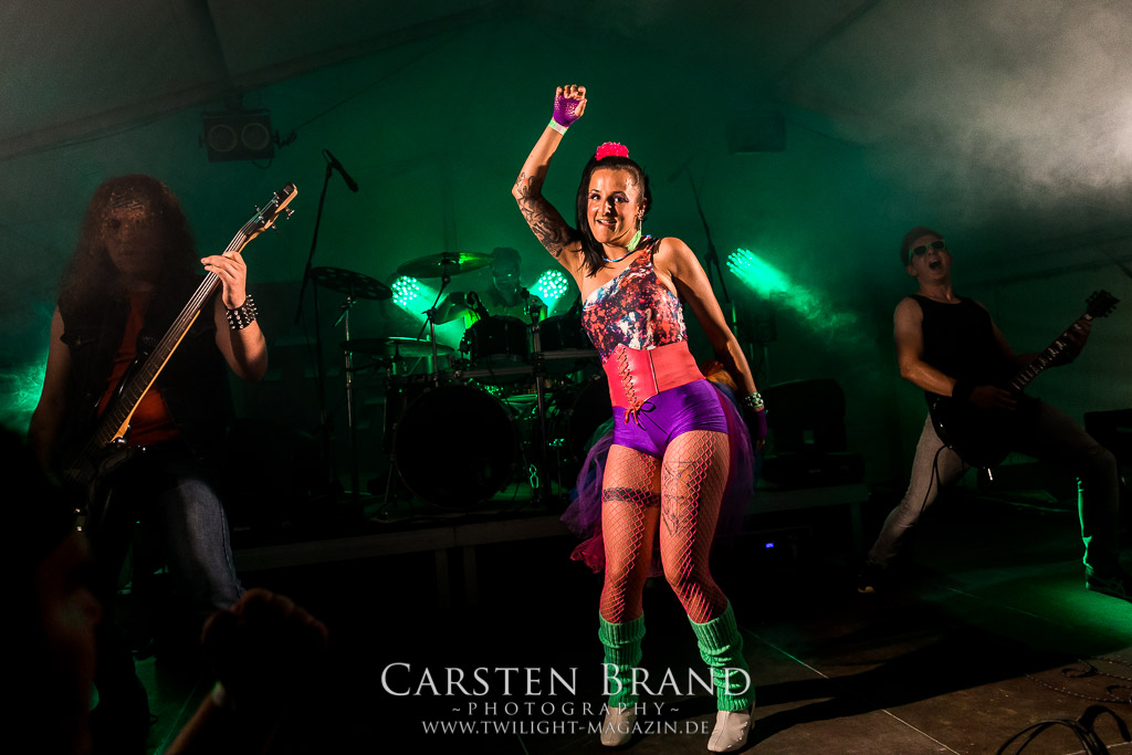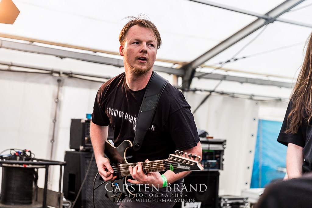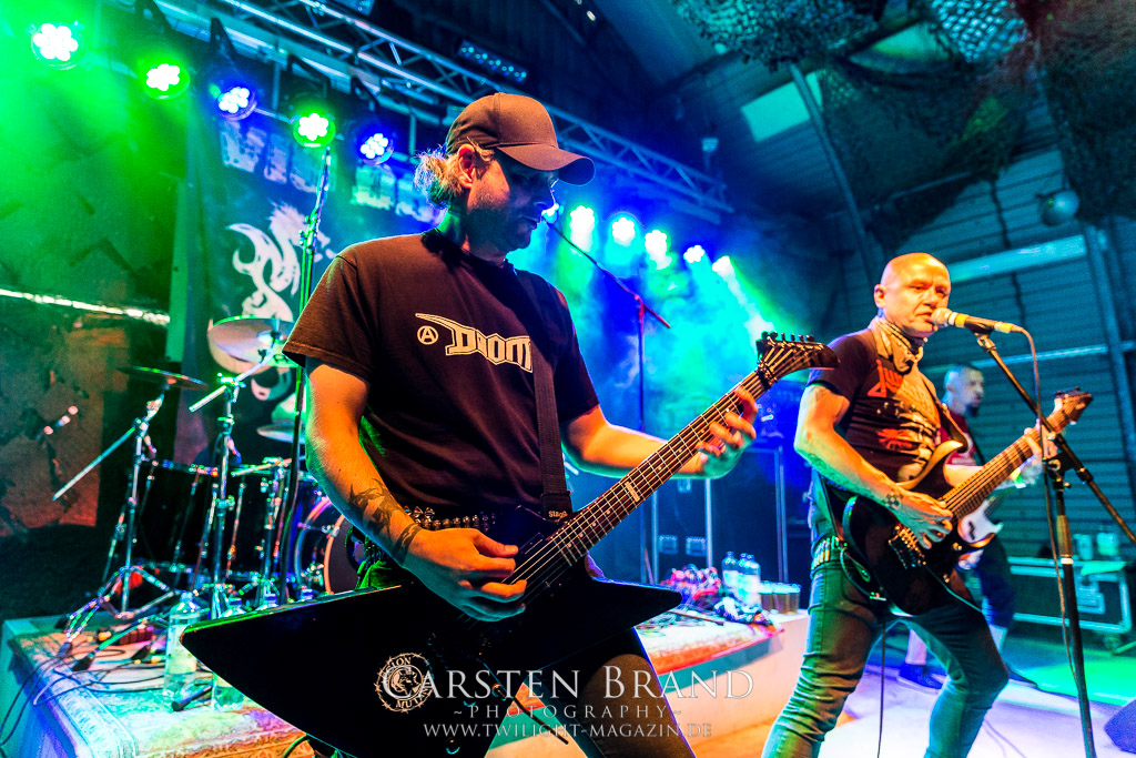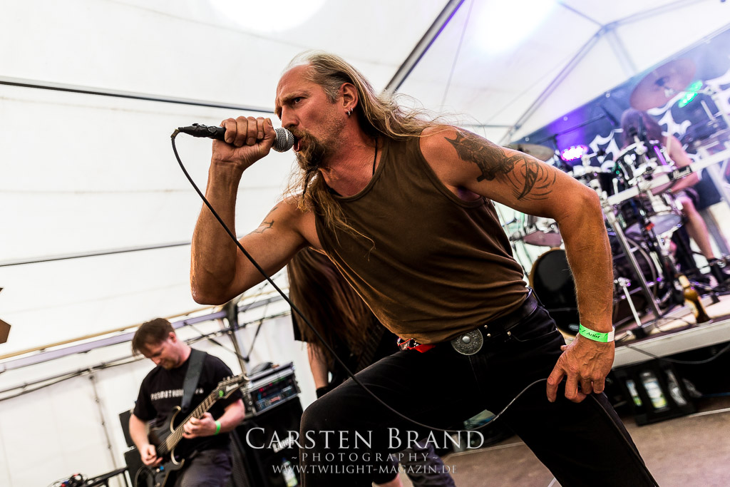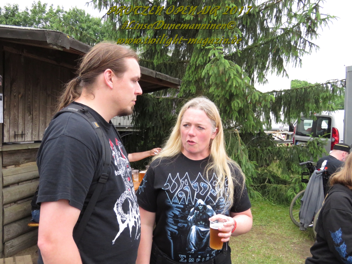 Puh, 20 Jahre Protzen Open Air, da lässt sich sogar der Deutsche Wetterdienst nicht lumpen. Mit seiner Unwetterwarnung für den Kreis Ostprignitz-Ruppin soll er am heutigen Anreisetag Recht behalten. Erste Vorboten machen sich bereits in Höhe Magdeburg auf der Warschauer Allee, besser bekannt als Autobahn 2, bemerkbar, als sei es der Leibhaftige höchst selbst, der mit jedem Kilometer den Himmel ein wenig mehr verfinstert und eine bleierne, alles erdrückende Schwüle unaufhaltsam durch die Lüftungsschlitze meines Gefährts zu schicken scheint. Auf dem letzten Viertel meiner bis dahin reibungslos verlaufenen Anreise wähne mich schon fast in Sicherheit und freue mich schon, mein Zelt vielleicht doch noch vor der großen Flut aufbauen zu können, als mich der Stau-Troll kurz vor dem Dreieck Werder erwischt, um mich danach unmittelbar in eine unheilvolle, schwarze Wetter-Wand zu treiben, in der Thor seinen Hammer ungestüm schwingt, Zeus Blitz um Blitz vom Olymp herab schleudert und Petrus sintflutartig seine Schleusen öffnet. Die letzten Kilometer auf der Autobahn werden zum Kampf mit den Elementen, der neben Fahrkunst auch die Vitalität der Bäume am Rande der Autobahn testet und die jahrelangen Planungen deutscher Siedlungswasserwirtschafts-Ingenieure mächtig auf die Probe stellt. Aber im Gegensatz zu den frühen Vögeln, welche sich seit den Morgenstunden auf dem Deadland-Gelände tummeln, befinde ich mich in meinem faradayschen Käfig wenigstens im Trockenen. Nach den letztjährigen Glutofen-Temperaturen nun also die Sintflut ausgerechnet zum Jubileum, denke ich mir noch, nachdem die Unwetter-Front vorüber gezogen ist und ich bei trockener aber kaum weniger grimmiger Witterung endlich das "Wohnzimmer" für die kommenden drei Tage erreiche. Ein schlechtes Omen? Weit gefehlt, das Wetter wird an diesem Wochenende zwar äußerst launisch und wechselhaft bleiben aber Crew, Bands und Fans kommen nicht nach Protzen, um Trübsal zu blasen, sondern um den Heavy Metal zu zelebrieren, zu feiern und zu huldigen. Und da ist für (schlechtes) Wetter nun mal kein Platz.
