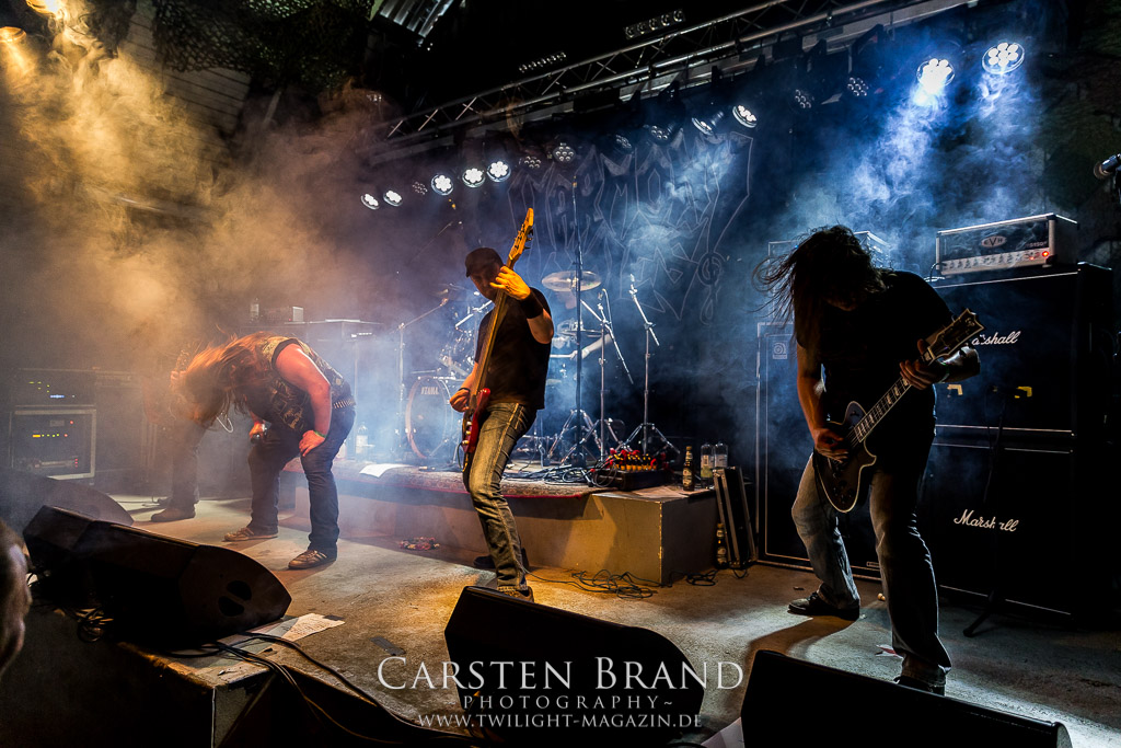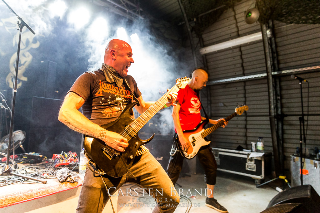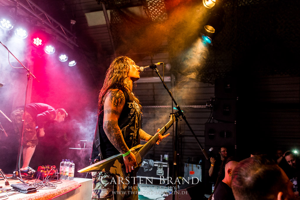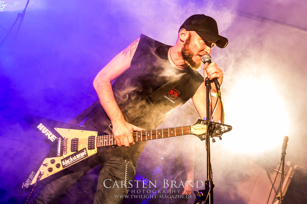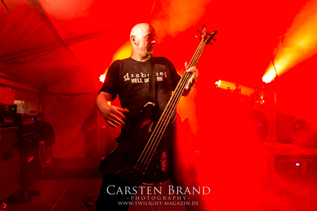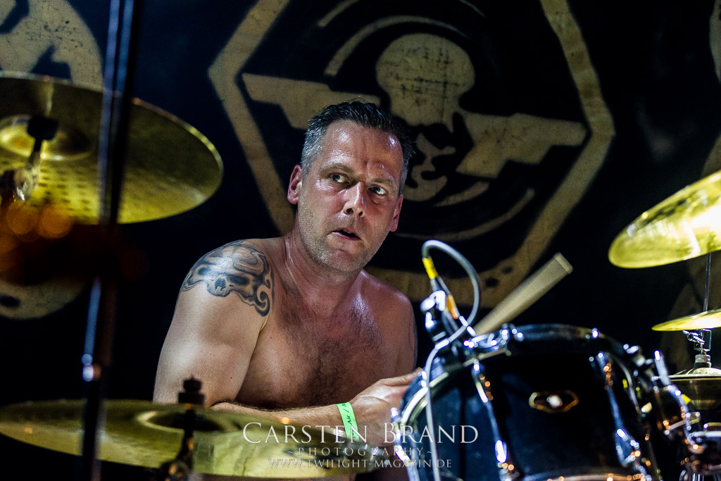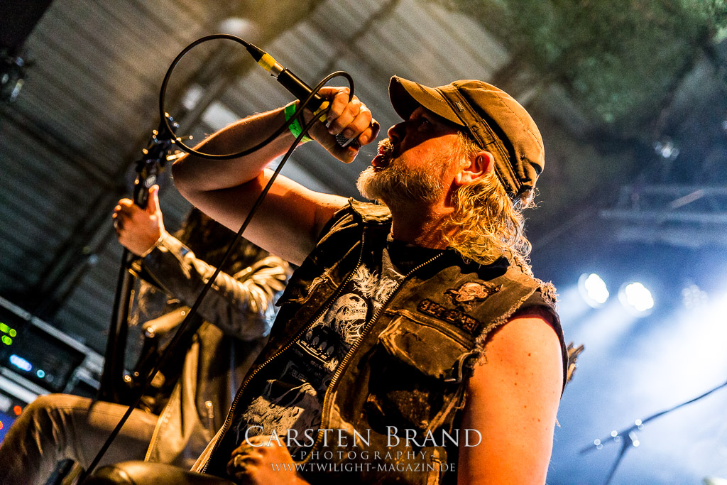 Dass die Band ihr stilistisches Alleinstellungsmerkmal, nämlich die ungarischen Folklore-Einflüsse, auf ihren zukünftigen Veröffentlichungen zunehmend vernachlässigte, führte nicht nur dazu, dass sich das Quartett spätestens ab "Destroy" zunehmend aus meiner Hörweite verabschiedete, sondern, dass ich mit Ektomorf bis heute vornehmlich Musik verbinde, die wie Sepultura klingt, als diese schon scheiße waren. Doch die Band funktioniert hervorragend und sogar als Co-Headliner ziehen sie die Leute nicht nur in Scharen in den Hangar, sondern wissen diese auch noch amtlich zum Toben zu bringen, so dass ich neidlos anerkennen muss, dass diese Formation, wenn sie auch musikalisch nicht originell sein mag, nach wie vor über überragende Live-Qualitäten verfügt. Und auch die Streitmacht Bergisch´ Land weiß rund drei Stunden zuvor zu überzeugen. Der melodische Death Metal mit deutschen Texten ist mittlerweile erfreulich weit entfernt von Pagan Metal - Klischees und wildert stattdessen in Amon Amarth´schen gefilden, aus der Zeit, als diese noch musikalisch ernstzunehmen waren. Somit muss ich auch hier konstatieren, dass Obscurity, die wie das Protzen in diesem Jahr bereits den zwanzigsten Geburtstag feiern, sich selbst mit diesem durchaus abgefeierten Auftritt ein schönes Präsent machen, dass musikalisch eine weitere Abwechslung zwischen all dem Geballer ist. Was sonst noch passierte? Nachdem Auftritt der emsländischen Melodic-Deather ISLAY beginnt mit DISASTER K. F. W. im Zelt der Auftakt zum Abend der ostdeutschen Metal-Legenden. Auch wenn das seit 1985 aktive Quintett um den ehemaligen Reiter-Drummer Skeleton die Intensität ihres bärenstarken jüngsten Albums "Pieces" nicht voll auf die Bühne bringen kann, so machen Songs wie "The Black Death" doch ordentlich Laune und bereiten den Boden, für das, was da noch kommen soll.