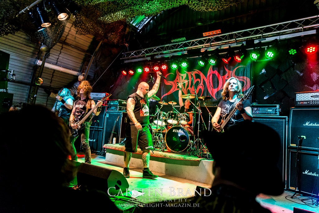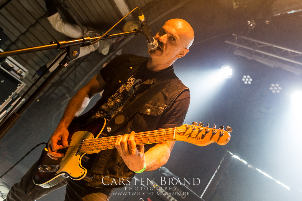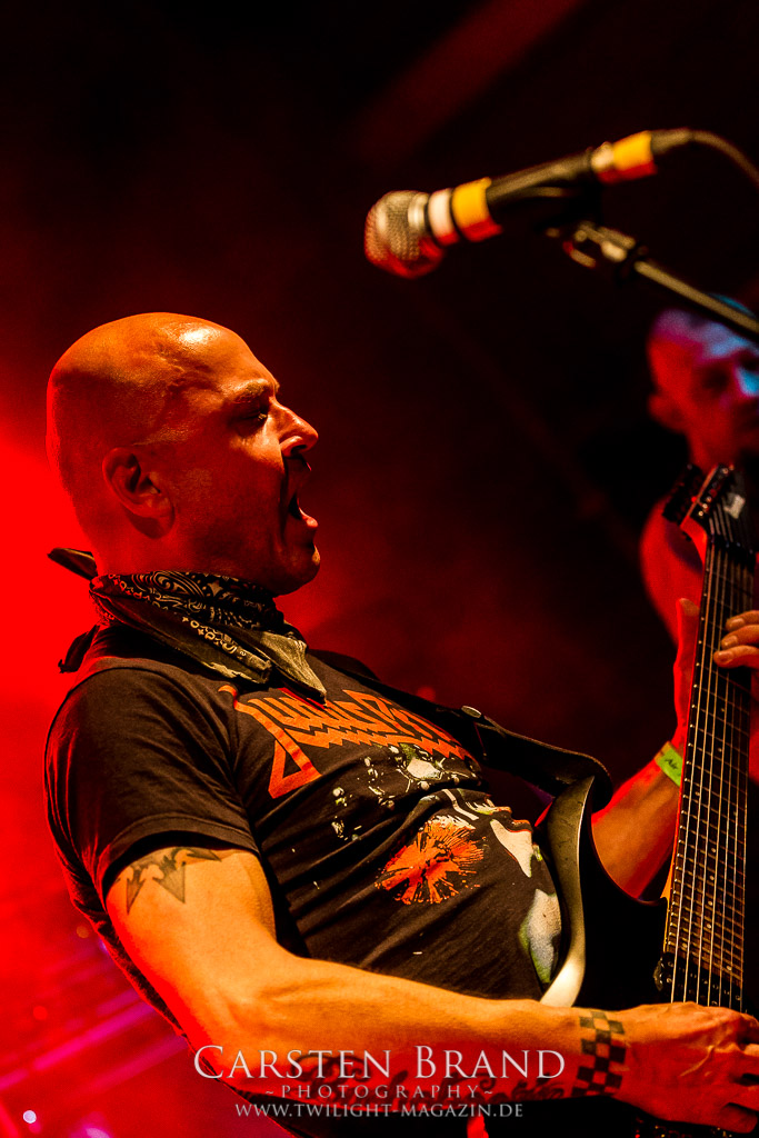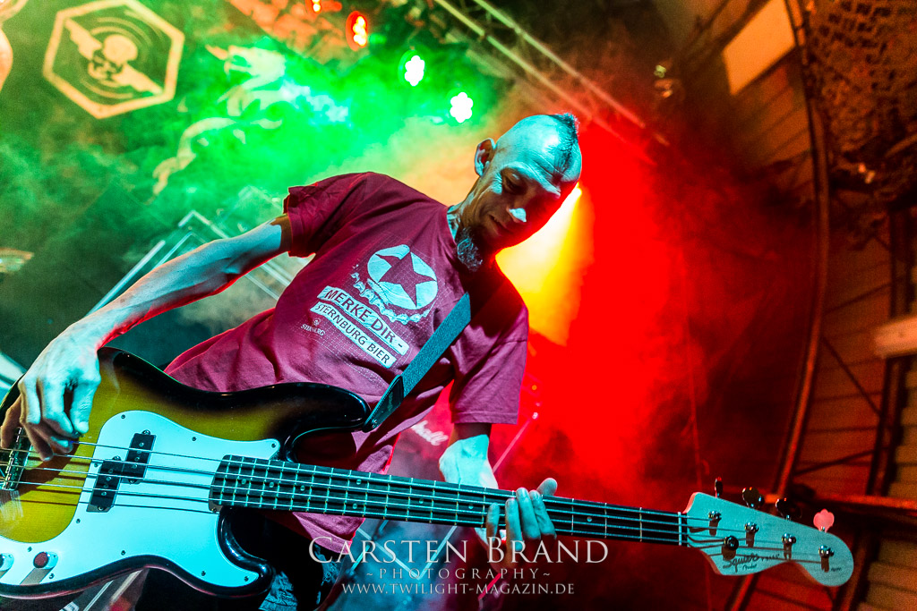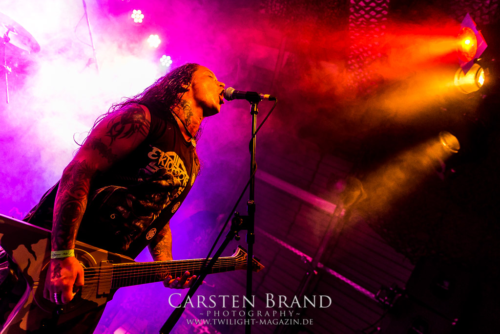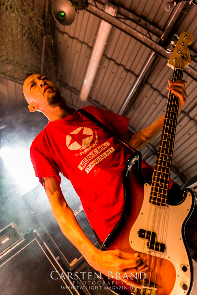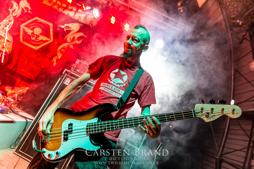 Dass die Band ihr stilistisches Alleinstellungsmerkmal, nämlich die ungarischen Folklore-Einflüsse, auf ihren zukünftigen Veröffentlichungen zunehmend vernachlässigte, führte nicht nur dazu, dass sich das Quartett spätestens ab "Destroy" zunehmend aus meiner Hörweite verabschiedete, sondern, dass ich mit Ektomorf bis heute vornehmlich Musik verbinde, die wie Sepultura klingt, als diese schon scheiße waren. Doch die Band funktioniert hervorragend und sogar als Co-Headliner ziehen sie die Leute nicht nur in Scharen in den Hangar, sondern wissen diese auch noch amtlich zum Toben zu bringen, so dass ich neidlos anerkennen muss, dass diese Formation, wenn sie auch musikalisch nicht originell sein mag, nach wie vor über überragende Live-Qualitäten verfügt. Und auch die Streitmacht Bergisch´ Land weiß rund drei Stunden zuvor zu überzeugen. Der melodische Death Metal mit deutschen Texten ist mittlerweile erfreulich weit entfernt von Pagan Metal - Klischees und wildert stattdessen in Amon Amarth´schen gefilden, aus der Zeit, als diese noch musikalisch ernstzunehmen waren. Somit muss ich auch hier konstatieren, dass Obscurity, die wie das Protzen in diesem Jahr bereits den zwanzigsten Geburtstag feiern, sich selbst mit diesem durchaus abgefeierten Auftritt ein schönes Präsent machen, dass musikalisch eine weitere Abwechslung zwischen all dem Geballer ist. Was sonst noch passierte? Nachdem Auftritt der emsländischen Melodic-Deather ISLAY beginnt mit DISASTER K. F. W. im Zelt der Auftakt zum Abend der ostdeutschen Metal-Legenden. Auch wenn das seit 1985 aktive Quintett um den ehemaligen Reiter-Drummer Skeleton die Intensität ihres bärenstarken jüngsten Albums "Pieces" nicht voll auf die Bühne bringen kann, so machen Songs wie "The Black Death" doch ordentlich Laune und bereiten den Boden, für das, was da noch kommen soll.