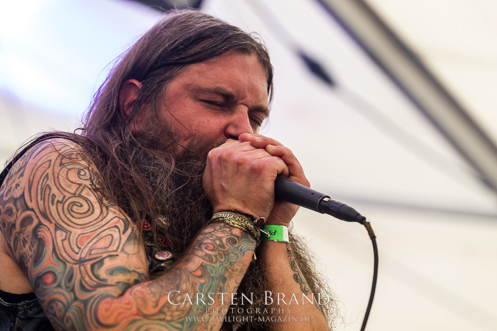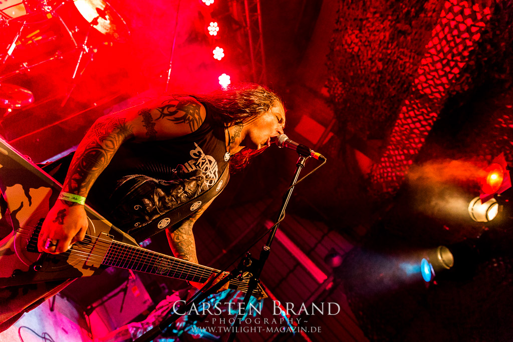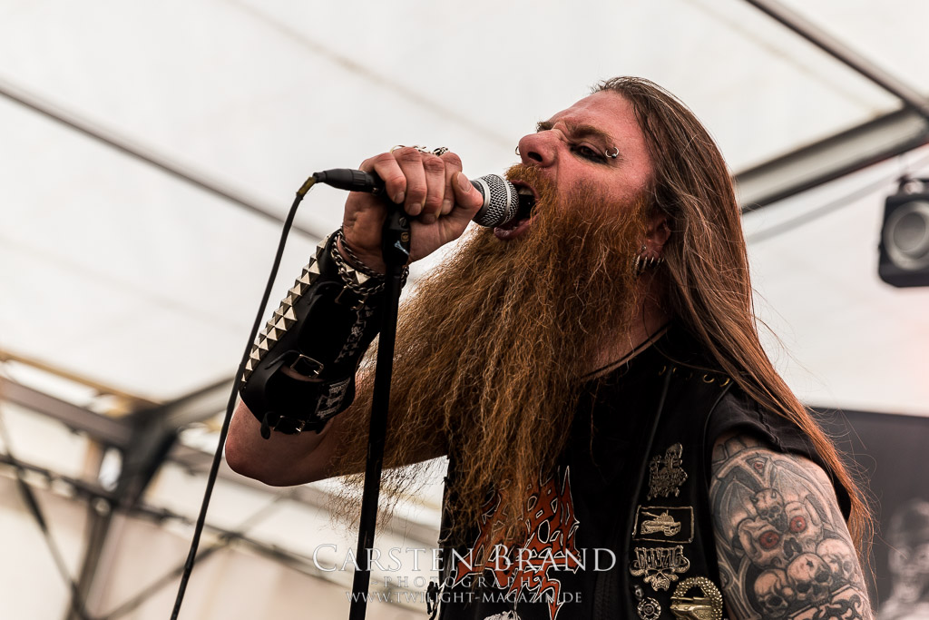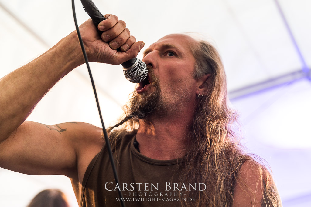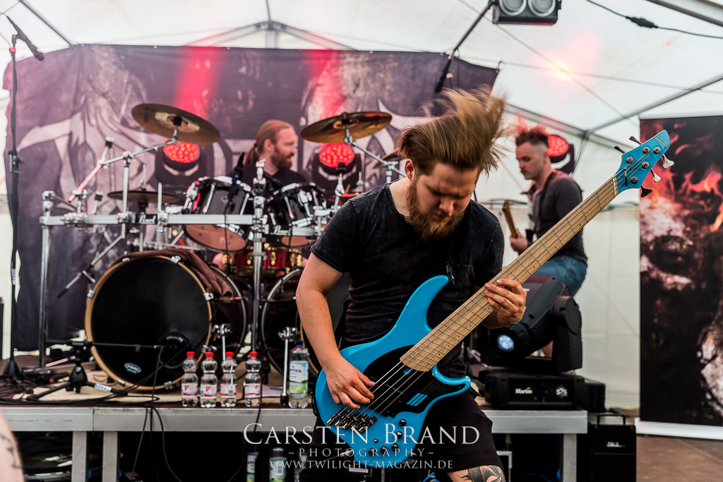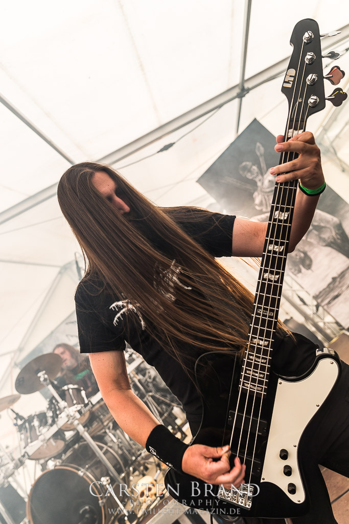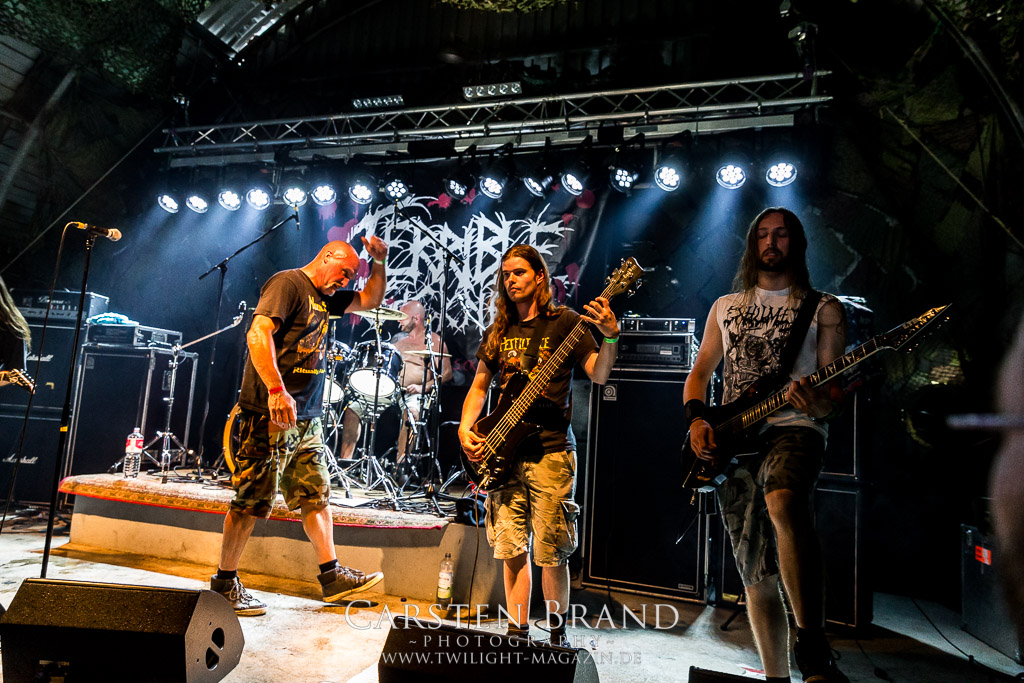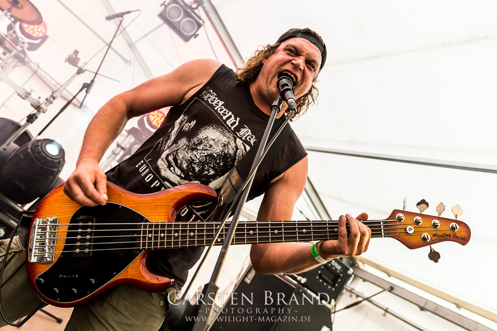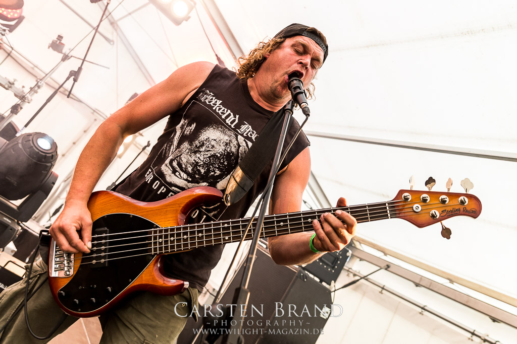 Die Magdeburger TORTURIZED haben in den letzten zehn Jahren eine gewaltige Entwicklung genommen, von der klassischen Old-School - Death Metal - Band zur modern ausgerichteten Tech-Death-Formation, und das komplett ohne Label im Rücken. Das jüngste Zeugnis "Omnivore" gleicht einer Urgewalt, die, gebündelt durch die spielerische Klasse der Musiker in kontrollierte Bahnen gelenkt wird. Das unterstreicht auch die beeindruckende halbe Stunde im Zelt, bei der der Sound heute leider nicht ganz so gut wie an den vorangegangenen Tagen ist. Dennoch würde ich mir zukünftig wieder mehr Bauch statt Kopf im Hause Torturized wünschen, sind Songs und handwerkliches Können zwar über jeden Zweifel erhaben, aber gerade Live wirkt mir das ganze mittlerweile zu klinisch, steril und klingt manchmal schon fast (Siggi, verzeih´ mir diesen Ausdruck!!!) wie Hipster - Death Metal. (JD)
