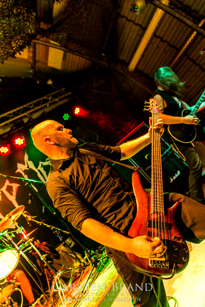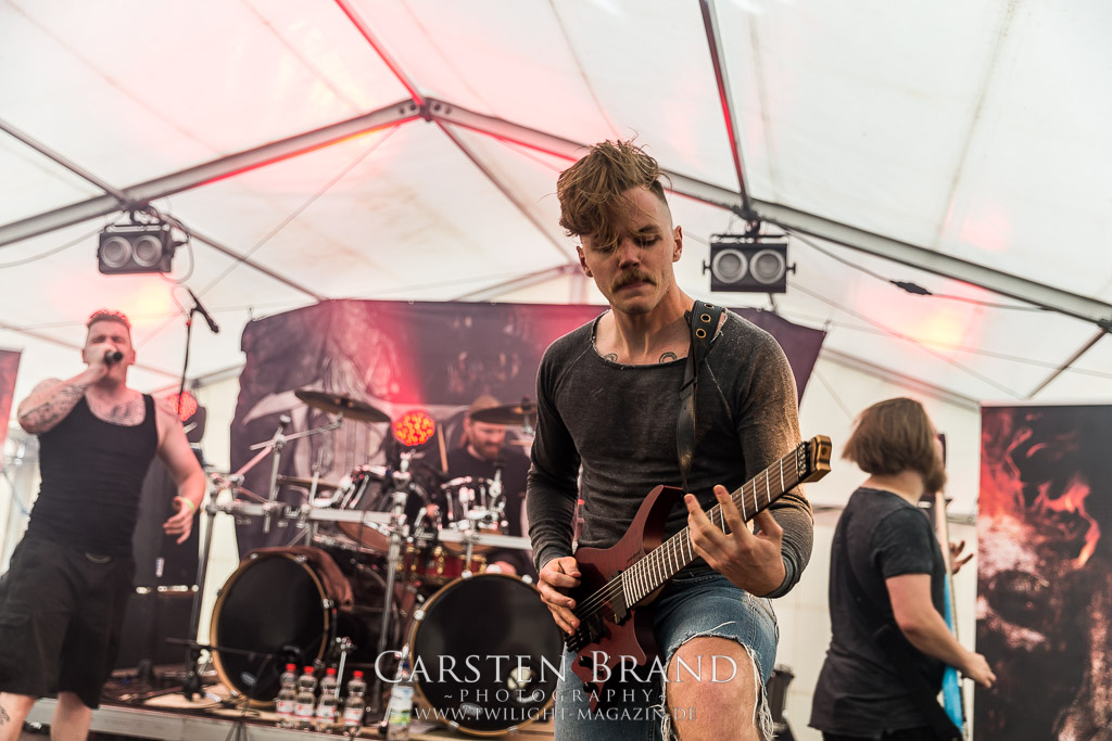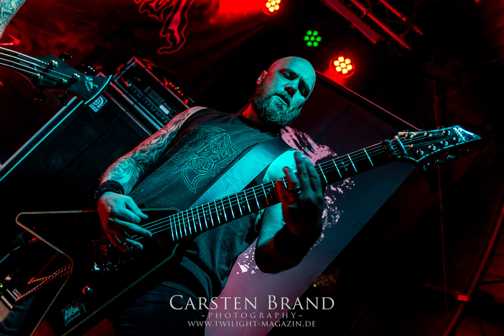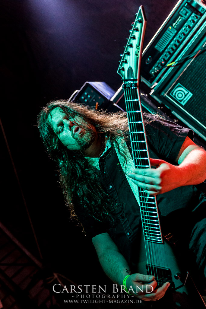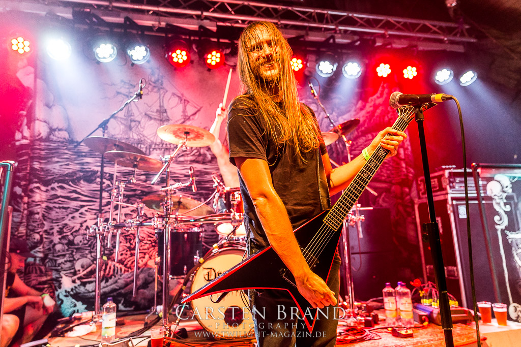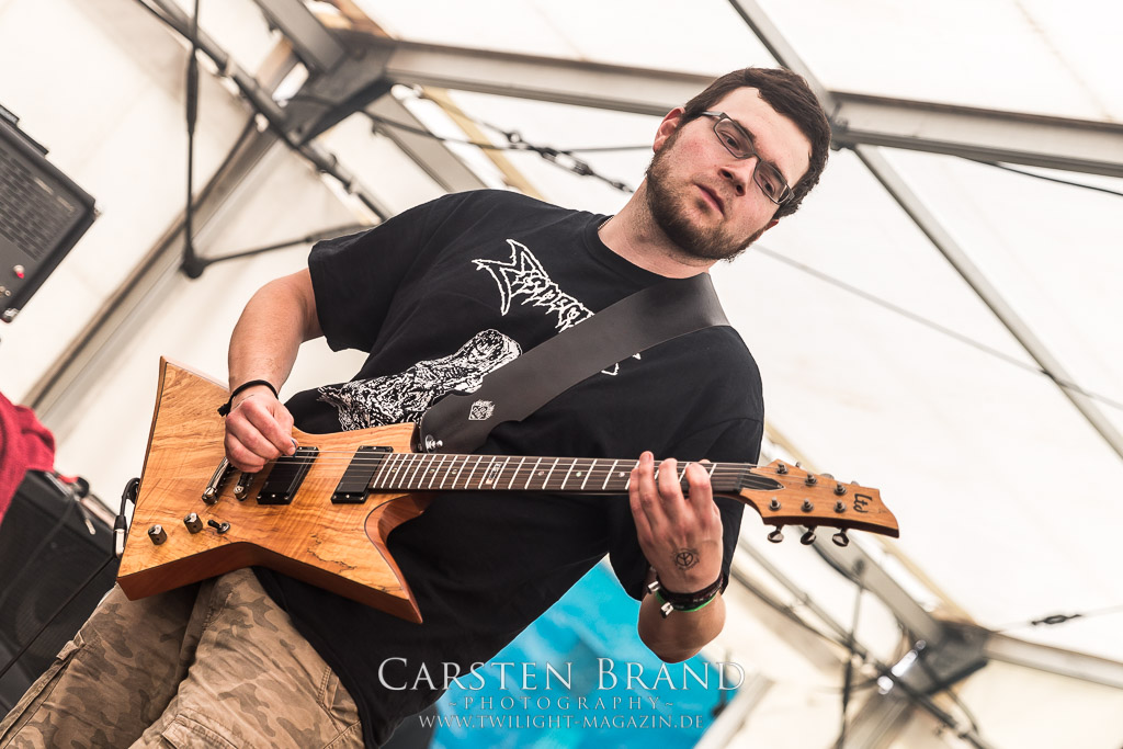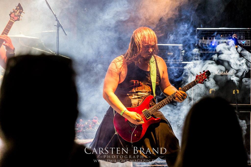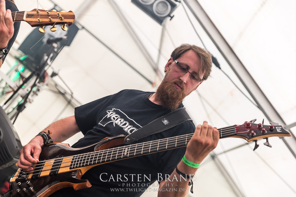 Die Magdeburger TORTURIZED haben in den letzten zehn Jahren eine gewaltige Entwicklung genommen, von der klassischen Old-School - Death Metal - Band zur modern ausgerichteten Tech-Death-Formation, und das komplett ohne Label im Rücken. Das jüngste Zeugnis "Omnivore" gleicht einer Urgewalt, die, gebündelt durch die spielerische Klasse der Musiker in kontrollierte Bahnen gelenkt wird. Das unterstreicht auch die beeindruckende halbe Stunde im Zelt, bei der der Sound heute leider nicht ganz so gut wie an den vorangegangenen Tagen ist. Dennoch würde ich mir zukünftig wieder mehr Bauch statt Kopf im Hause Torturized wünschen, sind Songs und handwerkliches Können zwar über jeden Zweifel erhaben, aber gerade Live wirkt mir das ganze mittlerweile zu klinisch, steril und klingt manchmal schon fast (Siggi, verzeih´ mir diesen Ausdruck!!!) wie Hipster - Death Metal. (JD)