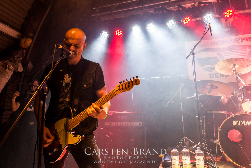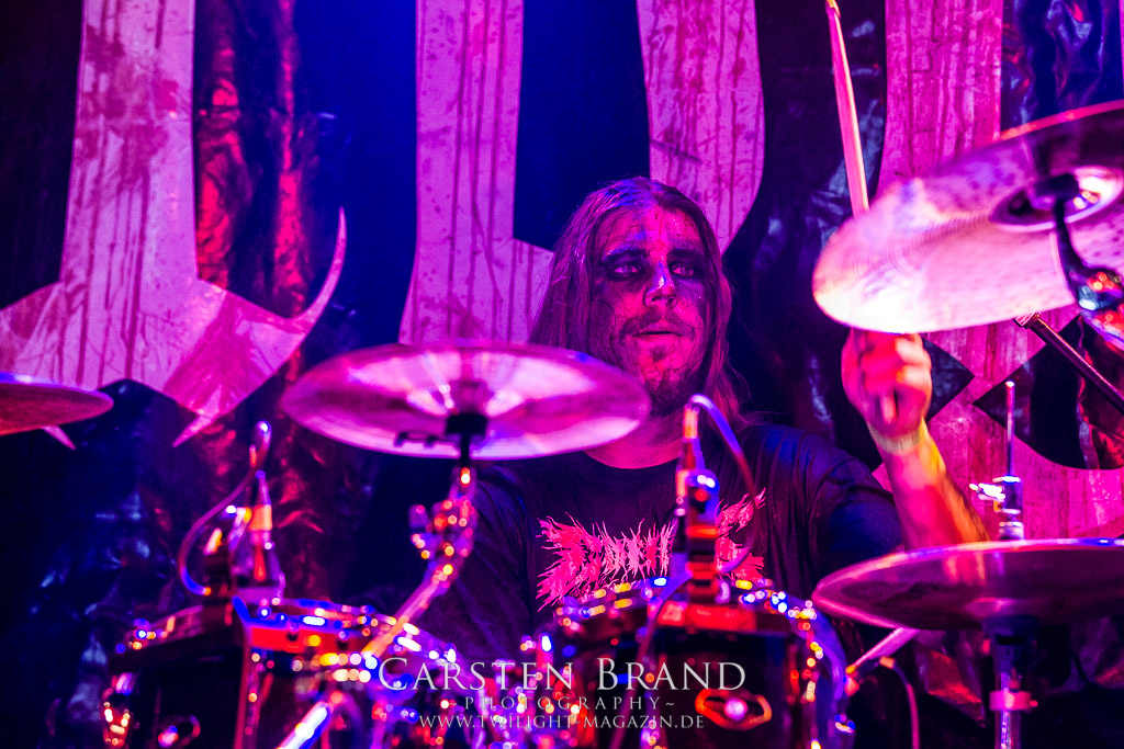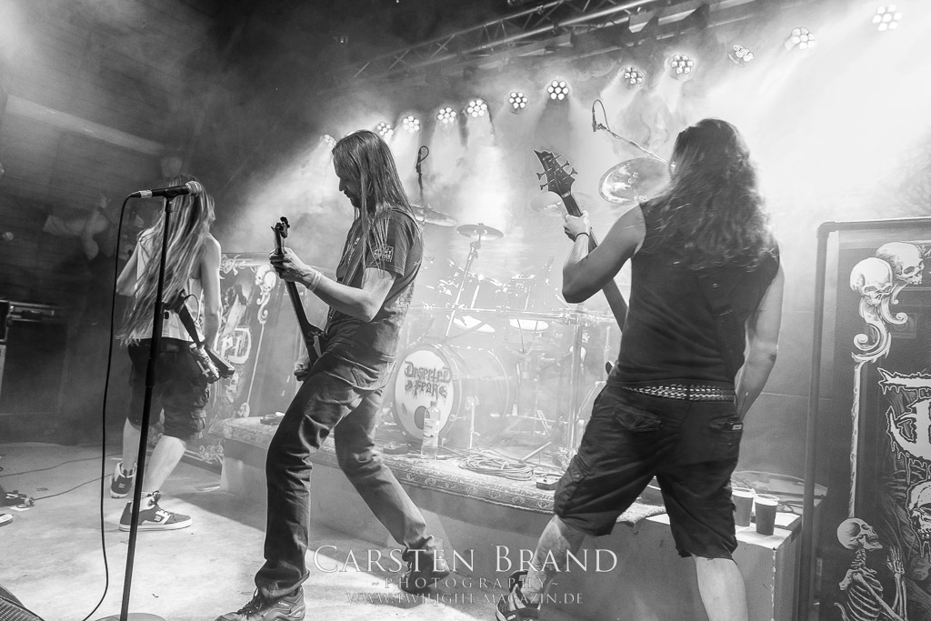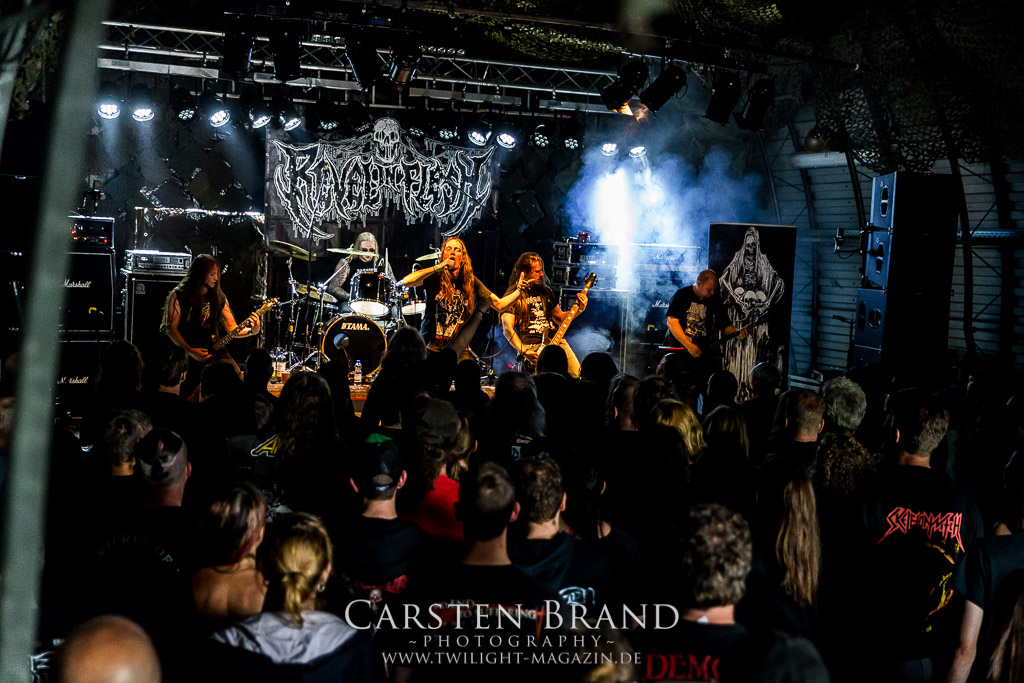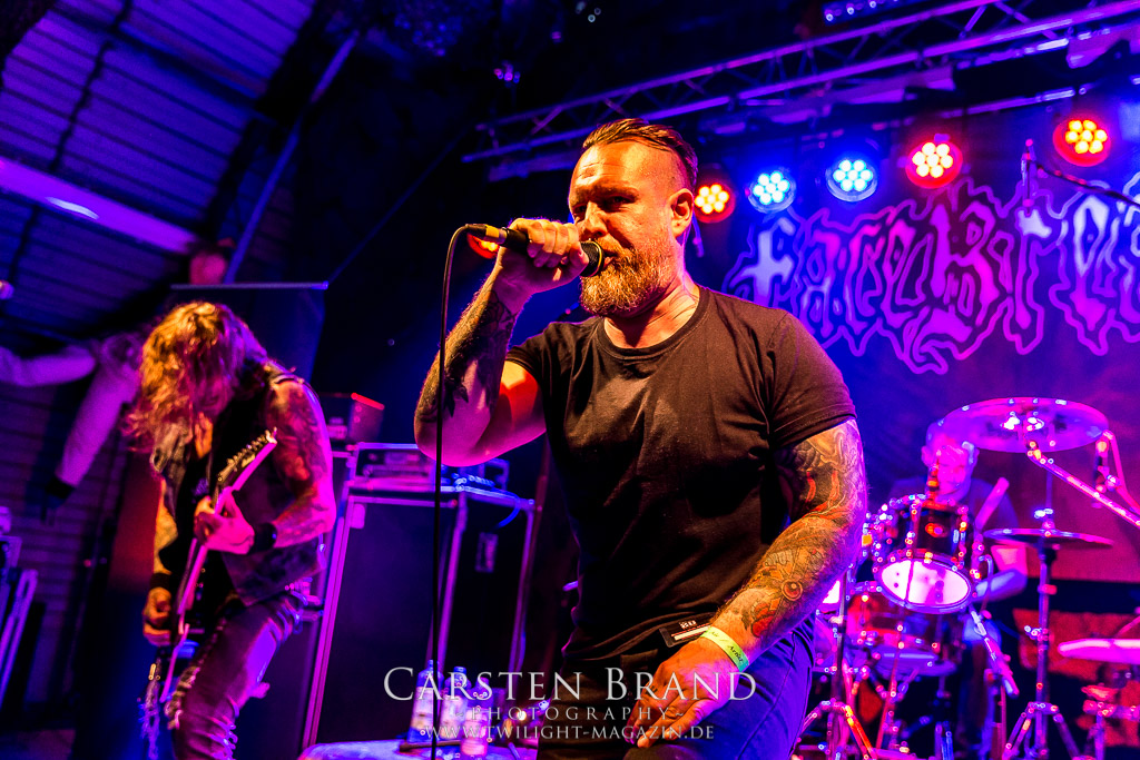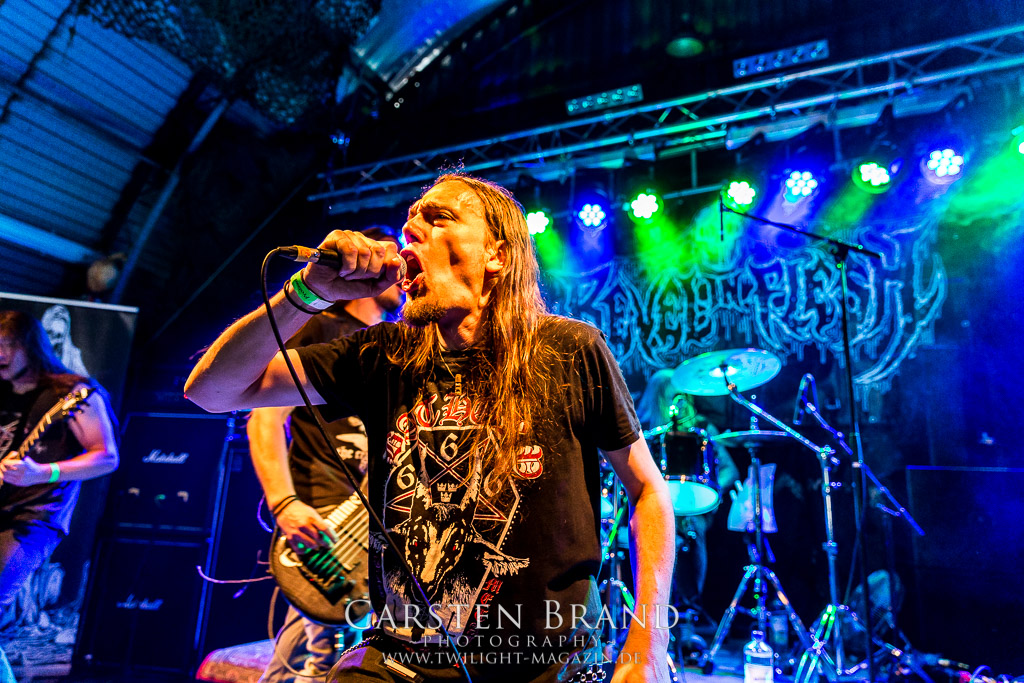 Die Schwaben von REVEL IN FLESH gastieren im Rahmen ihrer Mini-Tour mit FACEBREAKER in Protzen. Die deutschen Schwedenstahl-Anbeter sind seit ihrem letzten Auftritt 2015 wesentlich besser geworden und präsentieren einen amtlichen Abriss. Insgesamt kommen sie aber nach wie vor nicht über den Status einer - wenn auch sehr guten - Dismember-Gedächtniskapelle hinaus. Mir fehlt hier einfach das letzte, gewisse Etwas, was die schwedischen Kollegen LIK zweifelsohne haben. Immerhin, ihren deutschen Kollegen von Fleshcrawl haben Revel In Flesh mittlerweile den Rang ganz klar abgelaufen. Und sie gefallen mir auch einmal mehr besser als ihre Tourkollegen von Facebreaker, eine Schweden-Band, die so gar nicht nach typischen Schwedensound tönt. Knochentrocken, brutal und direkt ins Gesicht und irgendwie beliebig und austauschbar konnte mich das Quintett noch nie wirklich hinter dem Ofen hervor locken und ich denke das wird in diesem Leben auch nichts mehr.