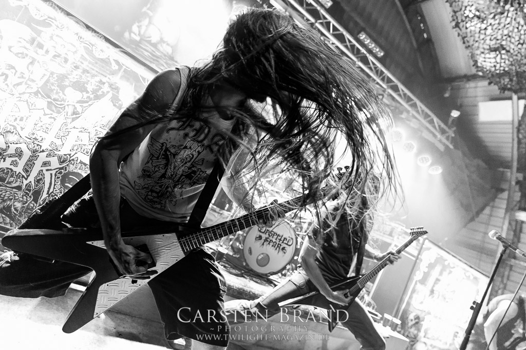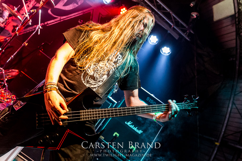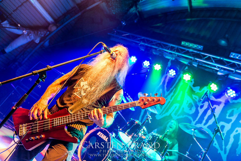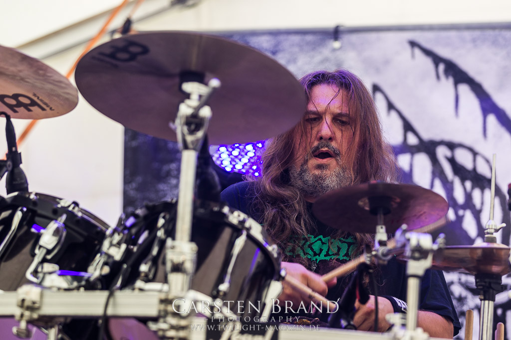 Paul Speckmann wirkt nicht nur optisch wie Vater Abraham, er ist tatsächlich der Methusalem der Death Metal - Szene. Zwar hat der MASTER-Frontmann musikalisch in über drei Dekaden meiner Ansicht nie die ganz hochkarätigen Klassiker erschaffen, sein Einfluss und vor allem seine musikalische Beständigkeit und Präsenz ist jedoch unbestritten und das rechtfertigt tatsächlich die hohe Position im Billing. Knochentrocken rotzt der Wahl-Tscheche mit seinen beiden Mitstreitern die tief im Thrash verwurzelten Brecher aus 35 Jahren Bandgeschichte aus dem Ärmel. Auch wenn ich dem alten Mann immer noch nachtrage, dass er Krabathor einst auseinanderdividiert hat, Master werden an diesem Abend ihrer Position gerecht.