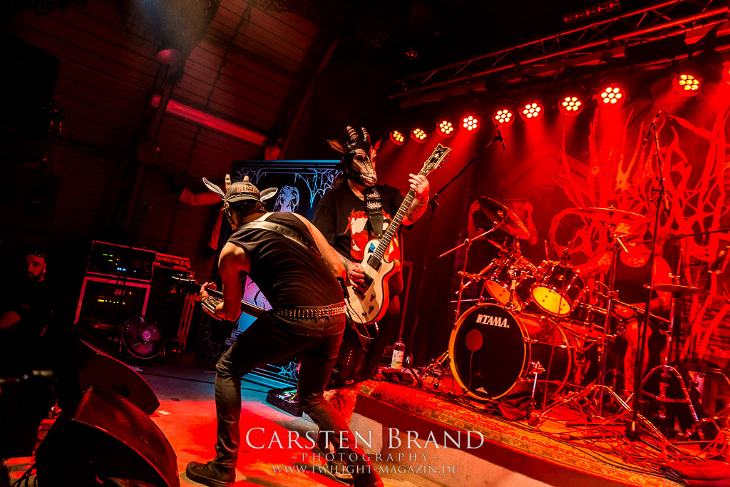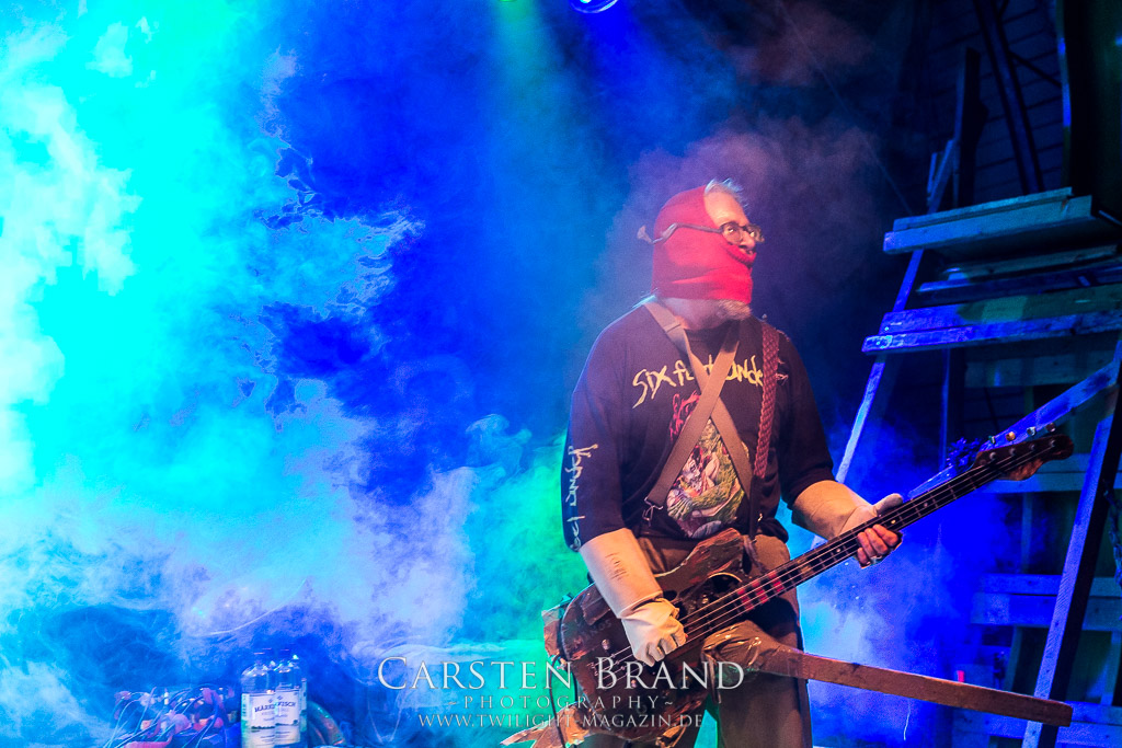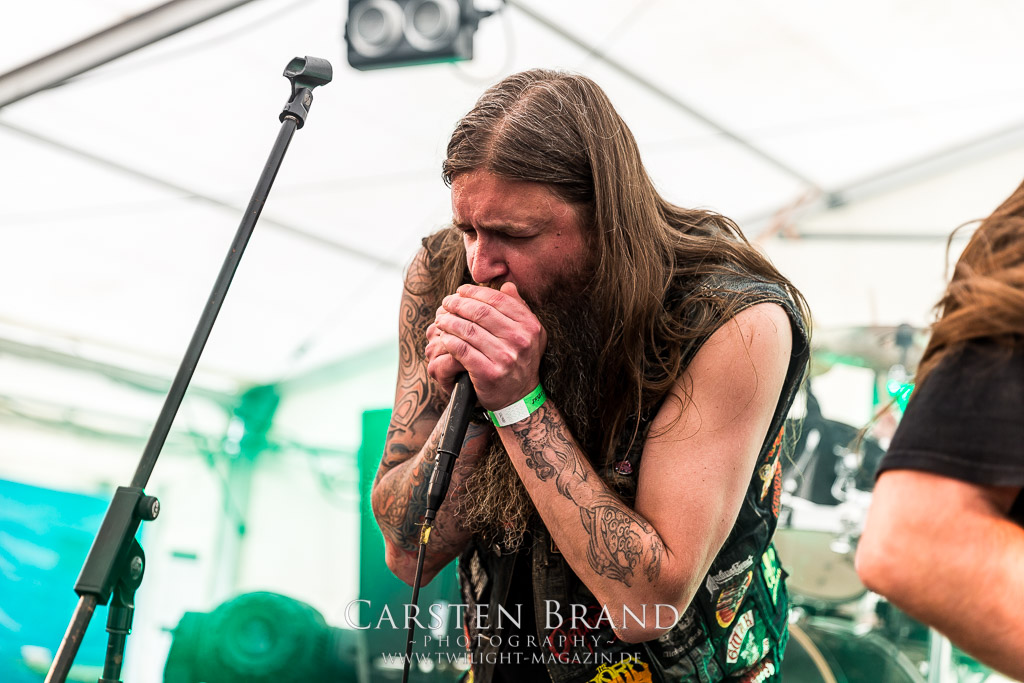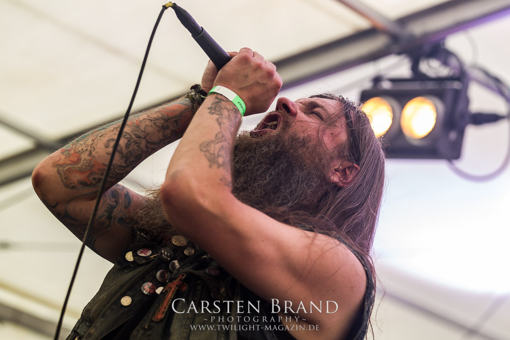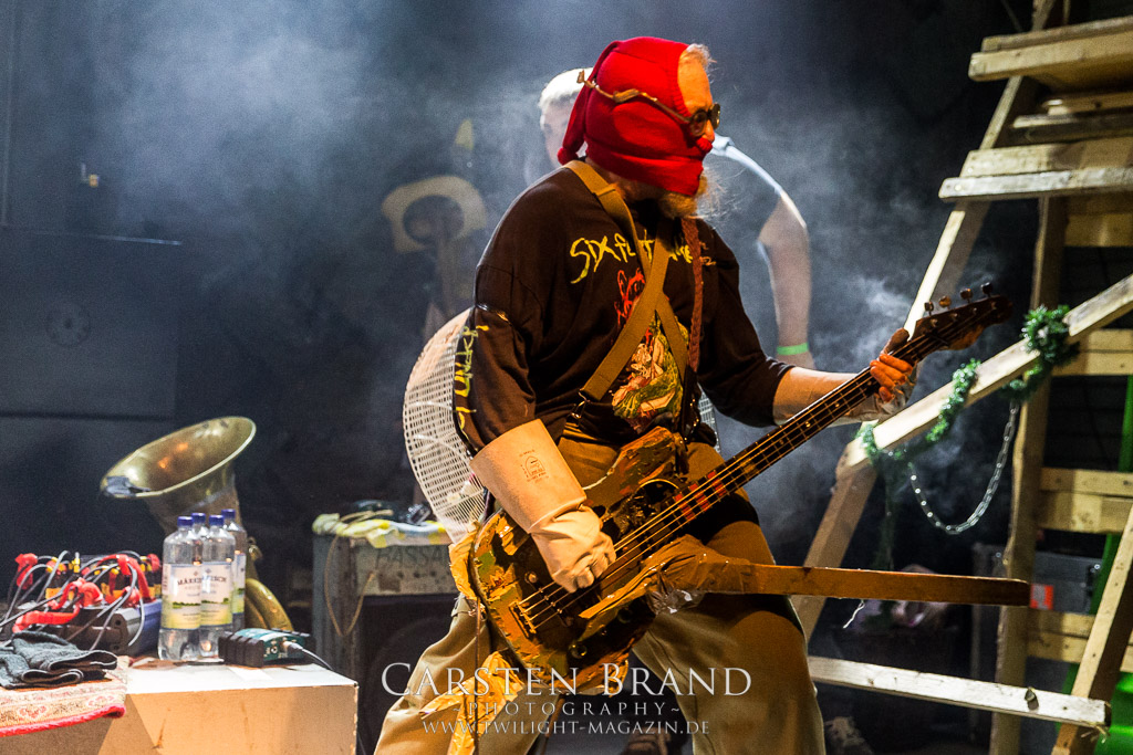 MILKING THE GOATMACHINE wissen da im Anschluss deutlich besser zu mobilisieren. Das Grindcore Trio mit den Ziegenmasken und der Vorliebe für Euro-Dance um den brüllenden Trommler Goatleeb Udder versteht sich durchaus auf brutalen, simplen aber abwechslungsreichen Death-Grind mit einer ordentlichen Prise Ironie, ohne dabei albern zu wirken. Auch wenn nicht wirklich meine musikalische Baustelle, so lasse ich mich am Ende doch gerne packen und mitreißen. Ganz starke Performance, die zeigt, wieso die Berliner schon seit geraumer Zeit in aller Munde sind. Wer sich übrigens in der Zwischenzeit fragt, wo denn die BEARDED BASTARDS und SUCCUBUS abgeblieben sind, welche gemeinsam mit Atomwinter das Zelt gerockt haben, dem sei gesagt, dass die Band- und Bühnenaufstockung durchaus Vorteile aber eben auch Nachteile hat, wenn es eben Schlag auf Schlag ohne Unterbrechung durchgeht. Und da das Zelebrieren des Wiedersehens und die Gespräche bei diversen Getränken mit vielen Freunden und Wegbegleitern im Rahmen der Protzen-Familie ein wesentlicher Bestandteil dieses Festivals ist, möge man mir es nachsehen, wenn ich diese beiden Bands unterschlage, um genussvoll durchzuschnaufen.