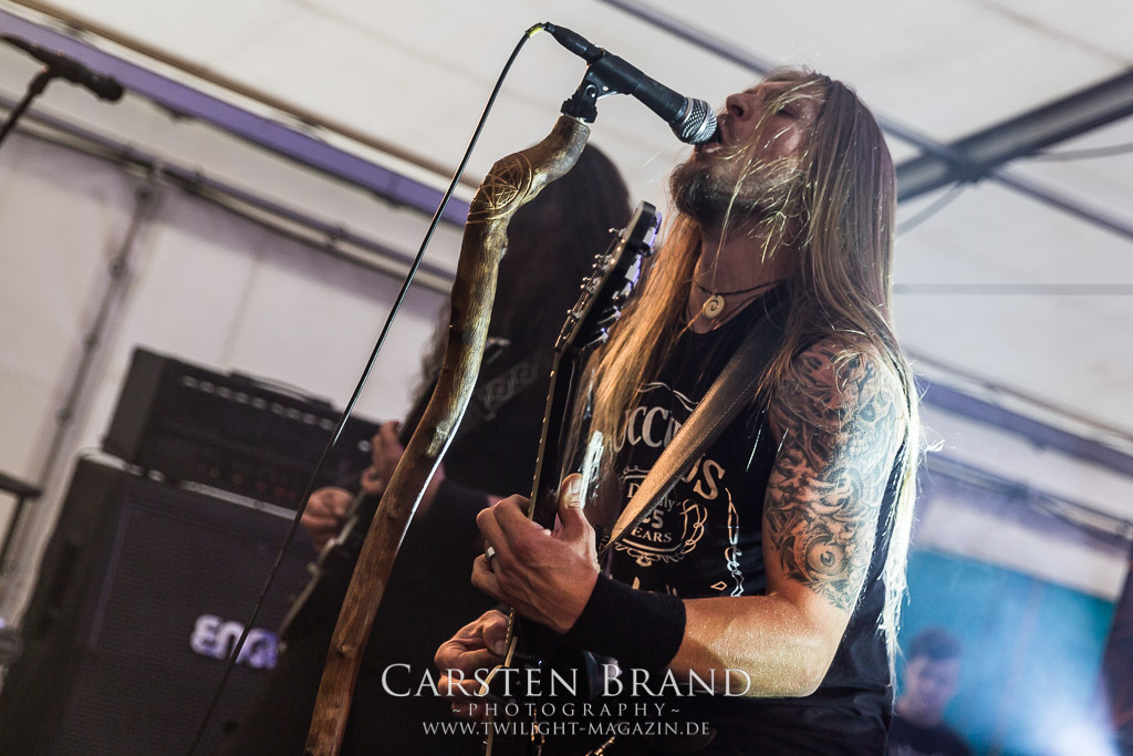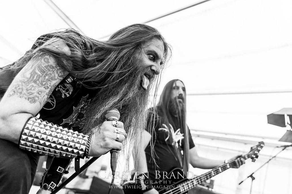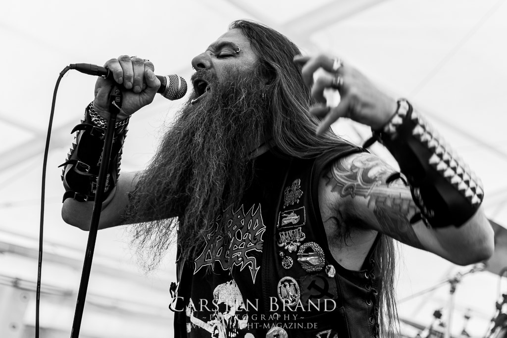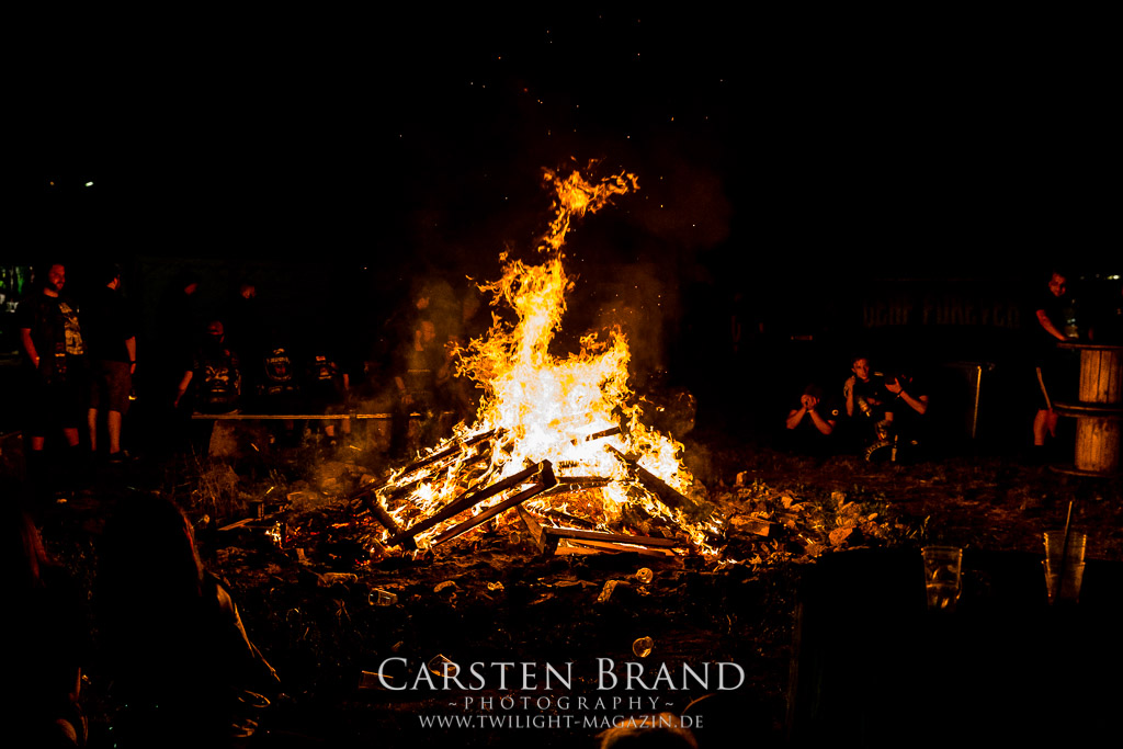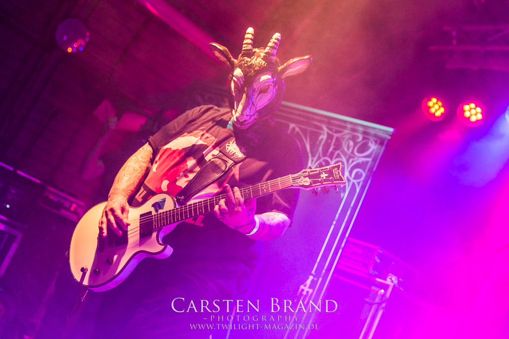 MILKING THE GOATMACHINE wissen da im Anschluss deutlich besser zu mobilisieren. Das Grindcore Trio mit den Ziegenmasken und der Vorliebe für Euro-Dance um den brüllenden Trommler Goatleeb Udder versteht sich durchaus auf brutalen, simplen aber abwechslungsreichen Death-Grind mit einer ordentlichen Prise Ironie, ohne dabei albern zu wirken. Auch wenn nicht wirklich meine musikalische Baustelle, so lasse ich mich am Ende doch gerne packen und mitreißen. Ganz starke Performance, die zeigt, wieso die Berliner schon seit geraumer Zeit in aller Munde sind. Wer sich übrigens in der Zwischenzeit fragt, wo denn die BEARDED BASTARDS und SUCCUBUS abgeblieben sind, welche gemeinsam mit Atomwinter das Zelt gerockt haben, dem sei gesagt, dass die Band- und Bühnenaufstockung durchaus Vorteile aber eben auch Nachteile hat, wenn es eben Schlag auf Schlag ohne Unterbrechung durchgeht. Und da das Zelebrieren des Wiedersehens und die Gespräche bei diversen Getränken mit vielen Freunden und Wegbegleitern im Rahmen der Protzen-Familie ein wesentlicher Bestandteil dieses Festivals ist, möge man mir es nachsehen, wenn ich diese beiden Bands unterschlage, um genussvoll durchzuschnaufen.