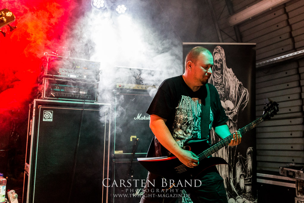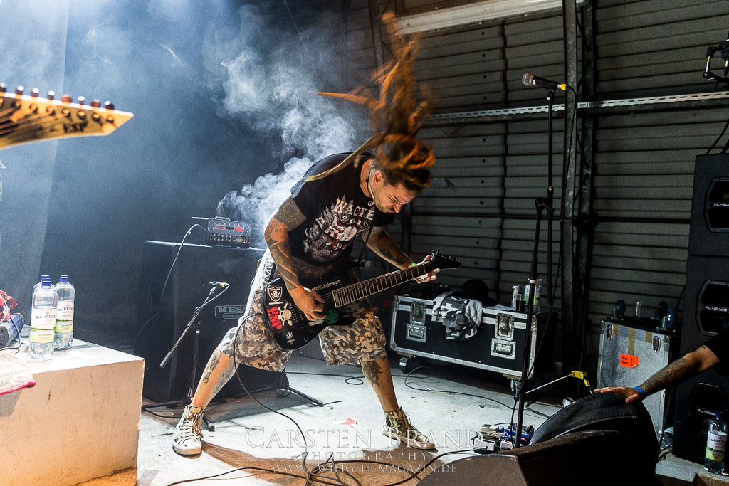 In der Nacht hat es sich zwar mächtig abgekühlt aber drückend, windig und regnerisch ist es nach wie vor, so dass sich erstmals seit meinem eigenen, relativ späten Protzen-Debut nicht der Drang einstellt, einen vormittäglichen Ausflug zu den nahe gelegenen Badeseen zu unternehmen. Was nicht nur Nachteile hat, denn somit komme ich in den seltenen Genuss, dem Festivalauftakt am Freitag beizuwohnen. Und der gehört den Heidelberger Altmeistern von INTO DARKNESS. Mit Unterbrechungen gibt es das Quartett schon seit 1997 und die Erfahrung merkt man den Jungs deutlich an, doch auch wenn Performance, Technik und Songmaterial jedem Morbid Angel - Jünger ein anerkennendes Grinsen ins Gesicht zaubert, originell und wirklich bahnbrechend ist die Vorstellung im mäßig gefüllten Hangar nicht. Insgesamt aber eine achtbare Vorstellung eines soliden Openers.