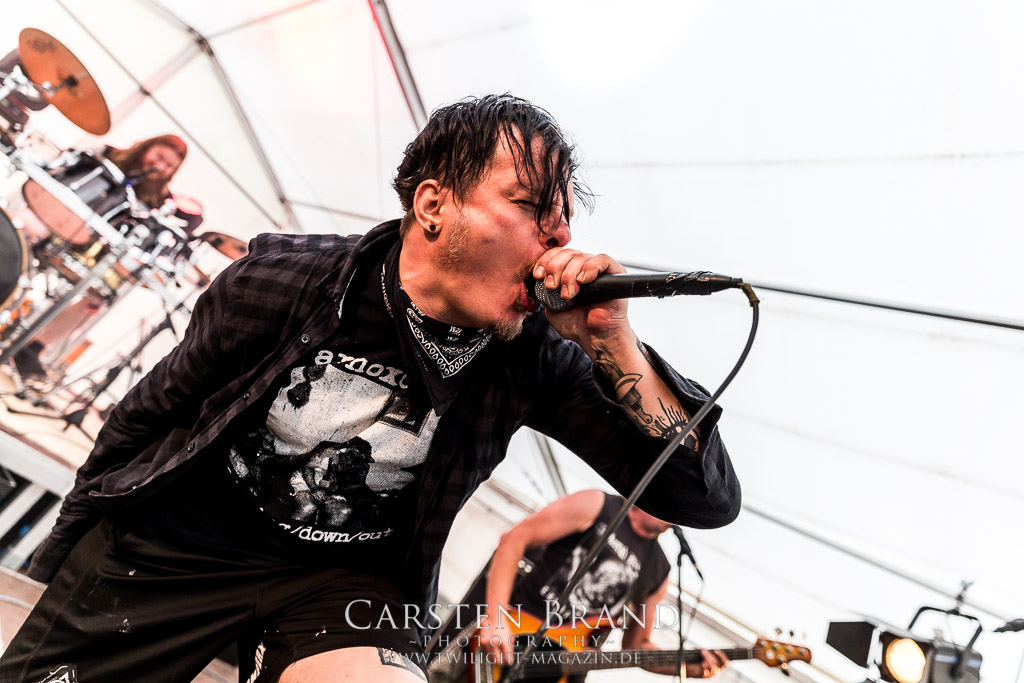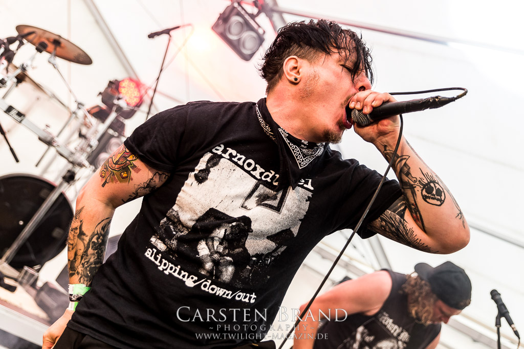 Kollege Linses Ohren sind ja einiges gewohnt. Als der mit den Worten „das ist mir zu krass“ aus dem Zelt kommt, in dem WOJCZECH gerade ihr Set begonnen haben, ist mein Interesse noch weiter geweckt. Das war eh´ schon da, denn Sänger Danilo übernimmt auch bei den von mir geschätzten Entrails Massacre die Vocals. Auf Bandcamp beschreiben die Rostocker ihren Sound als hardcoregrinddeathblackdoomcrustpunk. Das trifft es. Und tatsächlich klingen andere Bands wie Revel In Flesh oder Facebreaker, die zuvor gespielt haben im Vergleich fast schon nach Easy Listening. Die Mucke von Wojczech ist im besten Sinne chaotisch und radikal, ohne sich dabei in reinem Krach zu verlieren. Musikalisch ist mir das ein willkommener Farbtupfer im Billing.