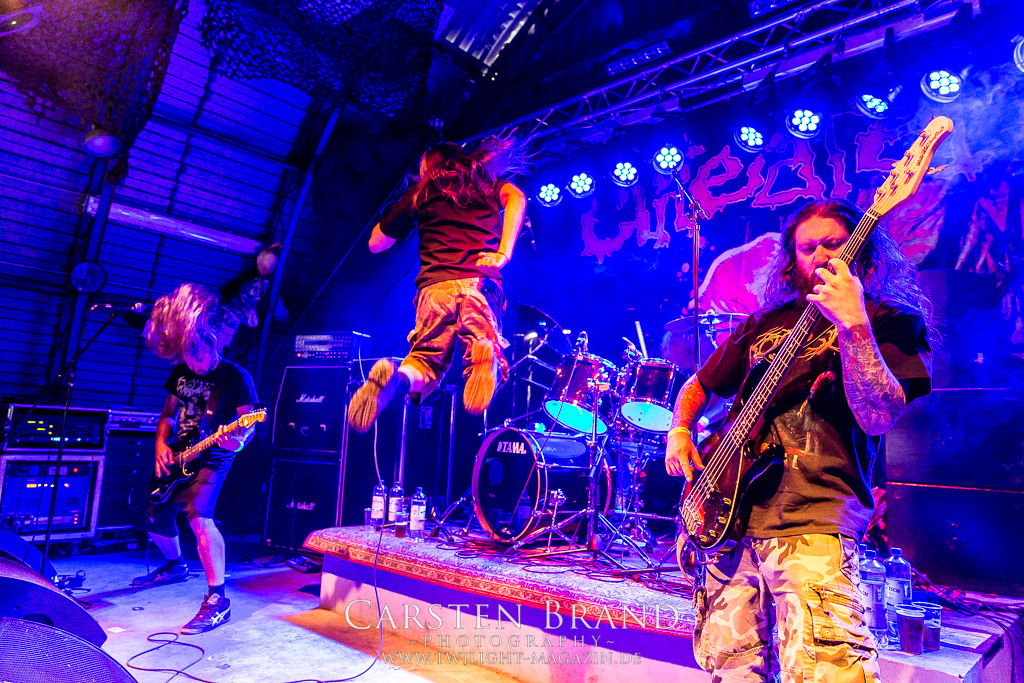 Ich gebe offen zu, dass erst die Absage von Haemorrhage und die damit verbundene Bekanntgabe von VIU DRAKH als Ersatz dazu geführt hatten, dass der Besuch des diesjährigen Protzen-Jubileums für mich unverzichtbar wurde. Vielen jüngeren Lesern und Besuchern dürften die Hallenser nahezu unbekannt sein. Sie waren jedoch um die Jahrtausendwende eine der aktivsten und besten deutschen Live-Bands und noch dazu eine der musikalisch außergewöhnlichsten Bands in der Schnittmenge zwischen Death Metal, Crust, Grind und Punk. Das 2002er Album "Death Riff Society" ist ein bis heute kaum gewürdigter, vergessener und unerreichter Klassiker, der die Band seinerzeit sogar auf Europatour mit Cannibal Corpse führte. Danach folgte ein Split auf Raten und teilweise die Fortführung mit den nicht weniger genialen Korades. Und dass die Band nun ausgerechnet auf dem diesjährigen Open Air ihr Comeback feiert ist dem alljährlichen, gebetsmühlenartigen Einreden von Veranstalter Mario auf alle Beteiligten des Origina l- Line-Up´s zu verdanken, eine Beharrlichkeit, die man ihm gar nicht hoch genug anrechnen kann. Doch kann die Band aus dem Stand tatsächlich die gleiche Explosivität wie vor mehr als einer Dekade auf die Bretter bringen oder sollte eine große Enttäuschung anstehen? Erste, durchgesickerte Stimmen vom Vorabend, an dem Viu Drakh mit ihren Freunden von Malignant Turmour daheim eine Generalprobe veranstaltet hatten, verhießen Gutes, ließen aber die Spannung im Vorfeld nur noch weiter ins Unermessliche steigen. Doch schon mit den ersten Takten macht das Quartett klar, dass sie es immer noch können. Mit rasiermesserscharfem, krachendem Sound knallen Viu Drakh dem Publikum Klassiker für Klassiker vor den Latz, als wären sie nie weg gewesen. "Death Riff Society", "Mutant Gods", "Caravan", "Dead Or Alive", "Black Milk" vom "Take No Prisoners..."-Album, ja sogar "Noize Militia" vom Demo der Vorgängerband TinPanAlley ist in der Setlist und am Ende fehlt auch die obligatorische Motörhead-Hymne "Ace Of Spades" natürlich nicht. Dieser Gig ist Zeitreise und Frischzellenkur zugleich. Während der nachdrücklichen Vorstellung verjünge ich mich mal eben locker um 15 Jahre, um mich hernach sofort wieder um 20 Jahre gealtert zu fühlen. Was bleibt ist pures Glück und ein breites Grinsen angesichts dieser Vorstellung, sowohl bei den Musikern auf der Bühne, wie auch bei den Fans. Dieser Gig ist eine Machtdemonstration. Fortsetzung folgt? Eigentlich führt kein weg daran vorbei allerdings dürfte es wohl eher unwahrscheinlich sein. Aber ich bin unheimlich glücklich und dankbar, dass ich Viu Drakh und ihre Songs noch einmal live erleben durfte, noch dazu in dieser Art und Weise. (JD)