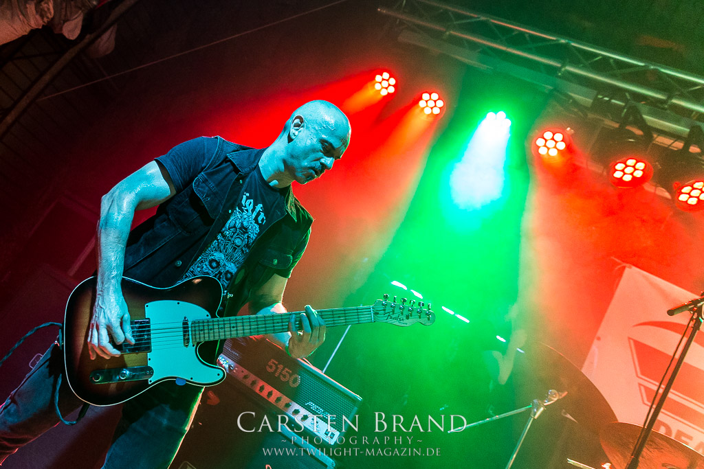 Weniger Black Sabbath als Pantera haben die Sondershausener von BLACK MOOD in ihren Einflüssen, wodurch sie sich in ihrer ähnlichen Grundausrichtung von ihren Kollegen abheben. Das Duo, um die Brüder Izz (Gitarre, Vocals) und Sleaze (Drums) steht mittlerweile in der Tradition von Bands, die einen Bassisten für verzichtbar halten und stattdessen für die Gitarre mit allerlei Verstärker-Technik experimentieren, um möglichst wenig Sound-Einbußen zu haben. Wie schon bei meinem ersten Kontakt mit den Thüringern, die im vergangenen Jahr als Opener für die kongenialen Castle in Göttingen fungierten, spielen sich die beiden Herren den Allerwertesten ab und wissen das Publikum von Beginn an mit ihrem groovenden, metallischen Southern-Rock zu überzeugen.