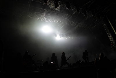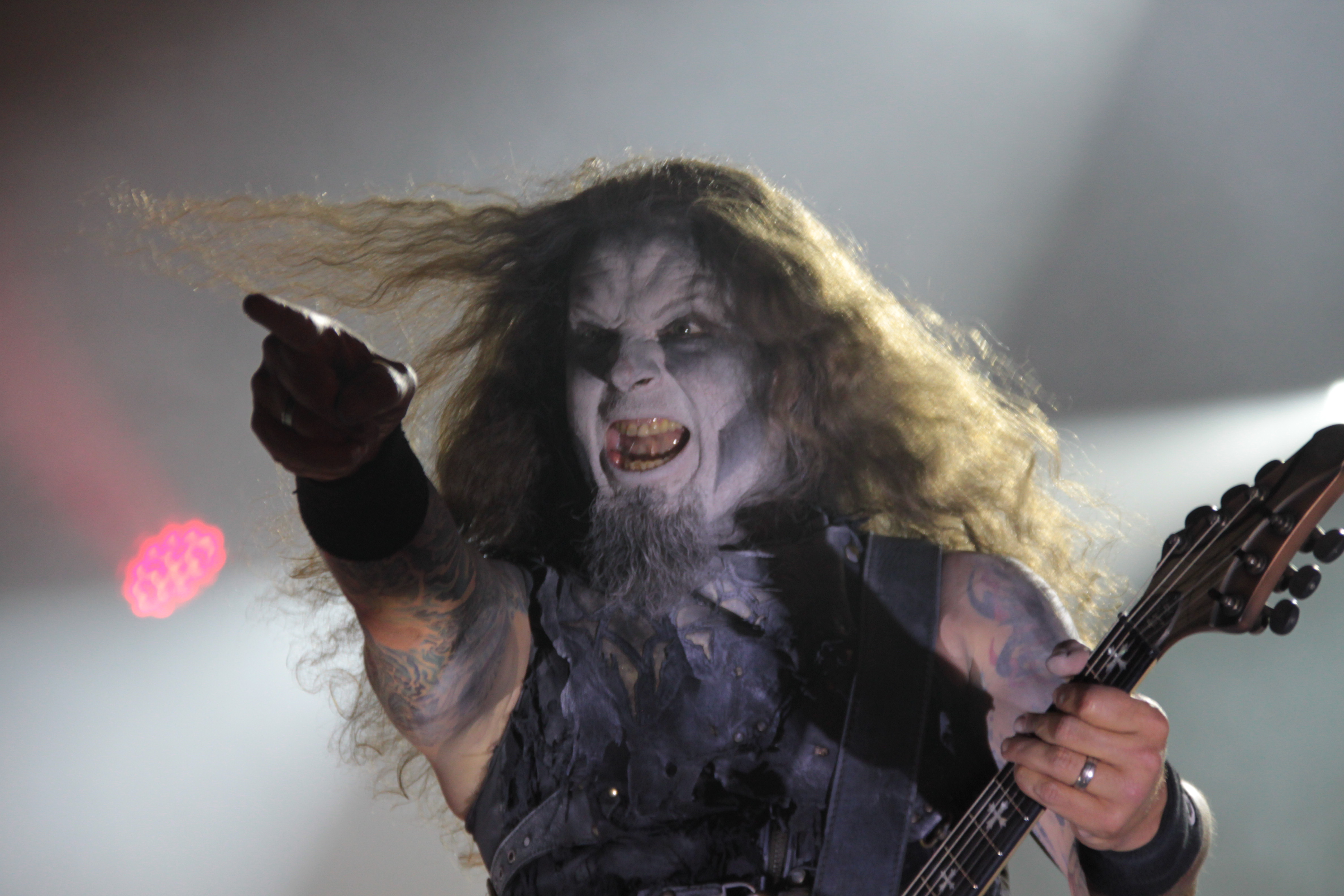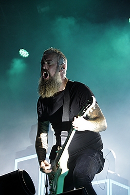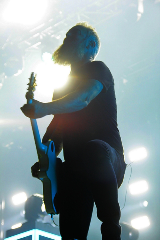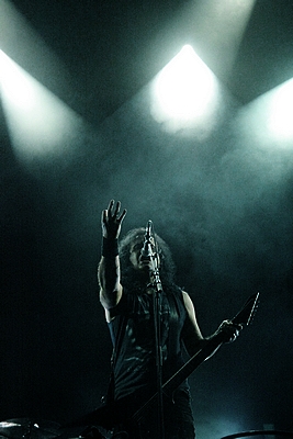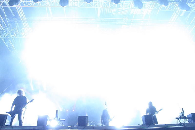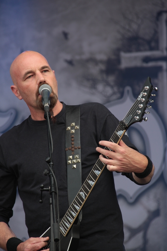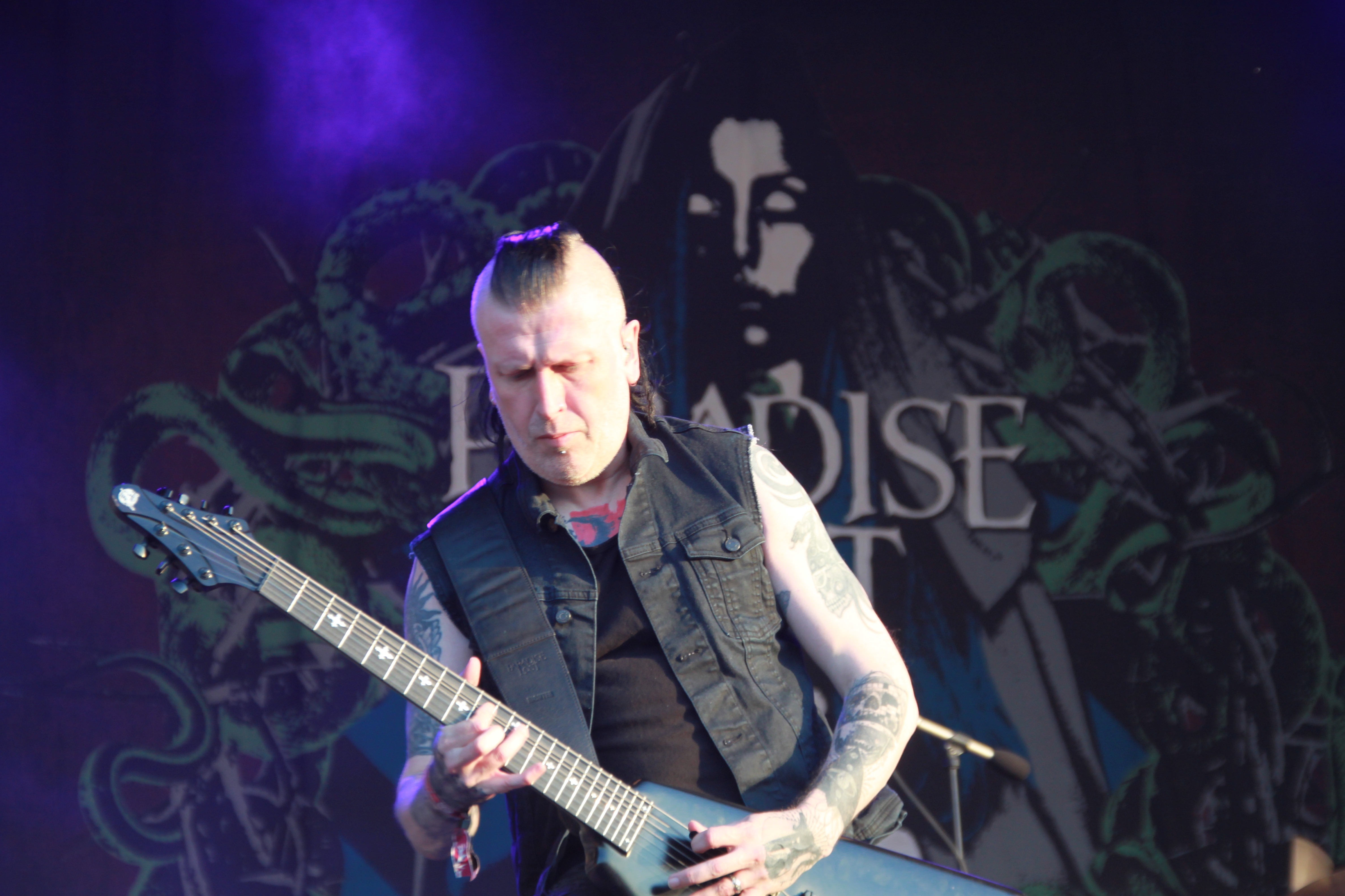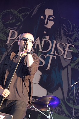 Kurz vor Einbruch der Dunkelheit war die Zeit reif für die Pioniere des Gothic Death Metal von PARADISE LOST. Während der Kollege Lison schon beim Aussprechen des Namens schwitzige Hände bekommt, konnte mich die Band seit „Icon“ eigentlich nicht mehr so richtig begeistern. Mit „Host“ ging die Band musikalisch durch ein tiefes Tal und ich ging seinerzeit an ihrer Seite und kämpfte mich durch die dazugehörige Tour – im Vorprogramm darkwavten seinerzeit KREATOR. Schön war es nicht, aber die Zeiten sind ja vorbei. Trotzdem konnten mich PARADISE LOST das letzte Mal live so richtig überzeugen als sie als Support auf SEPULTURAs „Chaos A.D.“ Tour die Music Hall in Hannover erschütterten. Entsprechend paarte sich an diesem Abend Spannung mit Vorfreude auf den Gig der Briten. Los ging es mit „No Hope In Sight“ vom „The Plague Within“ Album, bevor sich Holmes & Co durch „Blood and Chaos“ vom aktuellen Longplayer „Medusa“ quälten. Gitarrist Aaron Aedy schunkelte sich verzückt dreinschauend durch seine Riffs, während Basser Steve Edmondson und Klampfer Gregor Mackintosh mit schmerzverzerrten Gesichtern herumstanden.