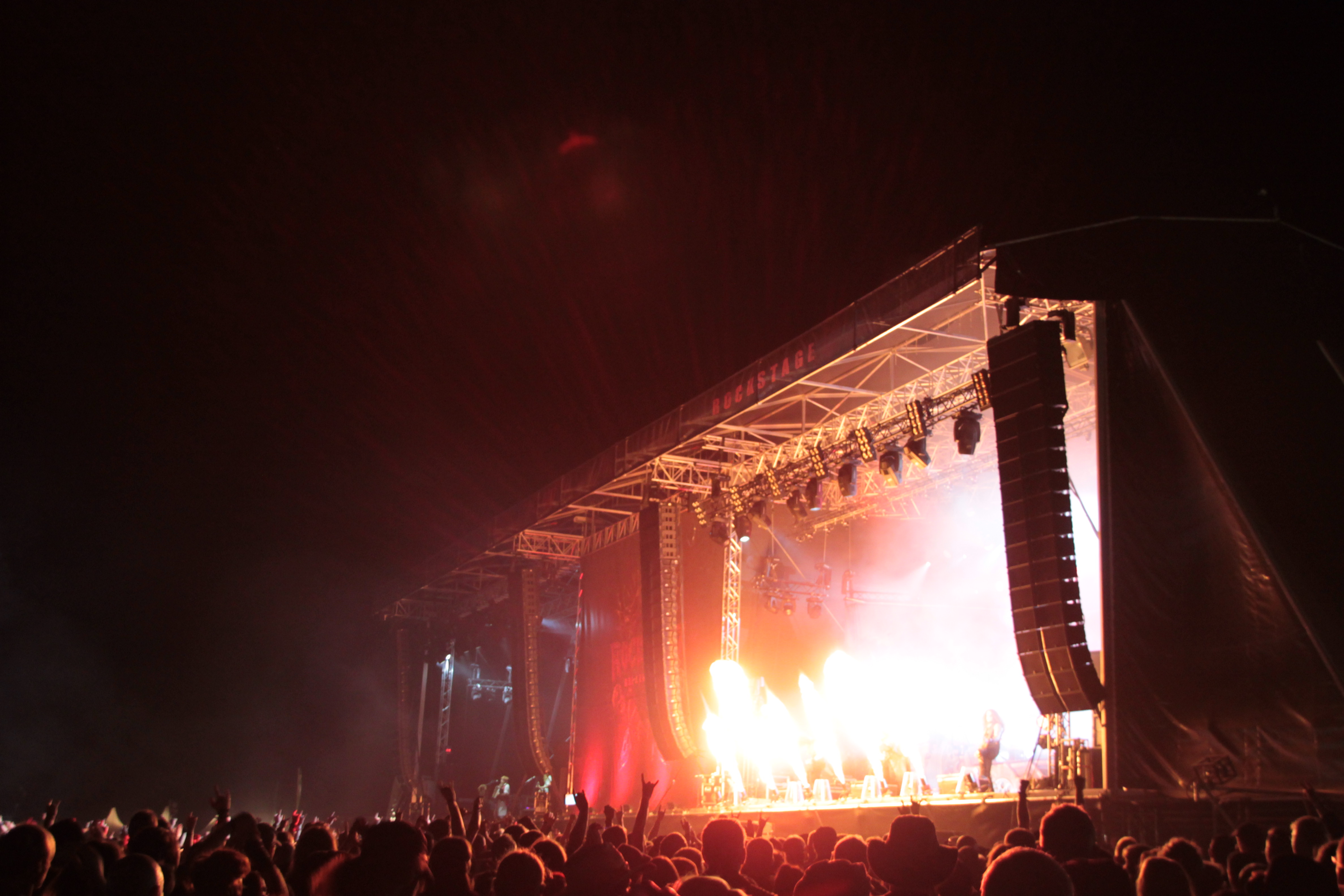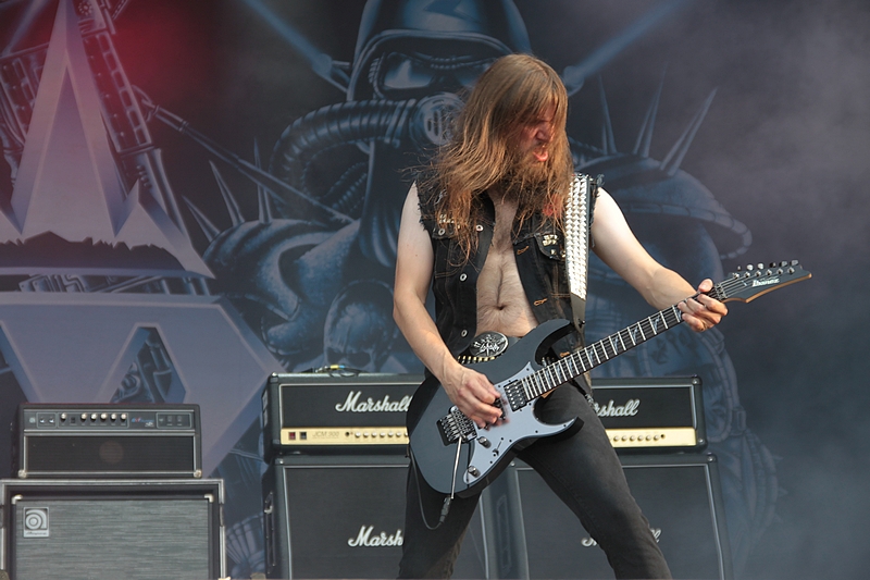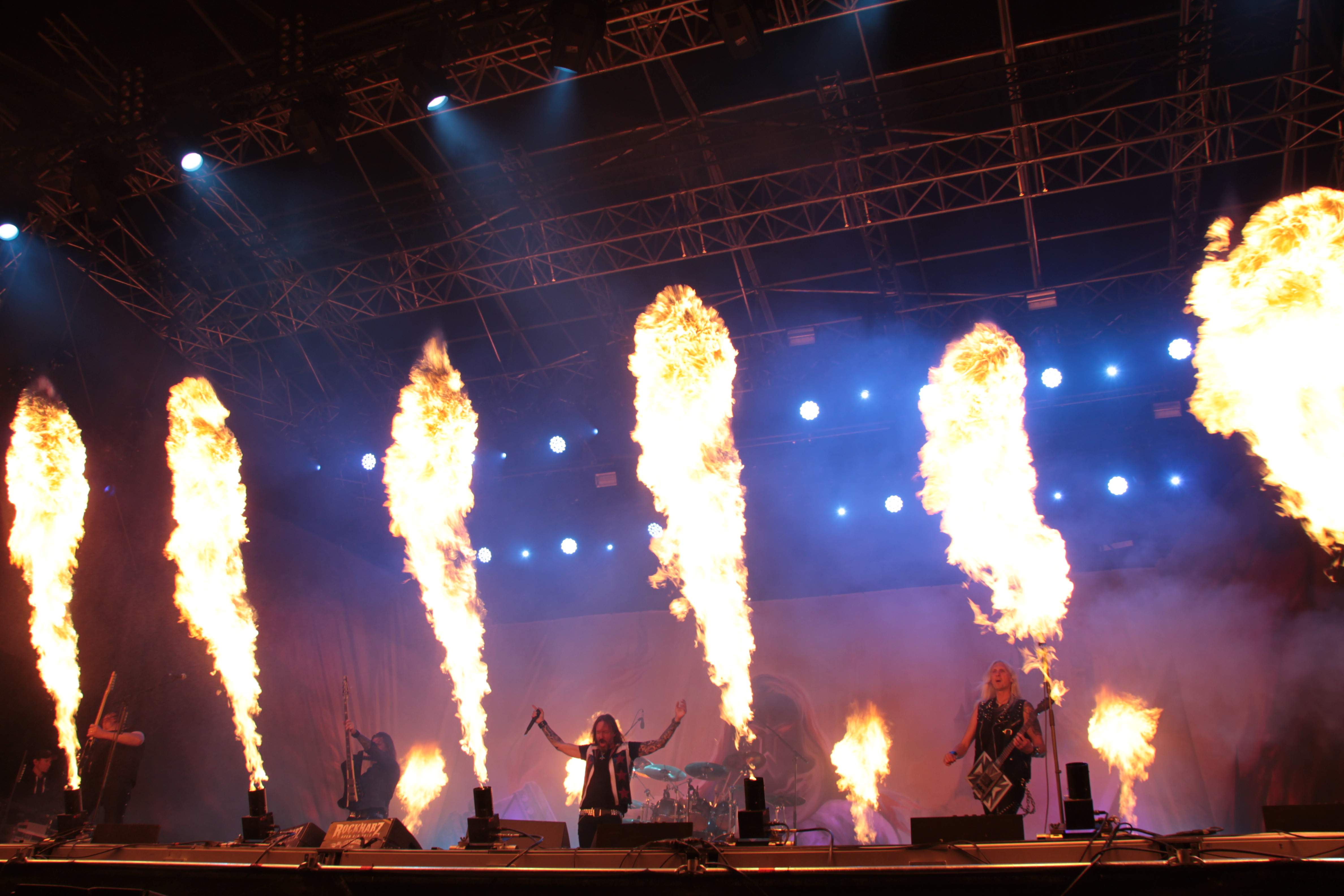 Und getreu dem heutigen Motto, knallte und loderte es an allen Ecken und Enden der Bühne und sogar der Mischertürme. Das war dann aber auch tatsächlich schon der Höhepunkt der Show. Zwar zeigte sich vor allem Oscar durchaus spielfreudig, aber insgesamt wirkte die Band sehr routiniert und statisch. Die Songauswahl war für meinen Geschmack nicht wirklich gelungen und nachdem gerade der Geburtstag des Debüts mit Re-Release usw. gefeiert wurde, fehlten mit Songs wie „The Dragon lies Bleeding“ oder „Steel Meets Steel“ in der Playlist. Natürlich gaben auch Songs wie „Hammer High“ oder „Last Man Standing“ genügen Anlass zum headbangen, trotzdem vermisste ich z.B. „Templars of Steel“. Mit dem obligatorischen „Hearts on Fire“ fand die Band zumindest ein versöhnliches Ende. Fazit: Mit den Headlinern der Vortage konnten HAMMERFALL nicht mithalten. Ihr Auftritt lebte vor allem von der Feuershow, die aber auch jeden anderen Auftritt des Festivals aufgewertet hätte. Die Band selbst konnte mich mit ihrer Show nicht überzeugen. Schade.
