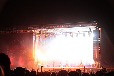 Mittlerweile ging die Sonne über dem Metal-Zeltlager des Rockharz unter und es wurde Zeit für den ersten Headliner des Festivals: KREATOR! Seit fast 20 Jahren sitzt die in Essen gegründete Band um Frontmann Mille ja wieder fest auf dem Thrash Metal Thron. Ebenso lange gab es keine Veränderungen im Line Up mehr, so dass es durchaus verständlich ist, dass die Band sich vor allem auf Songs seit dem „Violent Revolution“ Album konzentrierte. Aus der Pre-Yli-Sirniö Zeit wurden am heutigen Abend lediglich „Plessure to Kill“, „Flag“ of Hate“ und „People of the Lie“ gespielt. Natürlich sind Songs wie „Enemy of God“, „From Flood Into Fire“ oder „Hordes of Chaos” mittlerweile die Visitenkarte der Band, dennoch macht sich bei mir eine gewisse Enttäuschung darüber breit, dass “Extreme Aggressions” mit gar keinem Song bedacht wurde. Ob es anderen wohl auch so ging? Doch das war auch schon fast der einzige Kritikpunkt, denn das Quartett legte von der ersten Sekunde an mächtig los. Mille sparte sich lange Ansagen und stattdessen brettern die Jungs durch die Playlist, während die Bühne in ein wahres Lichtermehr verwandelt wurde. Leider war der Sound mitunter etwas undiffiniert – jedenfalls rechts neben der Bühne – und Ventors Drums klangen teilweise wie von einem MINISTRY Album, während vom Gesang oder den Riffs nur ein Brei zu hören war. Trotzdem waren KREATOR definitiv ein würdiger erster Headliner und ein Höhepunkt des ganzen Festivals!