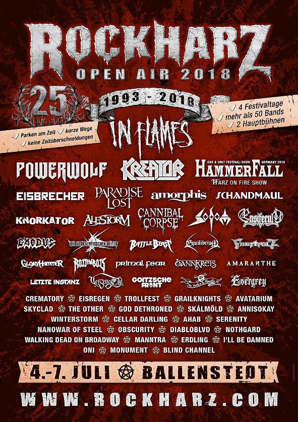 Kinder wie die Zeit vergeht: zum 25. Mal findet nun das Rockharz Open Air statt. Und mittlerweile auch zum 10. Mal in Ballenstedt im schönen Ostharz. Es gibt also jede Menge zu feiern. Erstmalig konnten die Veranstalter den gesamten Verkehrslandeplatz für das Festival nutzen, so dass erstmals auch zwei Zugänge existierten. So ganz trat der erhoffte Effekt dennoch nicht ein und wir standen am Mittwoch gute 1.5 Stunden zwischen Ballenstedt und Festivalgelände im Stau. Dies hatte zur Folge, dass wir den Opener des 25. Rockharz Open Airs leider verpassten. Sehr schade, denn die Briten von MONUMENT wollte ich eigentlich unbedingt sehen und hören, da sie mich mit Alben wie „Renegade“ und „Hellhound“ begeistert hatten. So kamen wir rechtzeitig zur Show von DRONE auf das Infield.