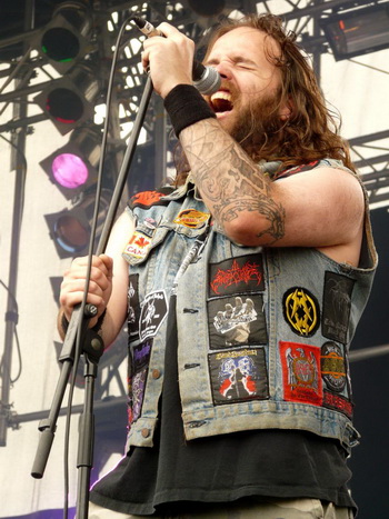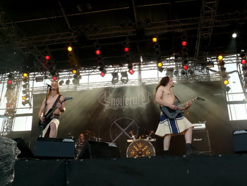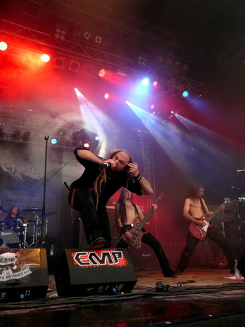 Es schien, als hätten sie einen Pakt mit dem Wettergott: Kurz vor dem Auftritt von 3 Inches of Blood hatte es aufgehört zu regnen, so dass die Kanadier vor einer trockenen und (dank Stroh) praktisch nicht matschigen Main Stage rocken konnten. Wer sich um diese Uhrzeit schon aus seinem Zelt gequält hatte, bekam vom bärtigen Fronter mit Kutte und genretypischer Quietschstimme eine hübsche Batterie melodischen Power-Thrash, dessen Energie mit einem Schuss Pathos am Anfang noch wenig, gegen Ende immer besser ankam. Während seine Stimme am Anfang noch zu leise abgemischt war, jaulte sich Sänger Sänger Cam Pipes später ohne weitere Probleme durch die Diskografie der Band und quittierte seine Biertrink-Pausen sogar mit brav auswendig gelernten, deutschen Sätzen ("Hau weg die Scheiße!"). Neben den Krachern des neuesten Albums der Band, darunter natürlich "Trial of Champions", "Forest King" oder "The Goatriders Horde" war mit "Deadly Sinners" auch einer der älteren Titel mit an Bord. Dass am Ende "We want more"-Rufe laut wurden, war da kaum verwunderlich – auf Grund des strikten Zeitplans jedoch unerfüllbar. Statt dessen kniete sich die Band noch zu einem Gruppenfoto auf die Bühne, schwenkte zum Abschied die Flagge ihrer Heimat (British Columbia) – und machte sich auf die Socken.