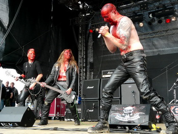Pünktlich um zehn vor zehn kamen dann endlich Thrash-Urgestein Destruction zum Zug, und das, wie passend, zum Megadeth-Cover "Symphony of Destruction". Die Pain Stage, hergerichtet mit Totenkopfstellwänden und belagert von einer wahren Flut an Zuschauern, sollte für die kommende knappe Stunde Schauplatz einer furiosen Bühnenshow werden. Zwischen Riff-Geschrebbel, Feuerblumen und Miniraketen trieb nämlich auch das "Bandmaskottchen", der Butcher, auf der Bühne sein Unwesen: Der breit gebaute Glatzkopf mit der blutigen Schürze schleifte gleich einen kleinen Harem an leicht bekleideten Damen auf die Bühne, um zunächst nur drohend mit dem Fleischerbeil zu fuchteln; später "zerhackte" er dann eine der Damen und warf Teile ins Publikum.
