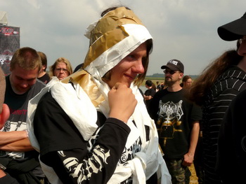Direkt im Anschluss gab’s auf der Main Stage das Kontrastprogramm: Saltatio Mortis luden mit dem Opener "Prometheus" zu einer Partie lockeren Mittelalter-Rocks, die von Anfang an gut ankam. Neben der bewährten Mischung aus Dudelsack und Gitarre gab’s viel zum mitsingen und klatschen, vor allem vom neuesten Album "Aus der Asche" (2007). Beim sechsten Lied holte sich Sänger Alea, der Bescheidene, zusätzlich noch Unterstützung von einem Menschlein, das ich zunächst für ein Mädchen hielt, sich später aber als Junge entpuppte und akustisch leider kaum rüberkam. Egal. Dem Volke gefiel’s bestens, besonders die Crowdsurfer im Stringtanga, welche dem geflügelten Wort vom "nackten Arsch ins Gesicht" eine völlig neue Bedeutung verliehen. Gingen die Mannen einmal von dannen, konnten sie das unbekümmert tun – sie hatten trotz düsteren Wetters einiges zur guten Stimmung beigetragen.