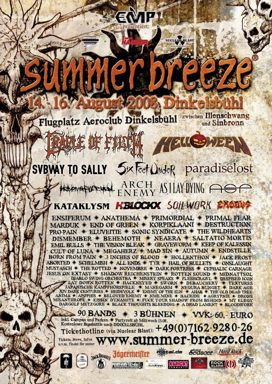 3 Inches Of Blood, Aborted, Agrypnie, ahab, All ends, Amina, Arch Enemy, As I Lay Dying, ASP, Autumn, Behemoth, Beloved Enemy, Blood Red Throne, Born From Pain, Cephalic Carnage, Cradle Of Filth, Cult of Luna, Dark Age, Dark Fortress, Debauchery, Delain, Despised Icon, Destruction, Diablo Swing Orchestra, Dismember, Drone, Eluveitie, End of Green, Endstille, Enemy of the Sun, Ensiferum, Exodus, Fleshgrawl, Gorerotted, Graveworm, H-Blockx, Hackneyed, Hacride, Hails Of Bullets, Heaven Shall Burn, Heidevolk, Helloween, Hollenthon, Japanische Kampfhörspiele, Jesus on Extasy, Kataklysm, Keep Of Kalessin, Kissin Dynamite, Korpiklaani, Lay Down Rotten, Mad Sin, Marduk, Megaherz, Midnattsol, MISANTHROPE, Misery Speaks, MNEGARM, Mustasch, Neaera, Negura Bunget, Nme.Mine, Novembre, Orphaned Land, Paradise Lost, Primal Fear, Primordial, Pro Pain, Rotten Sound, Saltatio Mortis, Schelmish, Shadow Reichenstein, Six Feet Under, Soilwork, Sonic Syndicate, Subway To Sally, Sworn, Textures, The Ocean, The Old Dead Tree, The Vision Bleak, The Wildhearts, Tyr, XIV Dark Centuries