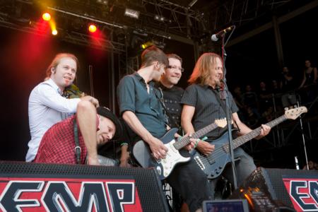 End of Green stellen so etwas wie die Haus-und-Hof-Band des Breeze dar, und das sicher nicht unverdientermaßen: die Stuttgarter Düsterrocker haben ein unnachahmliches Gespür für in Noten gebannte Melancholie und Verzweiflung, was sie über die letzten Jahre hinweg zu einer festen Größe in der Szene werden ließ. Seit Anfangstagen mit dem Festival verbunden, nutzten die Jungs um Sänger/Gitarrist Michelle Darkness wie zwei Jahre zuvor ihren Auftritt, um ihr neues Album vorzustellen (die Releaseparty zu hatte in der Nacht zuvor stattgefunden). Zwar fanden mit "Tie me a rope..." und "Goodnight Insomina" nur zwei Titel von "High Hopes in Low Places" Eingang in die Setlist, doch nach über 15 Jahren Bandgeschichte kann die Band ohnehin aus den Vollen schöpfen. Von dunklen Hits wie "Drink myself to Sleep" bis zu Aggressiv-Deathlasigem ("Dead City Lights") präsentierten sie die volle Bandbreite ihres Schaffens und sorgten für gute Unterhaltung bei inzwischen deutlich erträglicheren Temperaturen. :::Olli