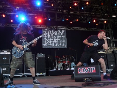 Napalm Death sollte jeder kennen. Warum sie es trotzdem für nötig hielten sich vorzustellen, ist mir schleierhaft. Ein paar hundert Metalheads hatten sich eingefunden, um sich die Krachmacher aus dem Vereinigten Königreich anzusehen. Zu "Suffer the Children" gab es hier und da mal einen Surfer und einen kleinen Moshpit. Echte Begeisterung sieht anders aus und so sehr sich Barney auch bemühte, es sollte nicht besser werden. "Silence is Deafening" und "When all is said and done" konnten auch nur wenige aus der Reserve locken und auf die von den Fans geforderte Wall of Death, zu der Gelegenheit gewesen wäre, wurde nicht eingegangen. Nachdem noch einige Anti-Nazi Parolen in die Welt geplärrt worden waren und "Nazi Punks Fuck Off" zu Ende ging, gab es noch einen Applaus für diesen Auftritt. Müde Nummer... ehrlich.