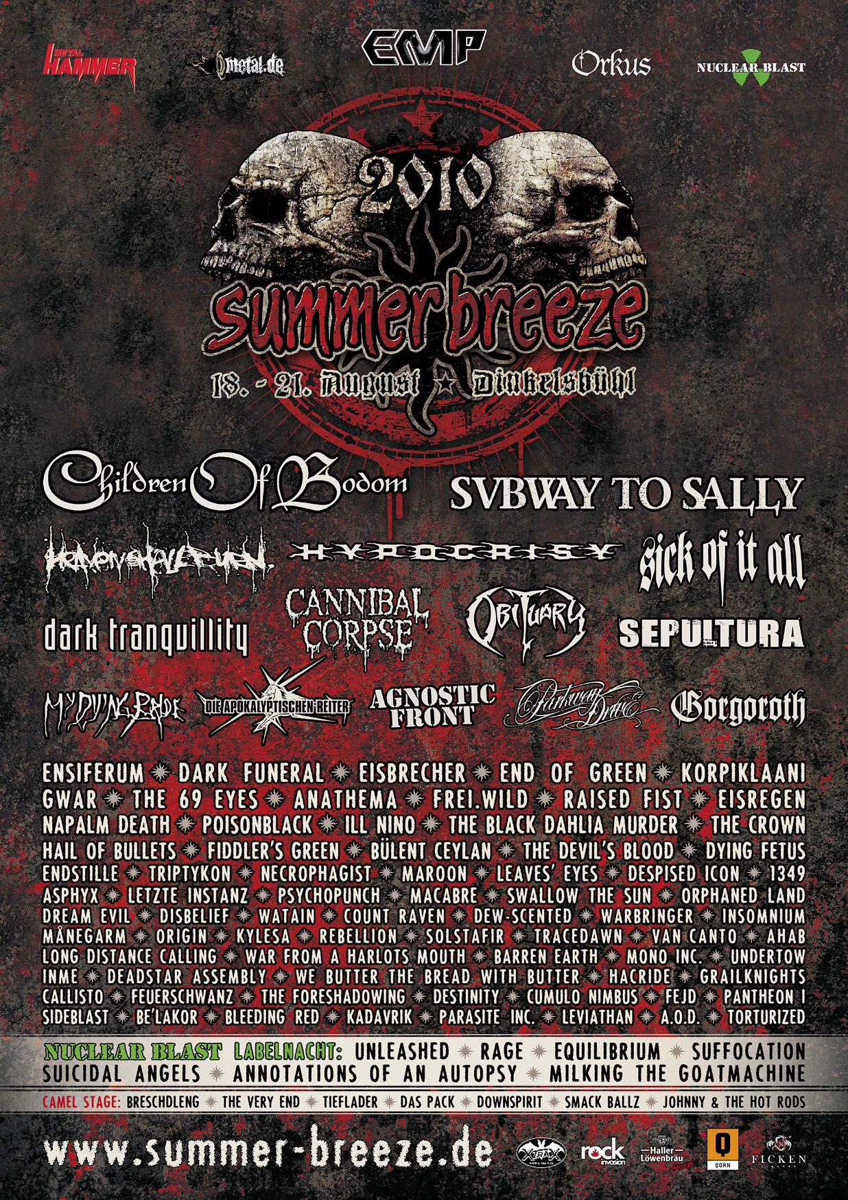 1349, Agnostic Front, ahab, Anathema, Annotations Of An Autopsy, Aod, ASPHYX, Barren Earth, Behemoth, Be’lakor, Blasmusik Illenschwang, Bleeding Red, Breschdleng, Callisto, Cannibal Corpse, Children Of Bodom, Count Raven, Cumulo Nimbus, Dark Funeral, Dark Tranquillity, Das Pack, Deadstar Assembly, Despised Icon, Destinity, Dew Scented, Die Apokalyptischen Reiter, Disbelief, Dream Evil, Dying Fetus, Eisbrecher, Eisregen, End of Green, Ensiferum, Equilibrium, Fejd, Feuerschwanz, Fiddler's Green, FREI-WILD, Gorgoroth, Grailknights, GWAR, Hacride, Hail of Bullets, Heaven Shall Burn, Hypocrisy, Ill NiÑo, Insomnium, Korpiklaani, Kylesa, Leaves Eyes, Letzte Instanz, Long Distance Calling, Macabre, Maroon, Milking The Goatmachine, Mono Inc, My Dying Bride, Månegarm, Necrophagist, Obituary, Origin, Orphaned Land, Pantheon I, Parkway Drive, Poisonblack, Psychopunch, Rage, Raised Fist, Rebellion, Sepultura, Sick Of It All, Sideblast, Solstafir, Subway To Sally, Suicidal Angels, Swallow The Sun, The 69 Eyes, The Black Dahlia Murder, The Crown, The Devil's Blood, The Foreshadowing, The Mean, The Smack Ballz, The Very End, Tieflader, Tracedawn, Triptykon, Undertow, Unleashed, Van Canto, War From A Harlots Mouth, Warbringer, Watain, We Butter The Bread With Butter