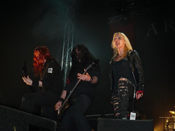 Und dann war es Zeit für die letzte Abrissbirne des Tages. Um Punkt 23 Uhr betraten Arch Enemy eine Main Stage, die - dekoriert mit einem gigantischen "Tyrant"-Banner - schon reichlich Volk angelockt hatte. Ohne weiteren Kommentar startete man in eine stampfende Setlist, die erfreulicher Weise recht wenige Titel vom neueren (und meiner Ansicht nach wenig gelungenen) "Rise of the Tyrant"-Album enthielt, dafür aber umso mehr vergangene Juwelen, wie etwa "Ravenous", "We Will Rise" oder "My Apocalypse". Erst nach ein paar Titeln begrüßte eine freudige Angela Gossow die Meute. Leider rutschten dabei auch gleich die ersten dummschwätzerischen Platitüden mit hinaus ("Ihr kennt mein Motto: Fuck the system and fuck the rules." Jahaaa, klar!). Umso besser also, das "Angie" schnell zu dem zurückkehrte, was sie kann: Wüten. Nachdem sie sich durch "Revolution Begins" und "Burning Angel" getobt hatte, verließ die Band erst einmal die Bühne. Zurück blieb nur Drummer Daniel Erlandsson, der mit einem wahrhaft genialen Drum-Solo brillierte - immer wieder mit kleinen Unterbrechungen, um sich vom Publikum mit Applaus belohnen zu lassen. Erst dann kehrte der Rest der Band zurück, um mit "I Will Live Again" und "We Will Rise" die (vorerst) "letzten" Titel zu zelebrieren und sich zu verabschieden. Auf die nun folgenden "Zugabe"-Rufe hin betrat Christopher Amott allein die Bühne, um ein getragenes Gitarrensolo zum Besten zu geben, bis sein Bruder Michael mit einfiel und die beiden nahtlos zum Arch Enemy-Instrumental "Snowblind" überleiteten. Mit zwei weiteren Zugaben, unter anderem dem "Doomday Machine"-Kracher "Nemesis", setzte dann auch der Rest der Band einen denkwürdigen Schlussstrich unter einen denkwürdigen Auftritt.