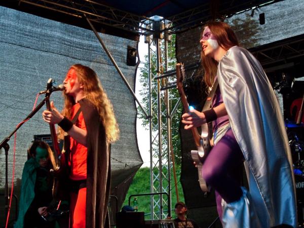 Die Grailknights hatte man standesgemäß und stilecht auf die Burg-Stage gebucht, und so hatte sich schon kurz vor dem Auftritt allerhand Volk und Gesinde vor der Bühne versammelt, als die vier Spaßritter in ein Programm voller markiger Sprüche und spleeniger Superhelden-Action starteten. Die Musik war da fast schon zweitrangig; im Vordergrund stand vielmehr die Show, die das Publikum (das "Battle-Choir") einbezog wie keine andere bisher. Und während man immer wieder recht hörbarem Thrash in die Menge schredderte, erzählte man parallel eine Geschichte mit einem fiesen Oberschurken, einem riesigen Stoffdrachen, den die Knights erst mit der Hilfe des Publikums besiegen konnte, und dem bierspendenden Pferdchen "Zapf Beauty", das doch tatsächlich ein 5-Liter-Fass ins Publikum reichte. Klar, dass da kein Auge trocken blieb. Die Publikumsmitarbeit war wohl die beste auf dem gesamten Festival: Euphorisch moshte und johlte die (stellenweise ebenfalls als Superhelden bekleidete) Menge jeden Song eifrig mit, berauschte sich am Fass oder startete gigantische Polonaisen mit mehreren zig Teilnehmern durch die gesamte Menge hindurch. Nach einer Dreiviertelstunde voller Ulk, Tanz und humorvoll gekonterten "Ausziehen"-Rufen ("Die Knights wollen hier niemanden neidisch machen.") stand für mich persönlich fest: Die vier Spaßmetaller waren definitiv mein Höhepunkt des Festivals.