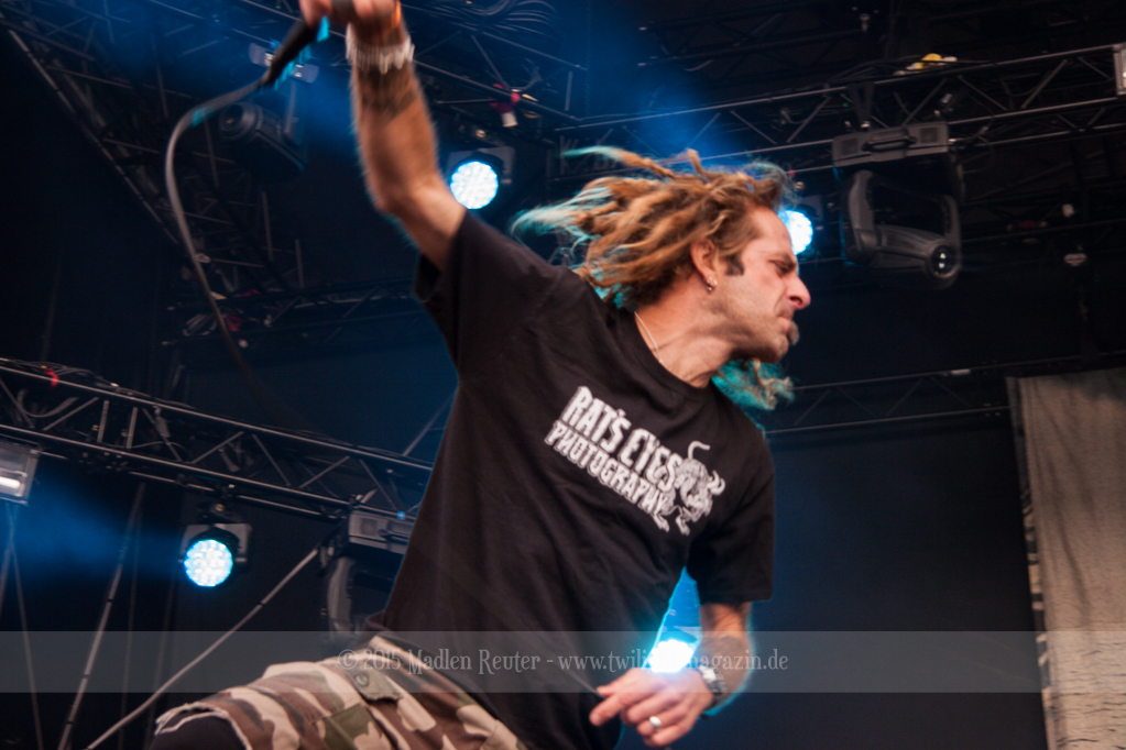 Als nächstes sollten dann die Briten von KROKODIL einheizen, was sie auch taten. Mit ihrem lupenreinen Hardcore wussten sie zu überzeugen. Bereits zu dieser Zeit hatte sich eine beachtliche Menge vor der Hauptbühne versammelt. Durch den Sänger aufgefordert, wurde wild herumgesprungen und gemosht. Schon jetzt versprach die Soundanlage ein sehr ohrenfreundliches Festival, denn der Sound war von Beginn an spitzenmäßig. Die Jungs zockten also ihre Setlist runter, und sprangen nebenher auf der Bühne herum. Solide Show, die mich aber nicht wirklich mitreißen wollte.