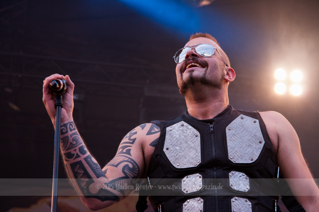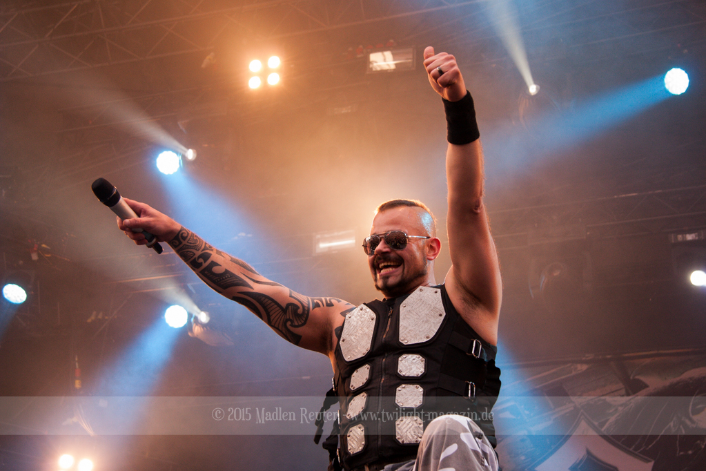 Zeit für den Headliner dieses Tages. Diese Ehre wurde den Schweden von SABATON zuteil. Bei dieser Show sollte der neue Panzer, der den wundervollen Namen „Walther“ trägt, seine Bühnenpremiere feiern. Der Andrang vor der Bühne war gewaltig, und die Luft knisterte vor Spannung. Wie man es nicht anders kennt, bot die Band eine energiegeladene Show sondergleichen. Vor allem Basser Pär und Sänger Joákim, flogen regelrecht über die Bühne. Da sich im Repertoire der Band wohl ein Song zur Geschichte jeden Landes befindet, gestaltete sich die Setlist dementsprechend. Aus diesem Grund fand „Talvisota“ großen Anklang bei den Finnen. Auch forderten sie „Gott Mit Uns“ in Schwedisch zu hören. Diesem Wunsch kam die Band mit großer Freude nach. Neben guter Musik boten die Fünf auch ein breites Sortiment an Feuerwerk und Flammenwerfern. So wurde dem Publikum gleich doppelt eingeheizt. Trotz anfänglicher Probleme mit dem Mikrofon wandelte der Auftritt sich zu einem würdigen Tagesabschluss.