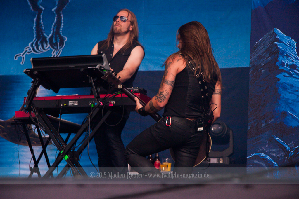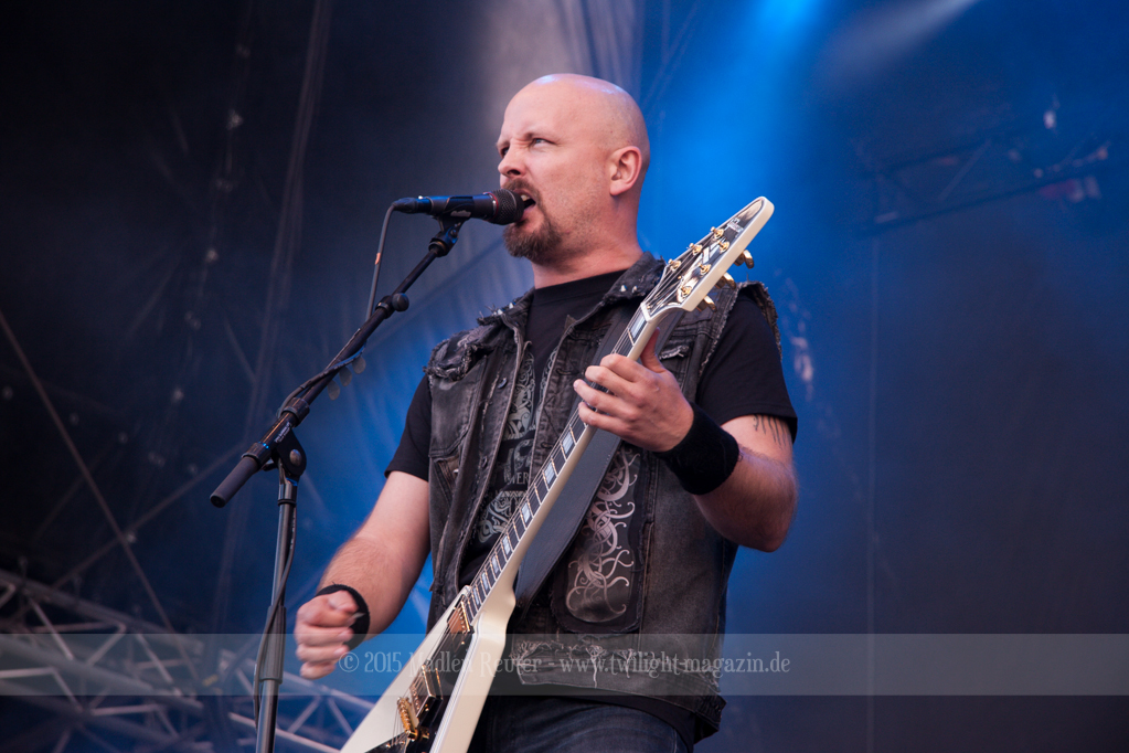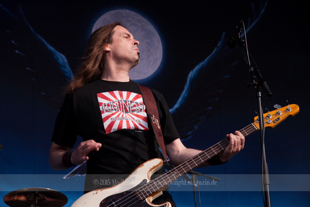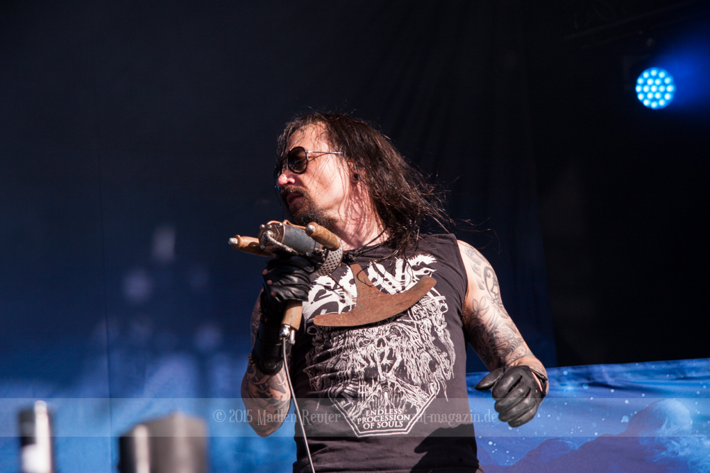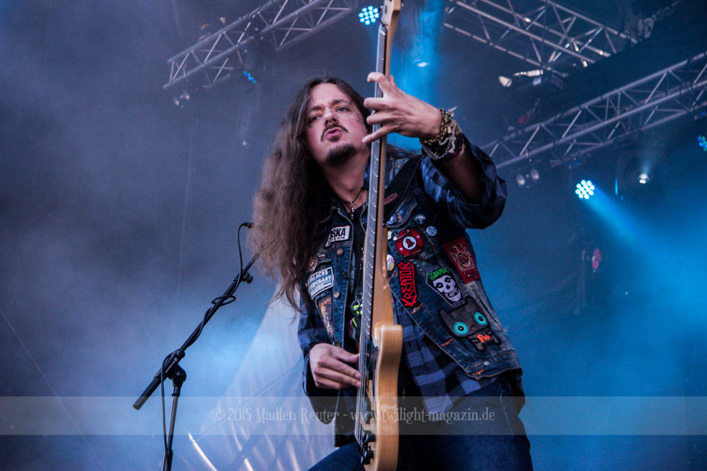 Dieser Tag startet, für mich, mit EINHERJER. Trotz fehlendem Bassisten hatte die Band ordentlich Druck. Für meinen Geschmack sogar etwas zu viel, denn aus den Boxen kam ein einziger Brei. So direkt vor der Bühne fand ich das sehr anstrengend, wobei es aus einiger Entfernung dann ganz anständig klang. Die dreckige Reibeisenstimme des Sängers sticht jedoch zu allen Zeiten sehr hervor. Auch stellt er deutlich zu Schau, dass man nicht unbedingt lange Haare braucht, um entsprechend abzugehen.
