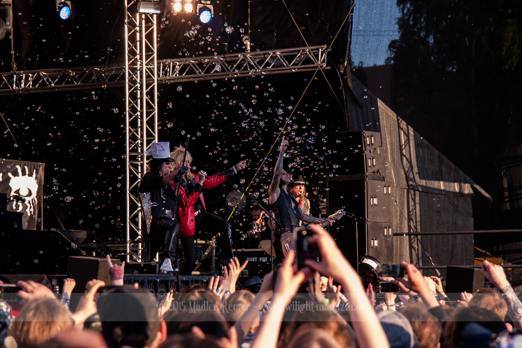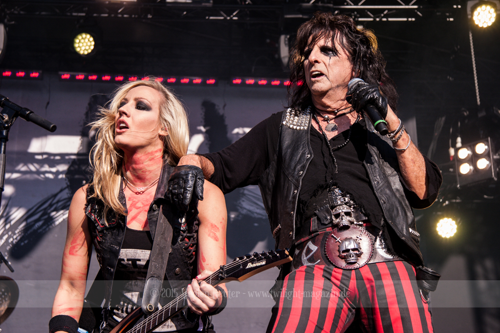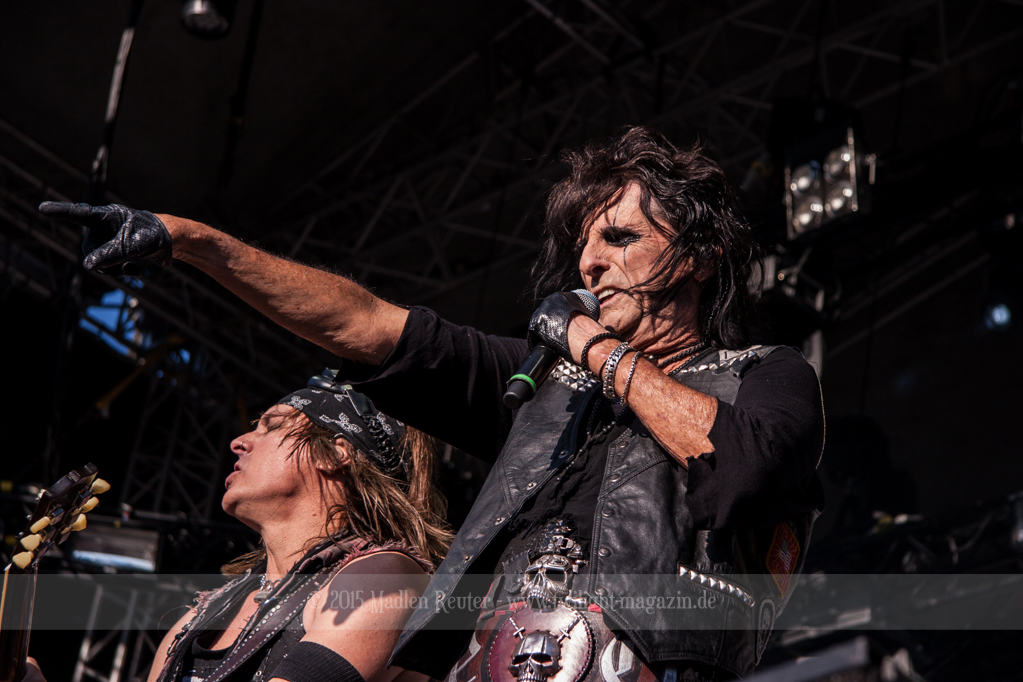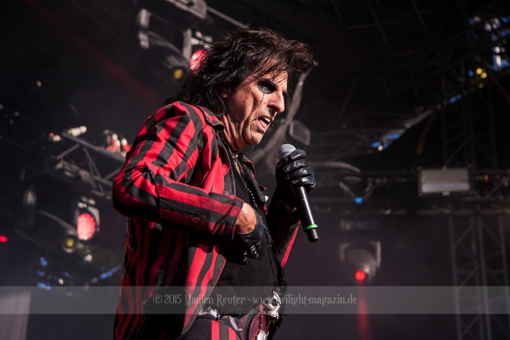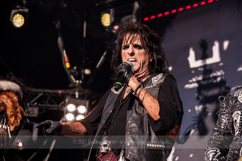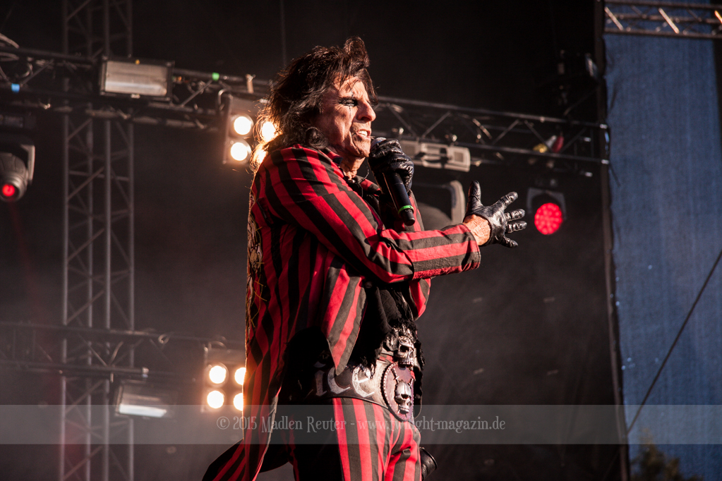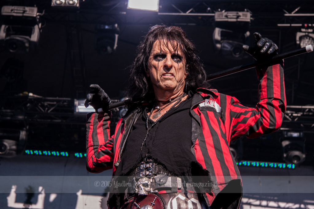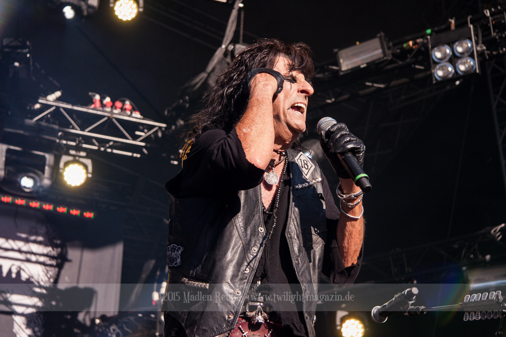 Zum krönenden Abschluss sollte dann noch ALICE COOPER über die Bühne herrschen. Es ist wirklich unglaublich, über welch imposante, fast sogar einschüchternde, Bühnenpräsenz dieser Mann verfügt. Mit seinen Blicken muss er sich keinen Applaus erbitten, man lässt ihm diesen auch ohne Aufforderung zukommen. Insgesamt wusste die gesamte Band wie sie sich in Pose werfen musste. Kaum ohne Bewegung erschien mir als zufällig. Bei diesem straffen Ablauf wäre dies aber auch kaum möglich gewesen. Die meisten Songs wurden von einer Showeinlage begleitet, die einen exakten Ablauf gefordert hatte. So wurde Alice zum Tode durch die Guillotine verurteilt, nach dessen Vollstreckung er allerdings wieder auferstanden ist. Auch Frankensteins Monster wurde in die Show mit einbezogen, der durch ein grausames Experiment zum Leben erweckt wurde. Bei diesem Auftritt wurde dem Zuschauer wirklich eine Menge geboten, und das war definitiv sein Geld wert. Leider muss ich aber auch gestehen, dass die musikalische Darbietung mich nicht allzu umgehauen hatte. Die Songs waren zwar alle sehr gut dargeboten, aber leider kam kaum richtig Stimmung auf. Im Allgemeinen war es eher ein „Wow, die Show ist ja der absolute Knaller“-Gefühl.