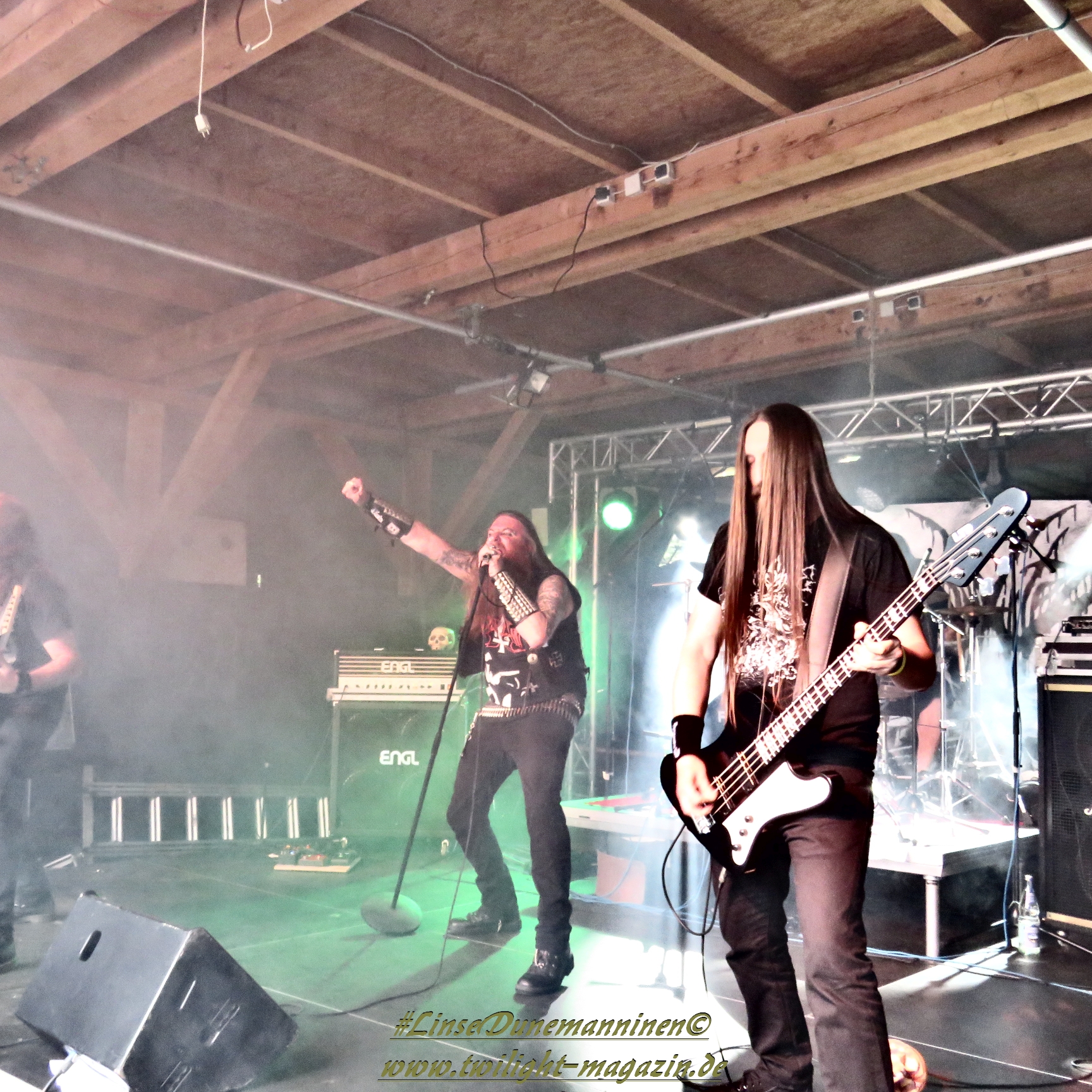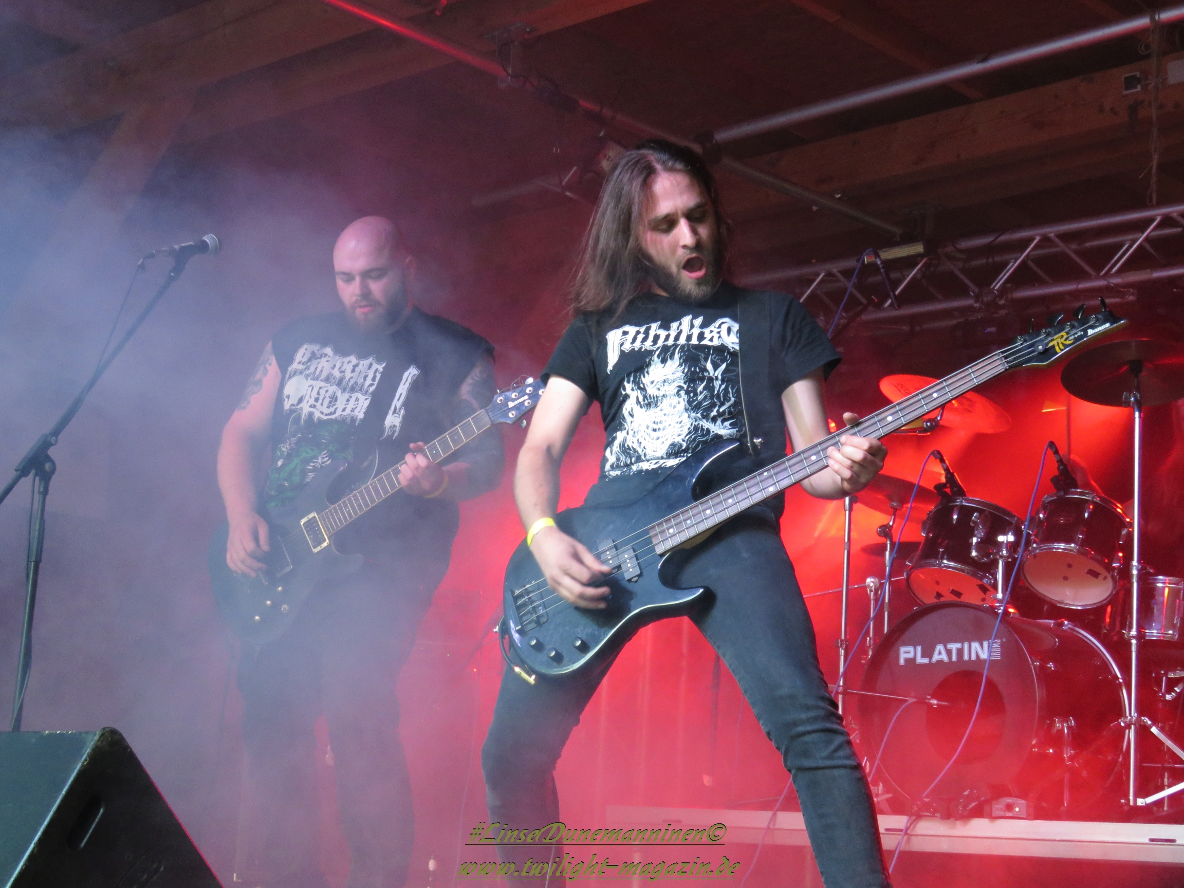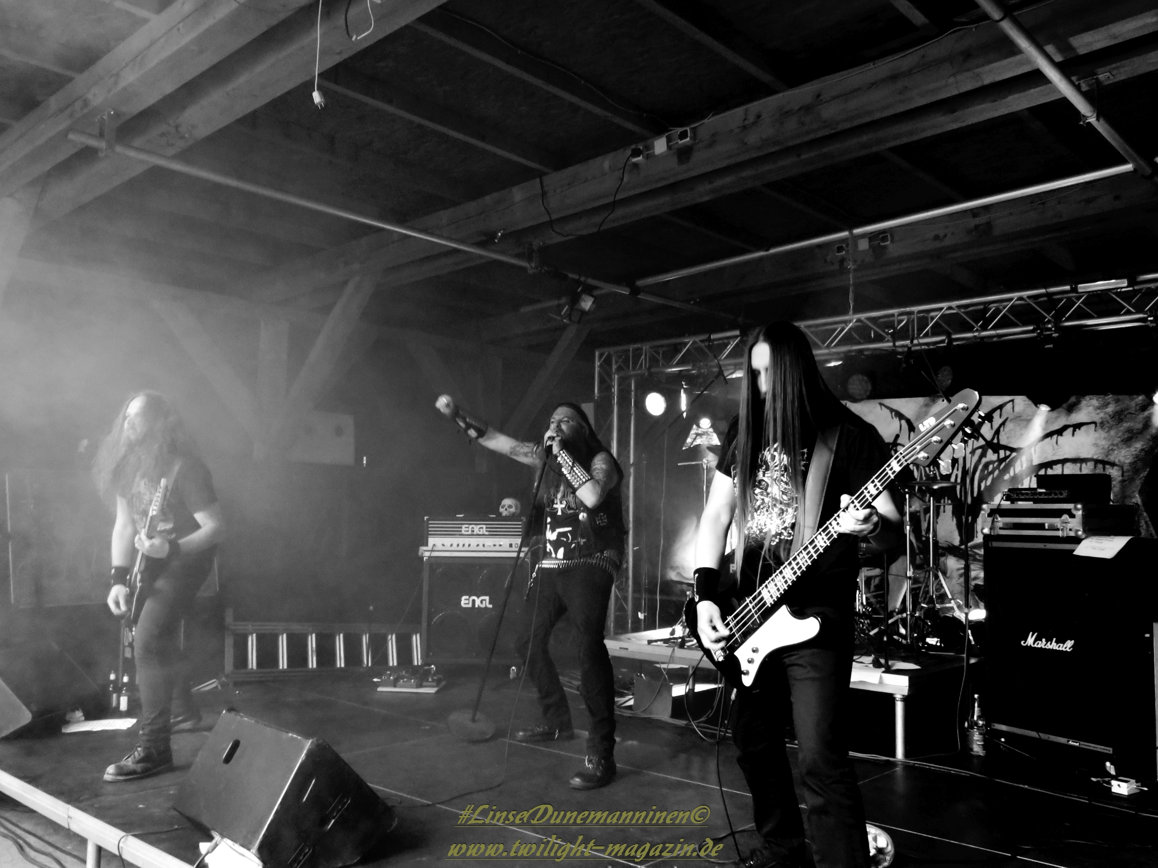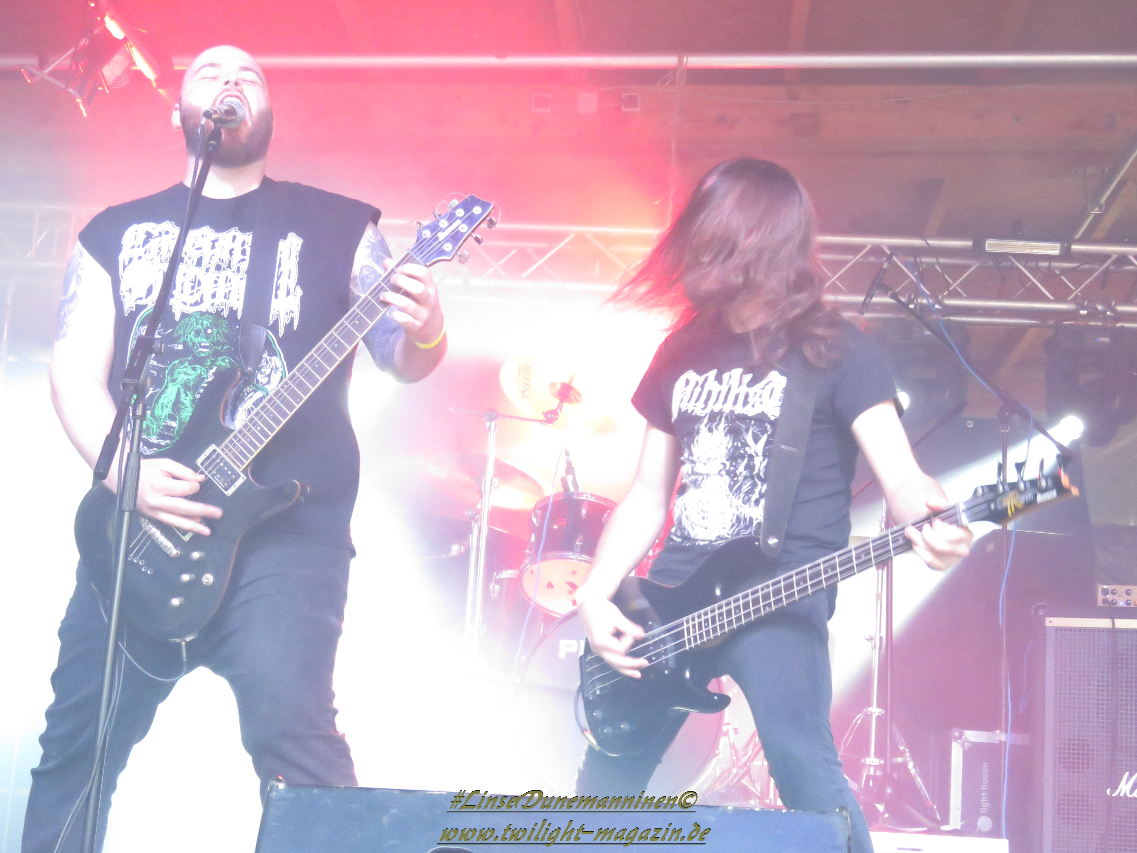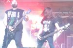 Für die Lokalmatadoren ATOMWINTER folgt anschließend ein Heimspiel, dass im Fußball einem zu verwandelnden Elfer ohne Torwart gleich kommen würde. Und das Quartett nimmt es ebenso sportlich und verwandelt das Geschenk wahrlich souverän. Allen voran Sänger Holzschneider, für den der Begriff Rampensau erfunden worden zu sein scheint, ein Typus Mensch, dem man sowohl abends im Dunkeln allein auf der Straße nicht wirklich begegnen möchte, auf den man jedoch in der ungemütlichsten Situation zählen kann. Darüber hinaus ist er mit einem außergewöhnlichen wie variablem Organ gesegnet, mit dem er großartig umzugehen weiß und mit dem er dem vermeintlich simplen aber äußerst effektiven Todesstahl ein äußerst saures Sahnehäubchen verpasst. Die Meute vor der Bühne huldigt dem Quartett und sorgt für einen amtlichen Moshpit. Keine Ahnung, wieso ich diese Band bisher nicht wirklich auf dem Radar hatte. Es gibt nicht wenige Bands, die aus relativ bescheidenen Mitteln soviel heraus holen. Wenn man einen "Asphyx-Gedächtnispreis" ausloben würde, dann wären Atomwinter jedenfalls ein ganz heißer Anwärter darauf. Die anstehenden Auftritte auf dem Protzen und dem Party.San Open Air sind, wenn nicht sogar überfällig, dann mehr als verdient.