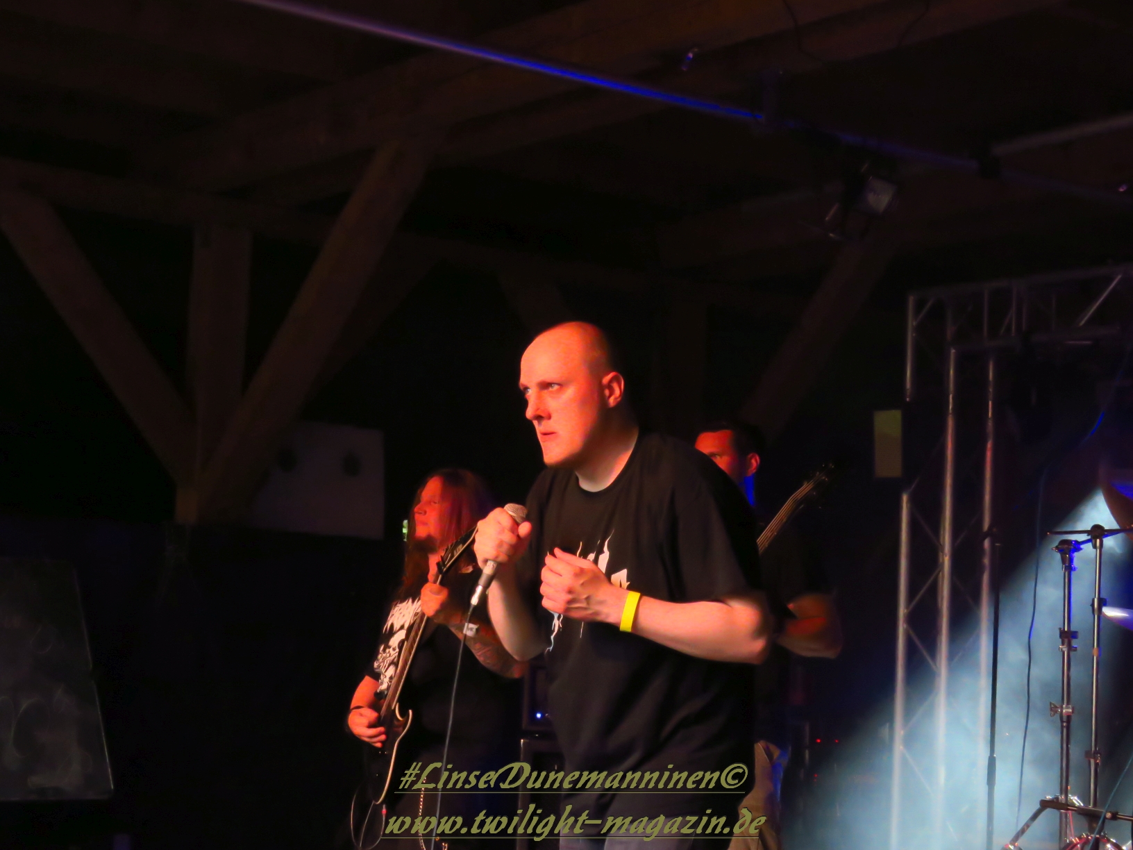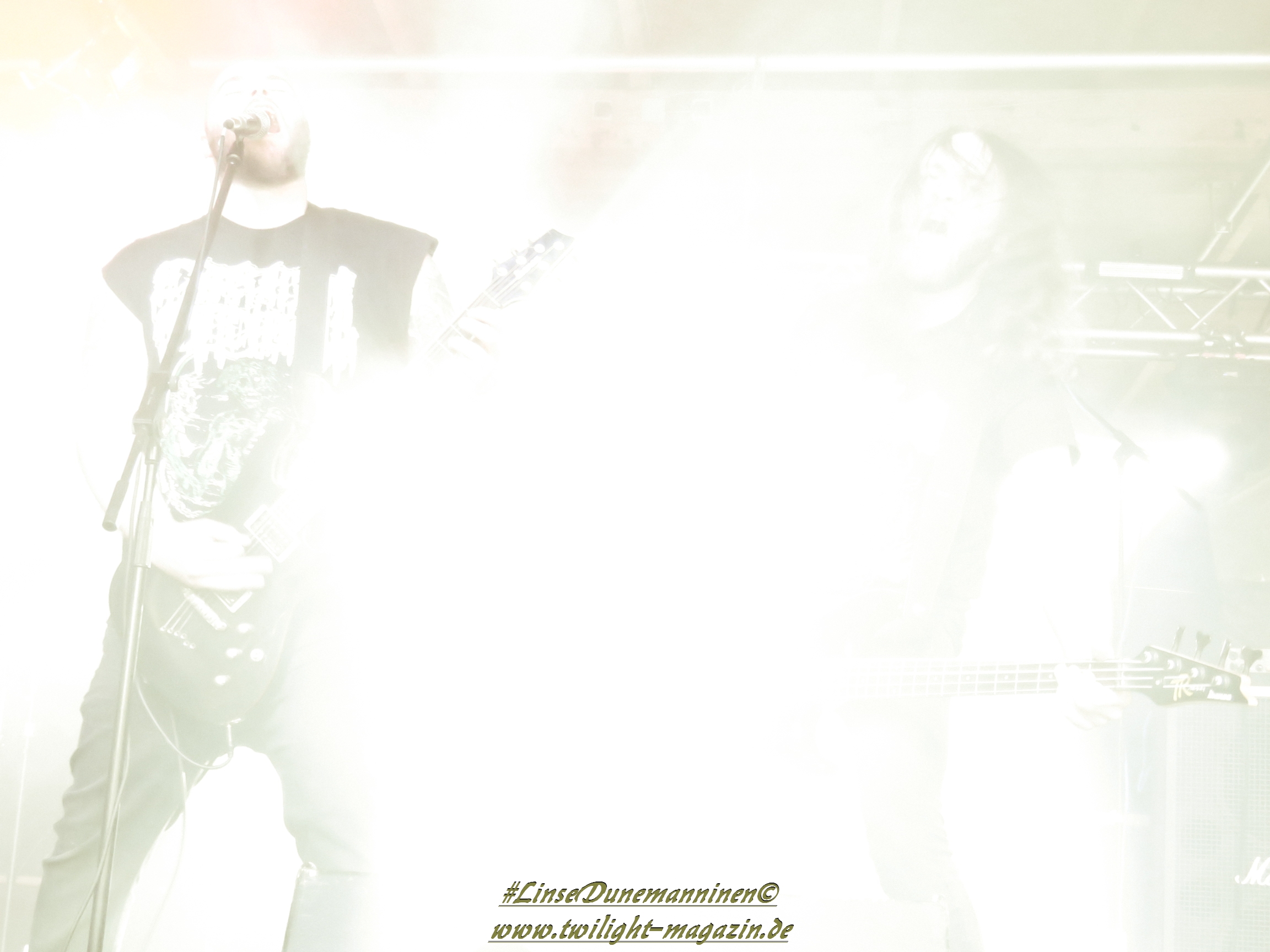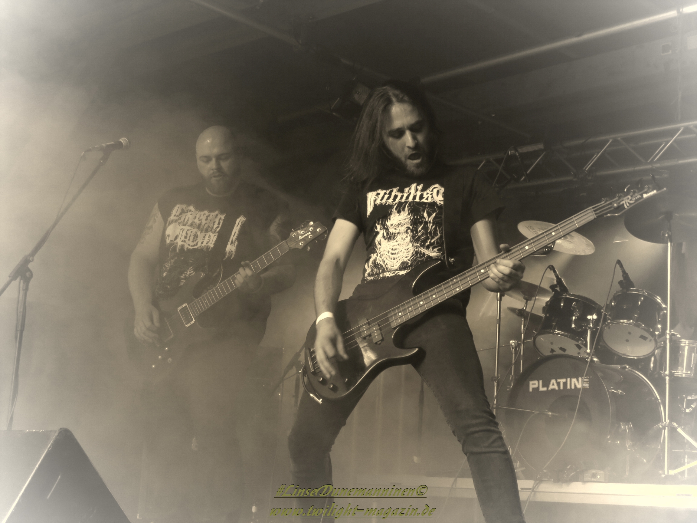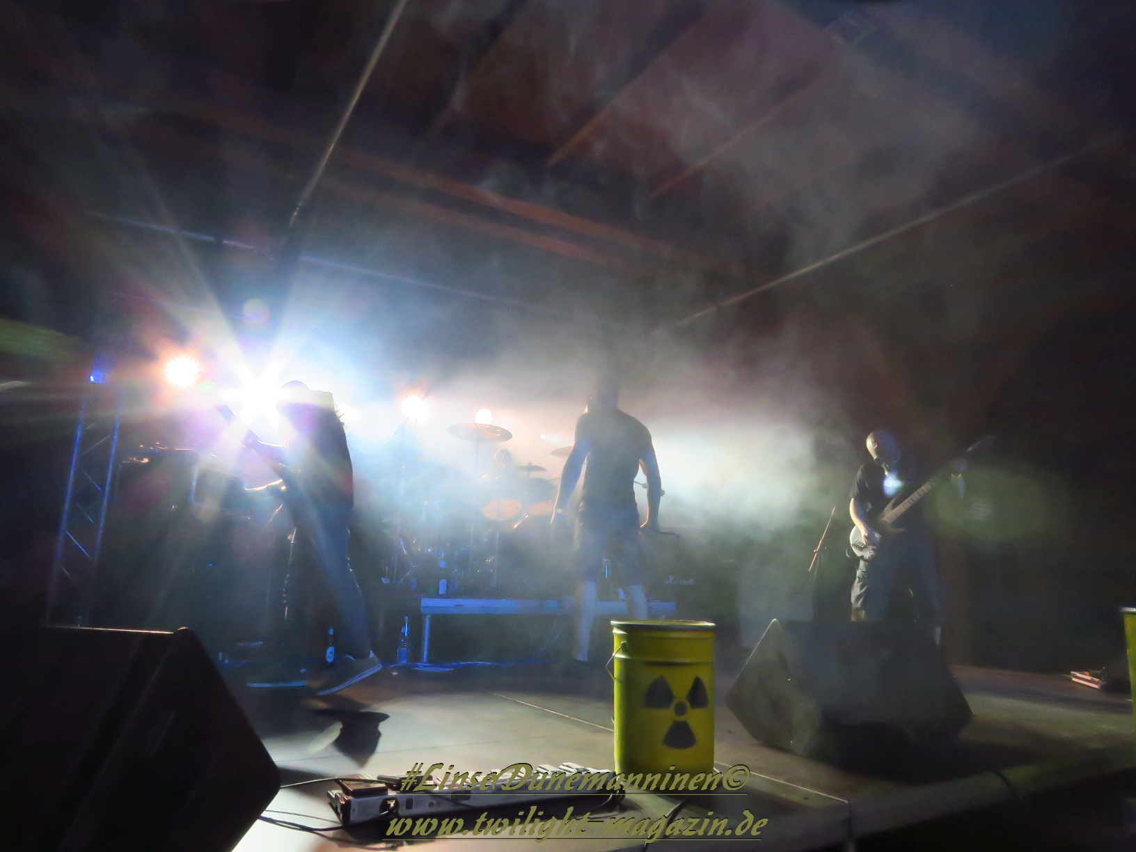 Für die Lokalmatadoren ATOMWINTER folgt anschließend ein Heimspiel, dass im Fußball einem zu verwandelnden Elfer ohne Torwart gleich kommen würde. Und das Quartett nimmt es ebenso sportlich und verwandelt das Geschenk wahrlich souverän. Allen voran Sänger Holzschneider, für den der Begriff Rampensau erfunden worden zu sein scheint, ein Typus Mensch, dem man sowohl abends im Dunkeln allein auf der Straße nicht wirklich begegnen möchte, auf den man jedoch in der ungemütlichsten Situation zählen kann. Darüber hinaus ist er mit einem außergewöhnlichen wie variablem Organ gesegnet, mit dem er großartig umzugehen weiß und mit dem er dem vermeintlich simplen aber äußerst effektiven Todesstahl ein äußerst saures Sahnehäubchen verpasst. Die Meute vor der Bühne huldigt dem Quartett und sorgt für einen amtlichen Moshpit. Keine Ahnung, wieso ich diese Band bisher nicht wirklich auf dem Radar hatte. Es gibt nicht wenige Bands, die aus relativ bescheidenen Mitteln soviel heraus holen. Wenn man einen "Asphyx-Gedächtnispreis" ausloben würde, dann wären Atomwinter jedenfalls ein ganz heißer Anwärter darauf. Die anstehenden Auftritte auf dem Protzen und dem Party.San Open Air sind, wenn nicht sogar überfällig, dann mehr als verdient.