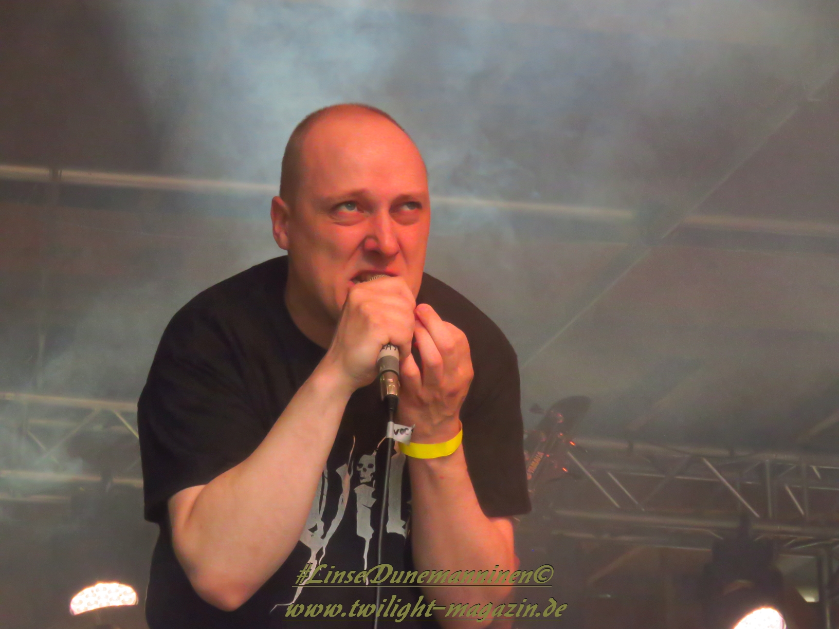 Auch die folgenden Tech-Deather von CYTOTOXIN sind stilistisch nicht wirklich meine Baustelle, obwohl der Vierer aus Chemnitz handwerklich wohl mit dem versiertesten Line-Up aufwartet. Musste bei Devastator vorschnell der plumpe Uhrwerksvergleich herhalten, dann bleibt mir nur übrig, der Instrumentalfraktion der Sachsen die Fitness einer Atomuhr zu bescheinigen. Während die Saitenfraktion sich durch abwechslungsreiche, moderne Deathgrind-Kompositionen frickeln, die von einem dichten, filigranen Schlagzeug-Gewitter unterlegt sind, quiekt, röhrt, grunzt, brüllt und schreit sich Gutturalakrobat Grimo die Eingeweide aus dem Körper. Die Klobürstenfraktion nimmt die musikalische Vorlage, welche zu Beginn in eine martialische Endzeit-Show samt Gasmasken und Giftfässern eingebettet ist, dankbar an und sorgt für reichlich Bewegung samt Circle-Pit vor der Bühne.