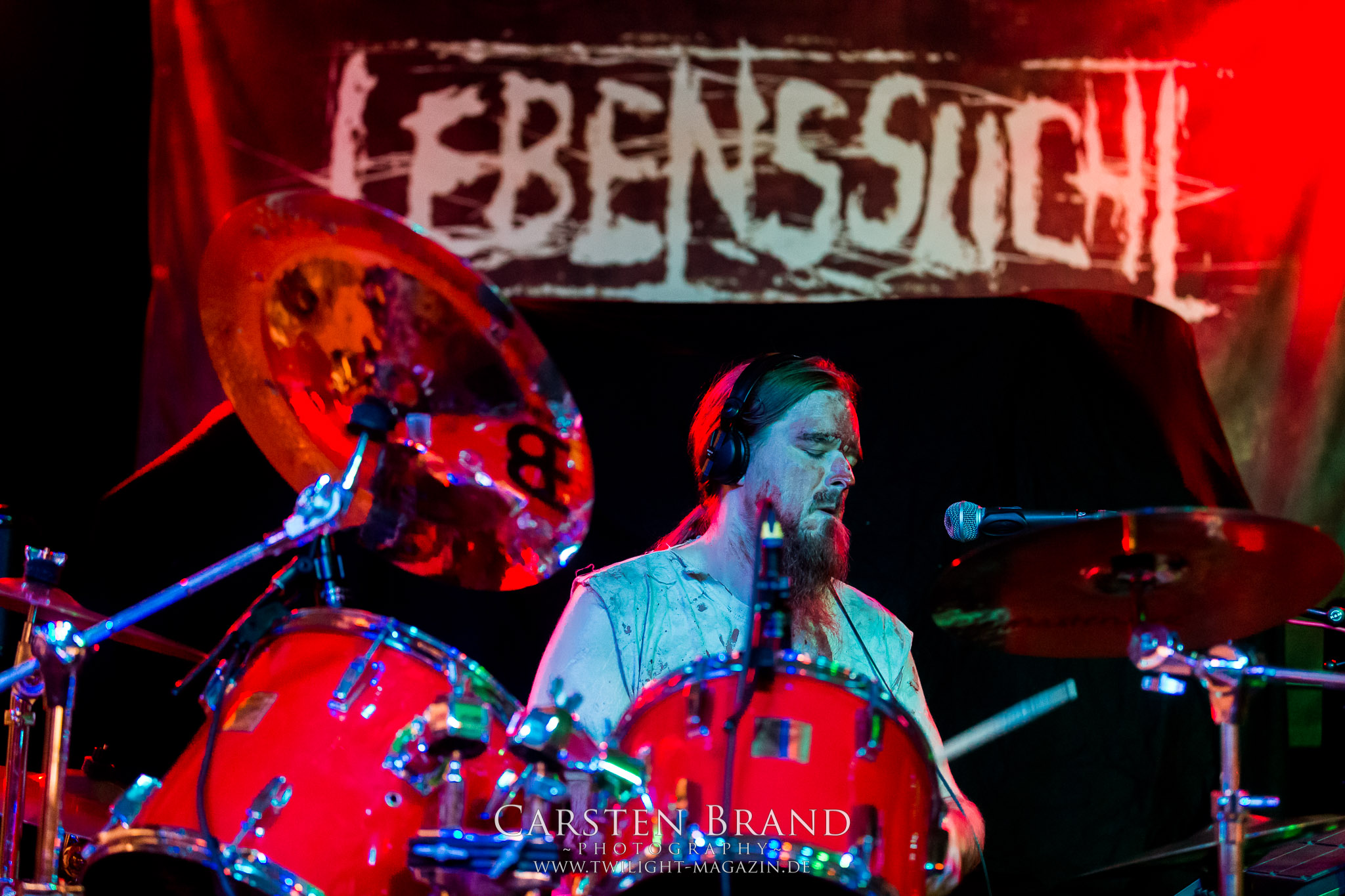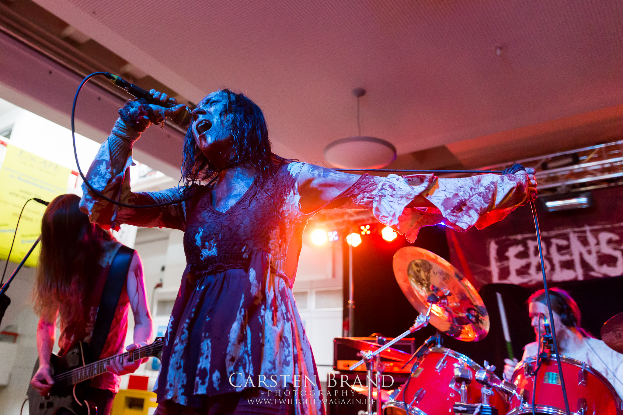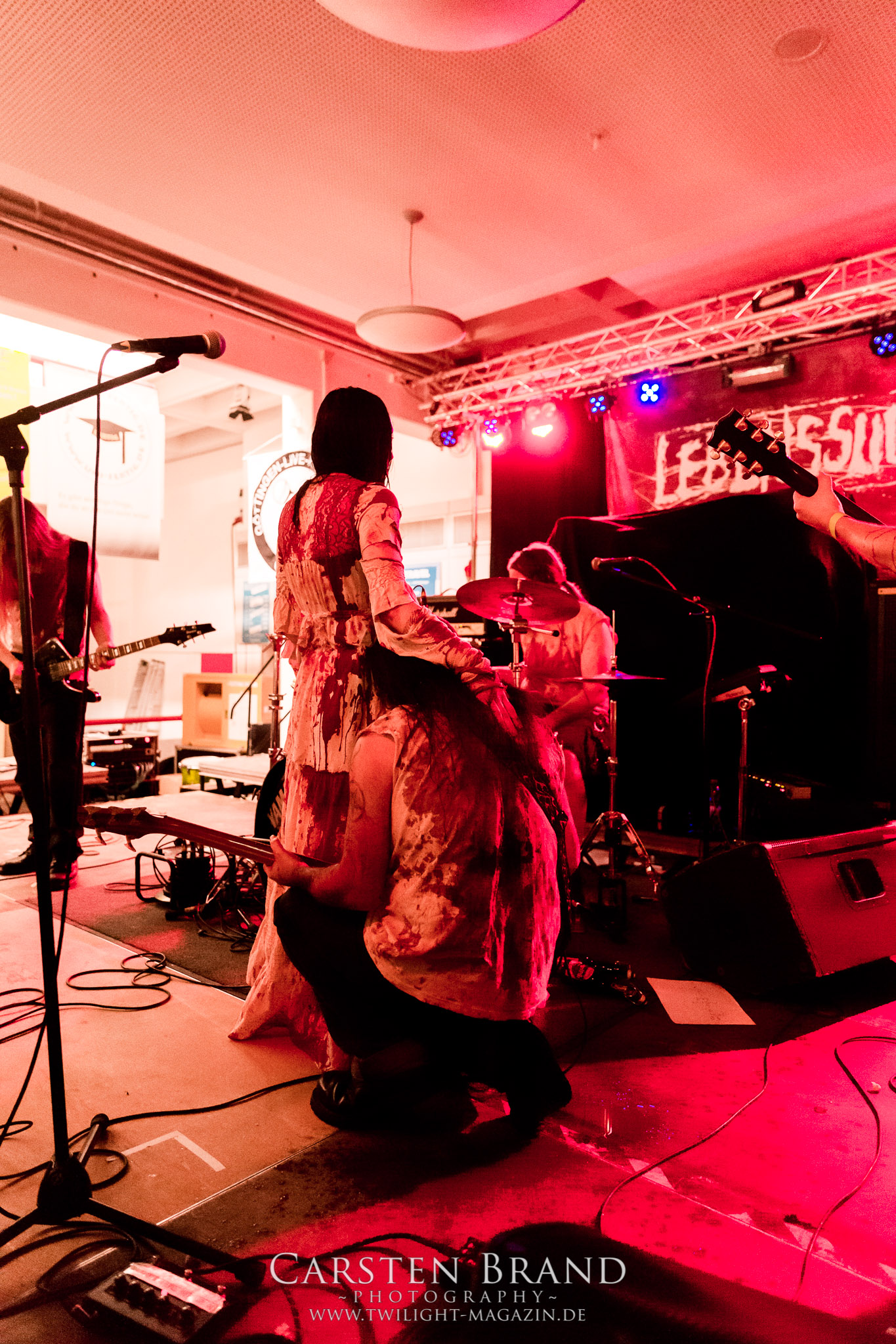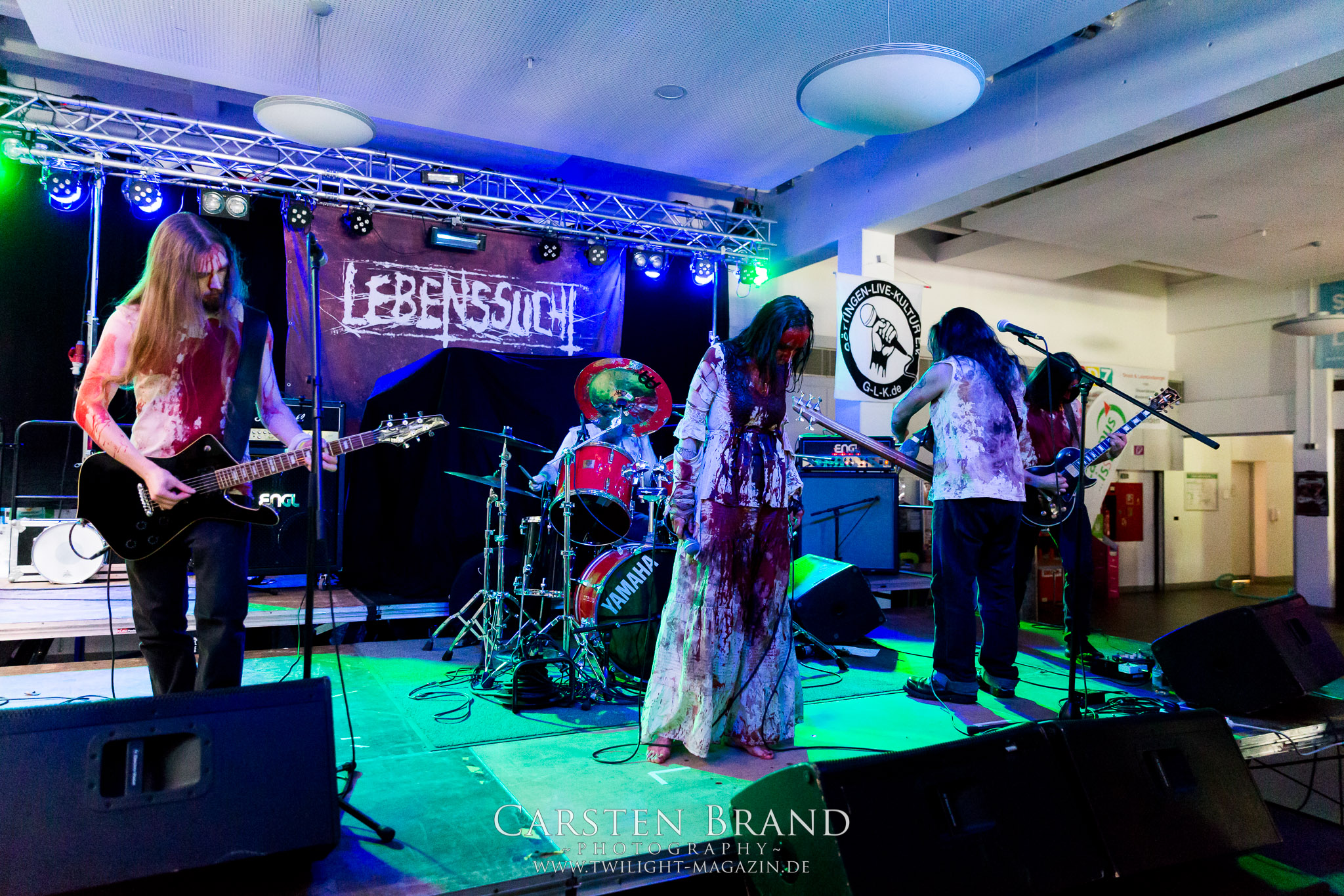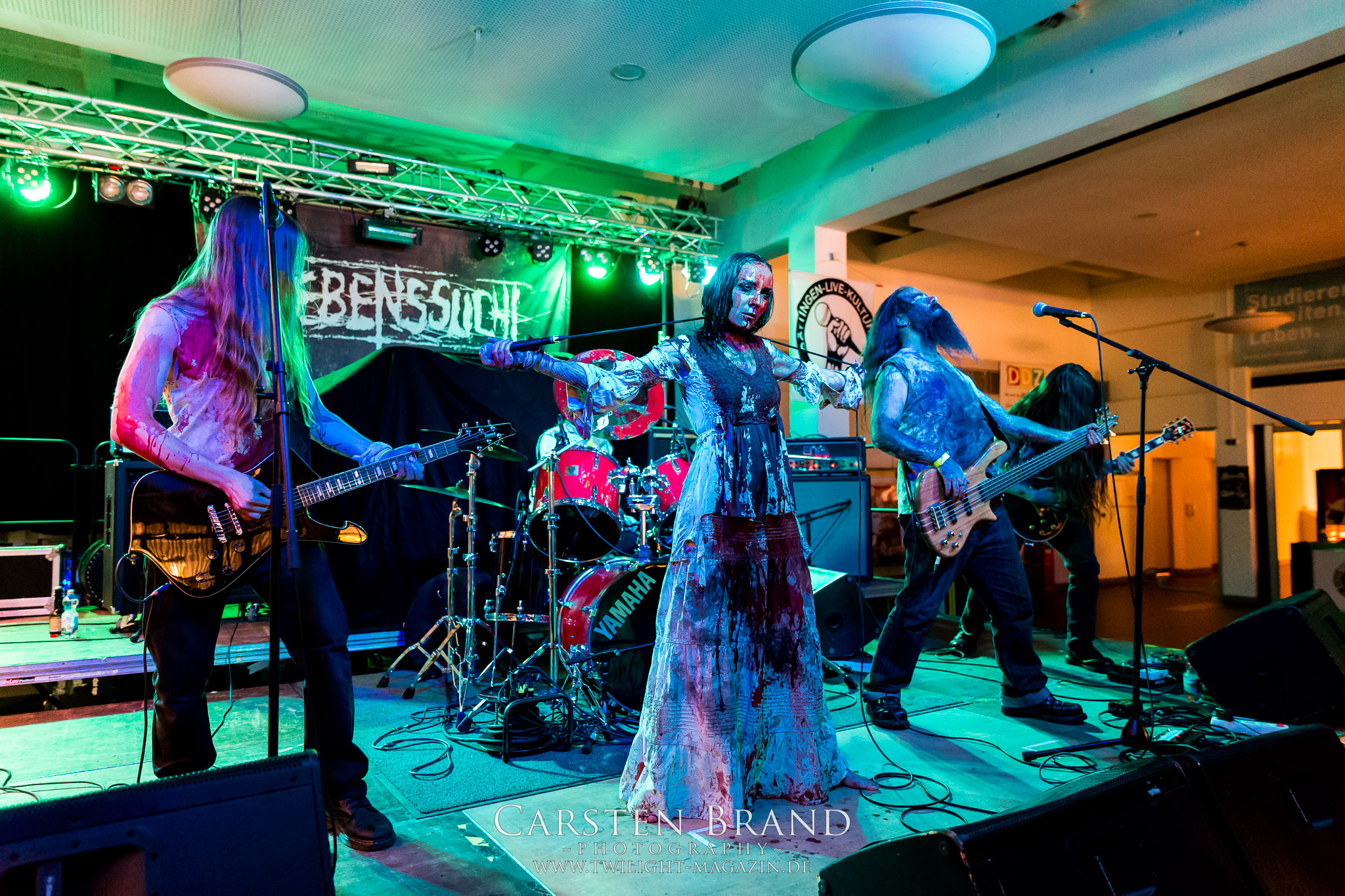 Einen Deal können LEBENSSUCHT zwar noch nicht vorweisen, bereit sind Frau und Männer dafür aber allemal. Der Sound des in Deutschland, Belgien und Österreich beheimateten Kollektivs ist alles andere als lebensbejahend sondern pendelt zwischen schwarz-metallischer Avantgarde und Suicidal Black Metal. Mit Corpsepaint, (kunst-)blutverschierte weiße Kleider und Leiber, viel Theatralik und Pathos baden LEBENSSUCHT, angeführt von Sängerin S Caedes, mit geöffneten Pulsadern im lauwarmen Wannenwasser, begleitet von bittersüßen und doch klirrend-warmen Gitarrenklängen und den wirklich großartigen, hochemotionalen Wechselgesängen der Instrumentalfraktion. Eigentlich ist das musikalisch noch nicht einmal sonderlich spektakulär aber LEBENSSUCHT sind einfach verdammt gut in dem, was sie machen und sie wissen damit zu überzeugen.