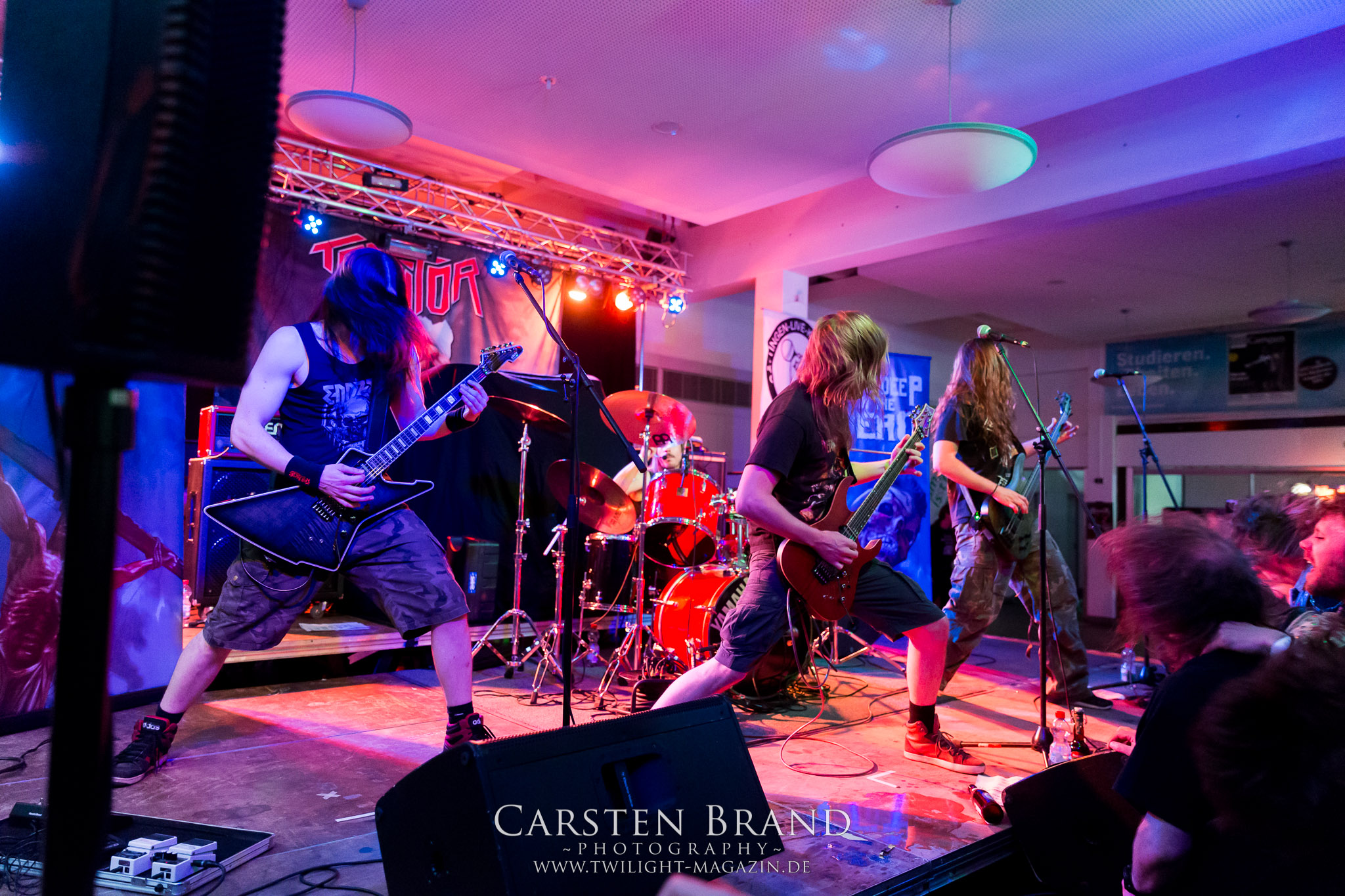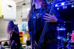 Obwohl die Running Order nach dem Umzug in die Mensa modifiziert und nach hinten verschoben wurde, verspätet sich der Festivalauftakt gehörig. Wenn es läuft, dann halt richtig. REPULSIVE FEAST lassen sich dadurch aber keineswegs aus dem Konzept bringen. Das Trio um Arcane Frost-Aron, Demored-Magnus und Cryptic Brood-Steffen haben einen Hang und Drang für rohen, groben und extrem ranzigen Death Metal mit Grindcore-Attacken, simpel brutal und auf alles Wesentliche reduziert, kraftvoll ohne dabei ins Chaos abzudriften. Leider gleicht die Vocal-Performance von Aron und Magnus über weite Strecken des rund halbstündigen Gigs einer Stummfilm-Einlage. Trotz dieser Soundprobleme weiß das Trio am Nachmittag in einer Location, die trotz aller Mühen der Veranstalter weitgehend frei von Flair und Atmosphäre ist, zu überzeugen und bietet für einen Opener einen schon recht amtlichen Auftakt, der auch vom noch recht überschaubaren Publikum honoriert wird.
