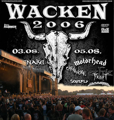 Aborted, Amon Amarth, Atheist, Battlelore, Bloodthorn, Born From Pain, Celtic Frost, Children Of Bodom, D'espairs Ray, Die Apokalyptischen Reiter, Ektomorf, Emperor, End of Green, Finntroll, Gamma Ray, In Extremo, Korpiklaani, Legion of the Damned, Metal Inquisitor, Ministry, Motörhead, MSG, Nevermore, Opeth, Orphaned Land, Primal Fear, Scorpions, Six Feet Under, Soilwork, Subway To Sally, The Dogma, Uli Jon Roth, Victory, Wacken Firefighters, WE, Wintersun